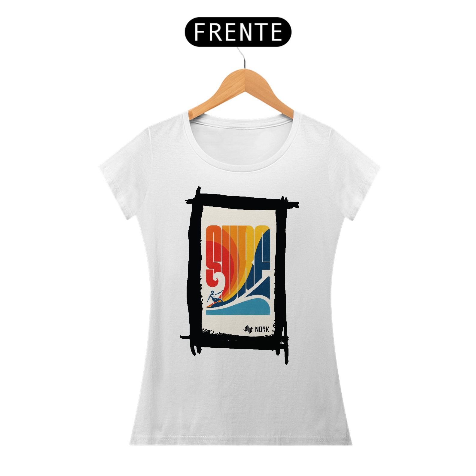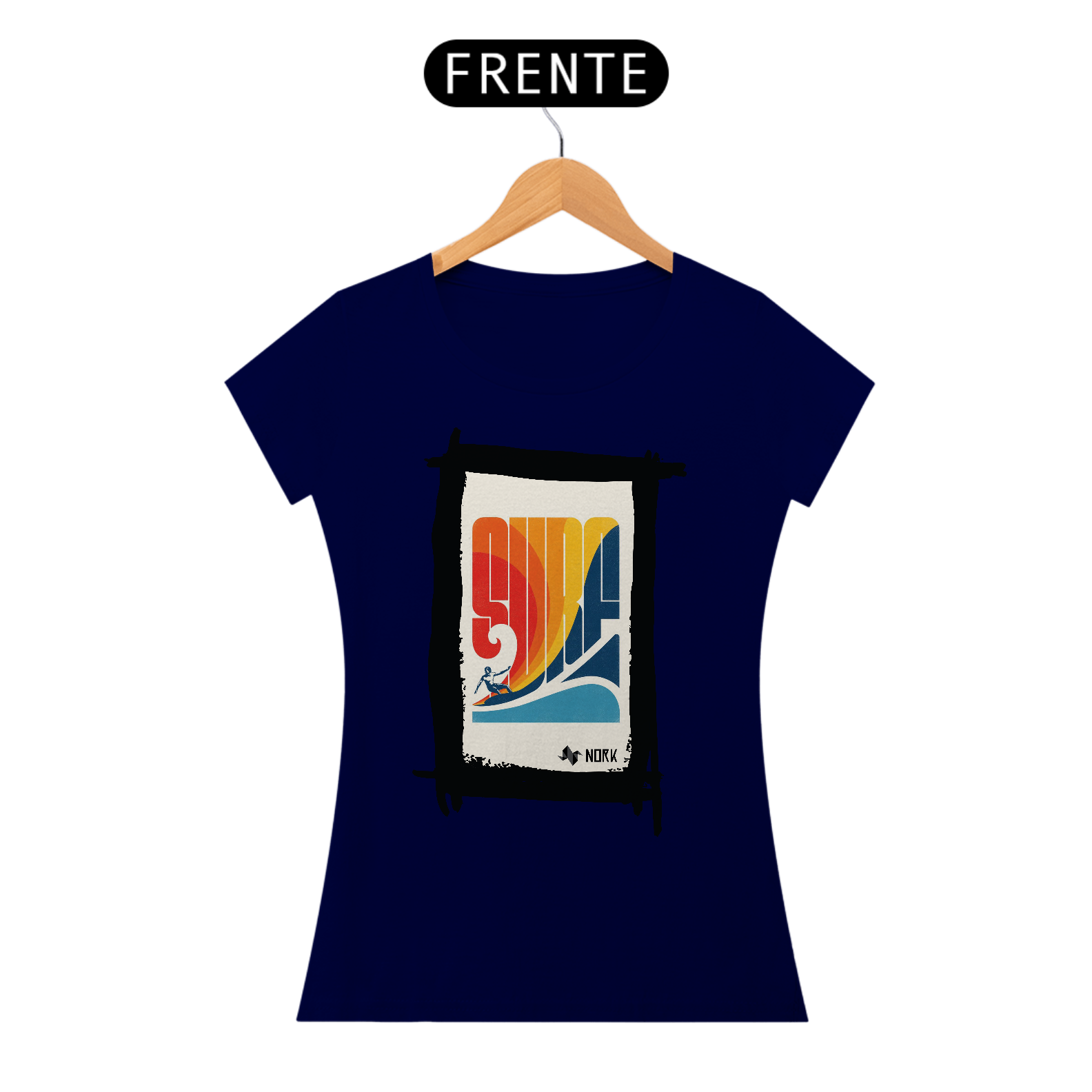 A camisa apresenta uma arte deslumbrante que captura a essência de um pôr do sol tropical, com cores intensas e vibrantes que vão do laranja profundo ao vermelho ardente, criando um contraste marcante com o azul esverdeado do mar. A composição é emoldurada por palmeiras estilizadas em silhueta preta, que adicionam profundidade e uma atmosfera relaxante à cena. Ao fundo, uma montanha escura contrasta com o brilho do sol poente refletido na água, enquanto ondas suaves e detalhadas trazem movimento e vivacidade ao design. O visual exala tranquilidade e uma conexão com a natureza exuberante. O logo da Nork aparece discretamente na parte inferior, preservando a exclusividade da peça.