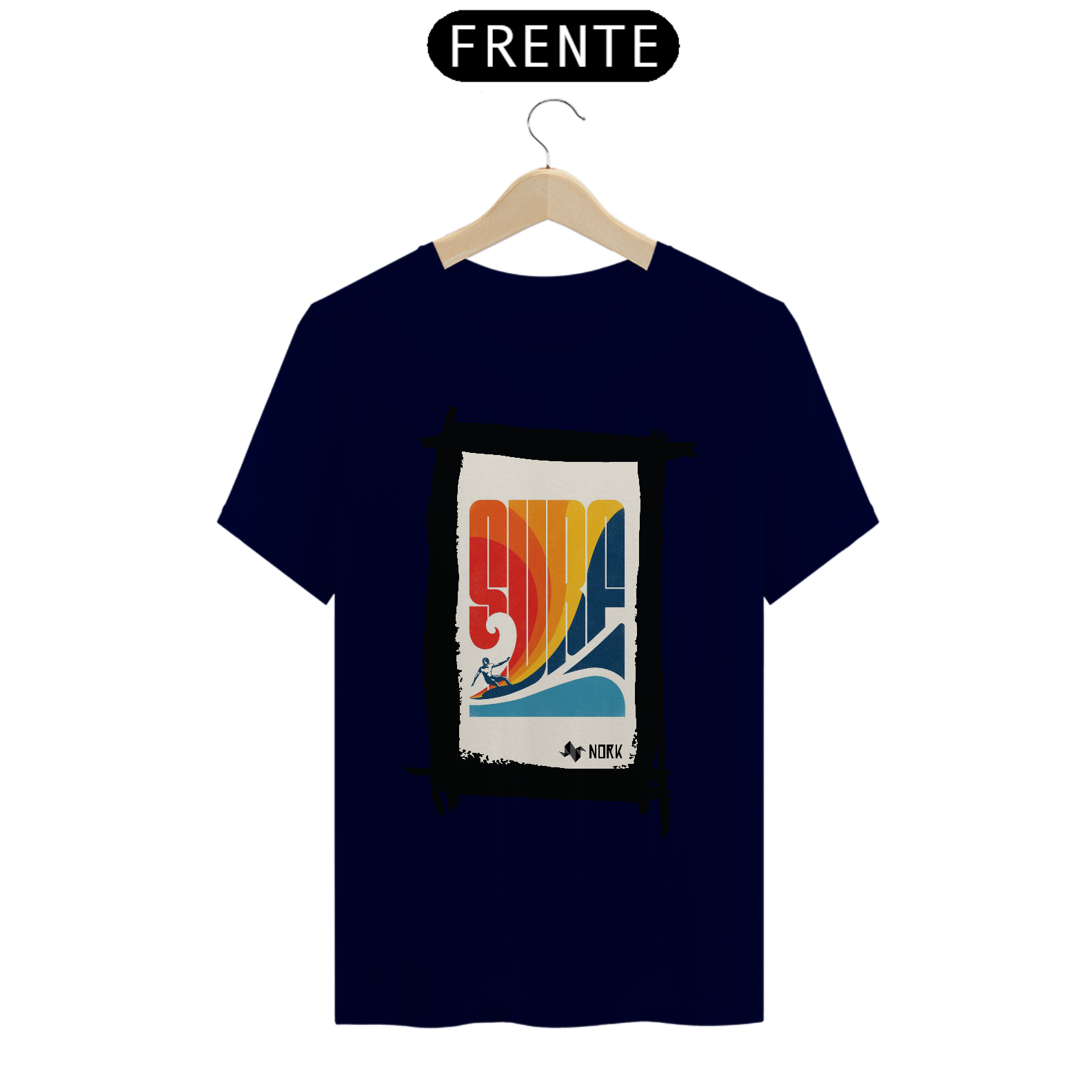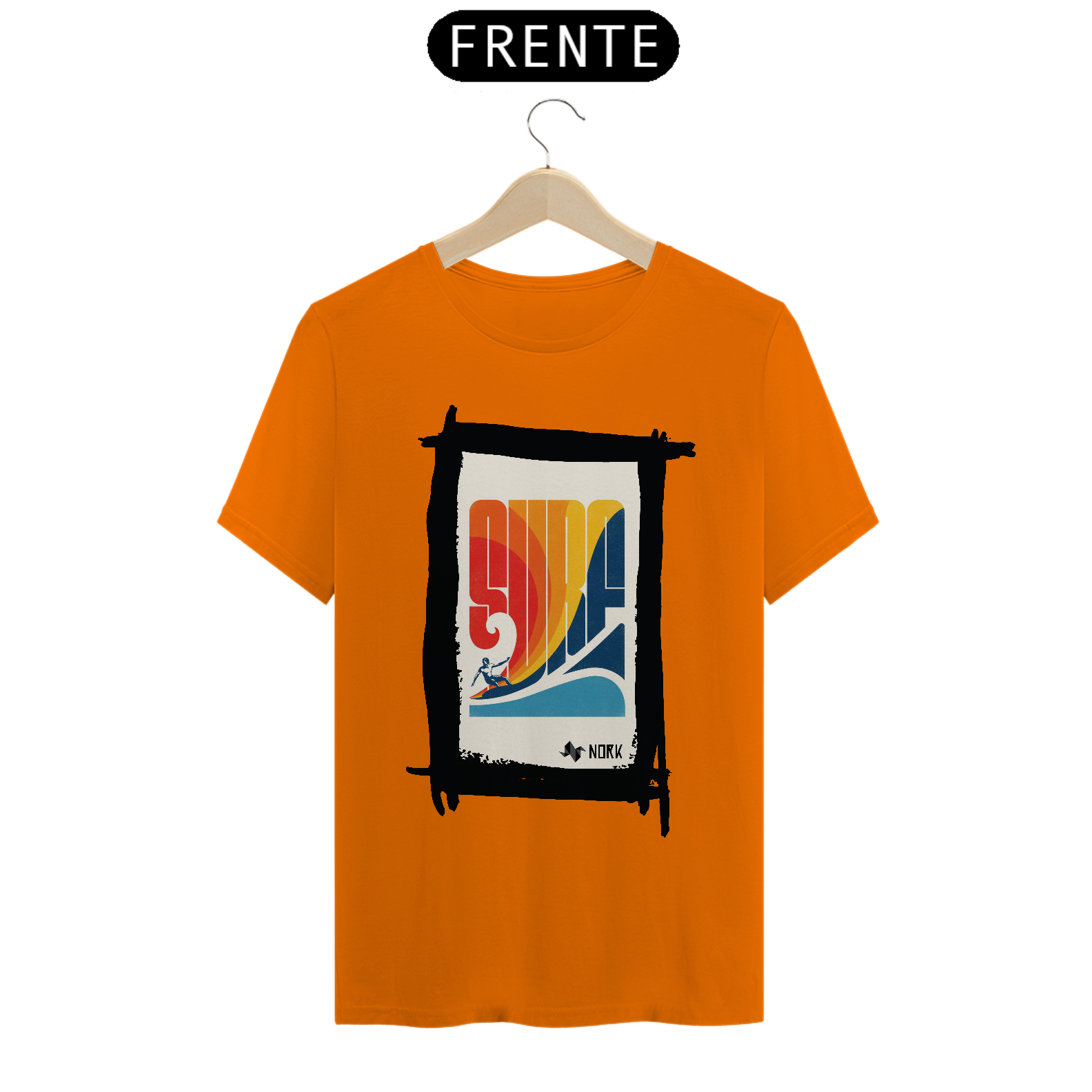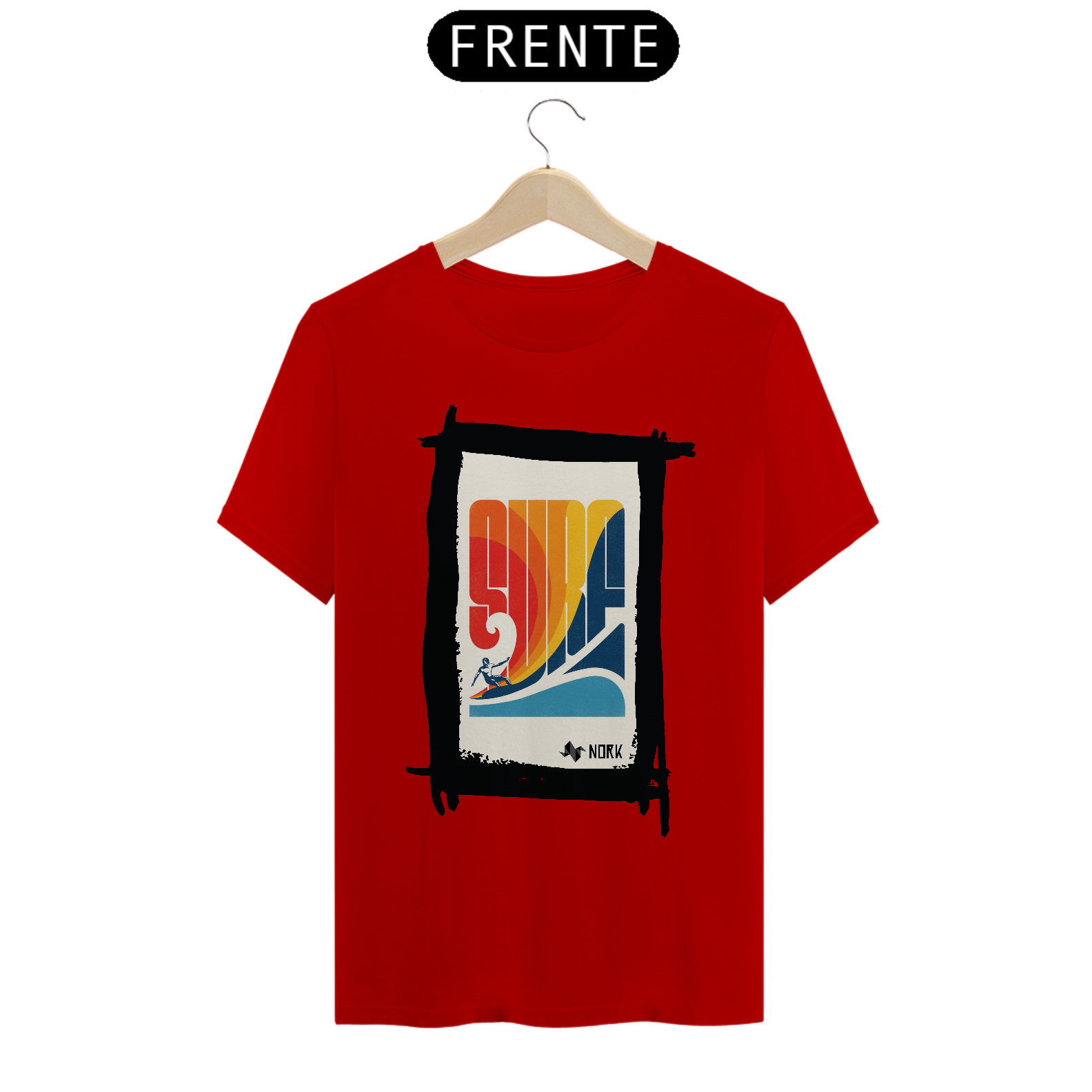 A camisa traz um design retrô vibrante e cheio de energia, capturando o espírito clássico do surfe. A palavra "SURF" é estilizada em letras grandes e geométricas, formando o centro da composição com um degradê em tons quentes de vermelho, laranja e amarelo, que evocam o calor do sol e a energia das ondas. Na parte inferior, um azul profundo representa o oceano, criando um contraste visual equilibrado. A silhueta de um surfista em ação completa o visual, adicionando movimento e dinamismo à peça. O design geral remete à estética vintage dos anos 70, trazendo um toque nostálgico e estiloso. O logo da Nork aparece discretamente na parte inferior, reforçando a autenticidade e exclusividade da peça.