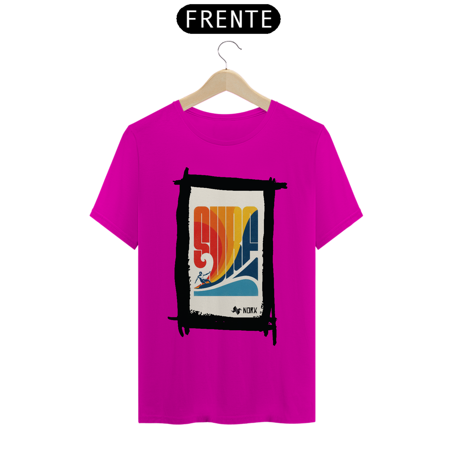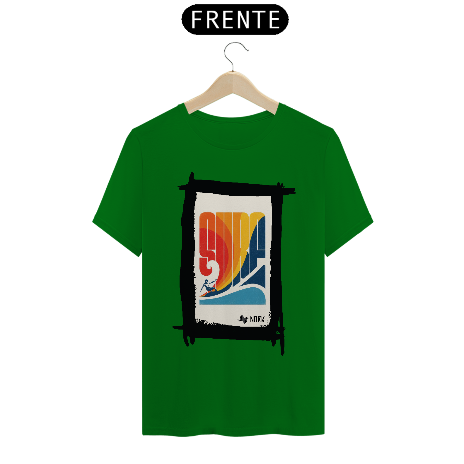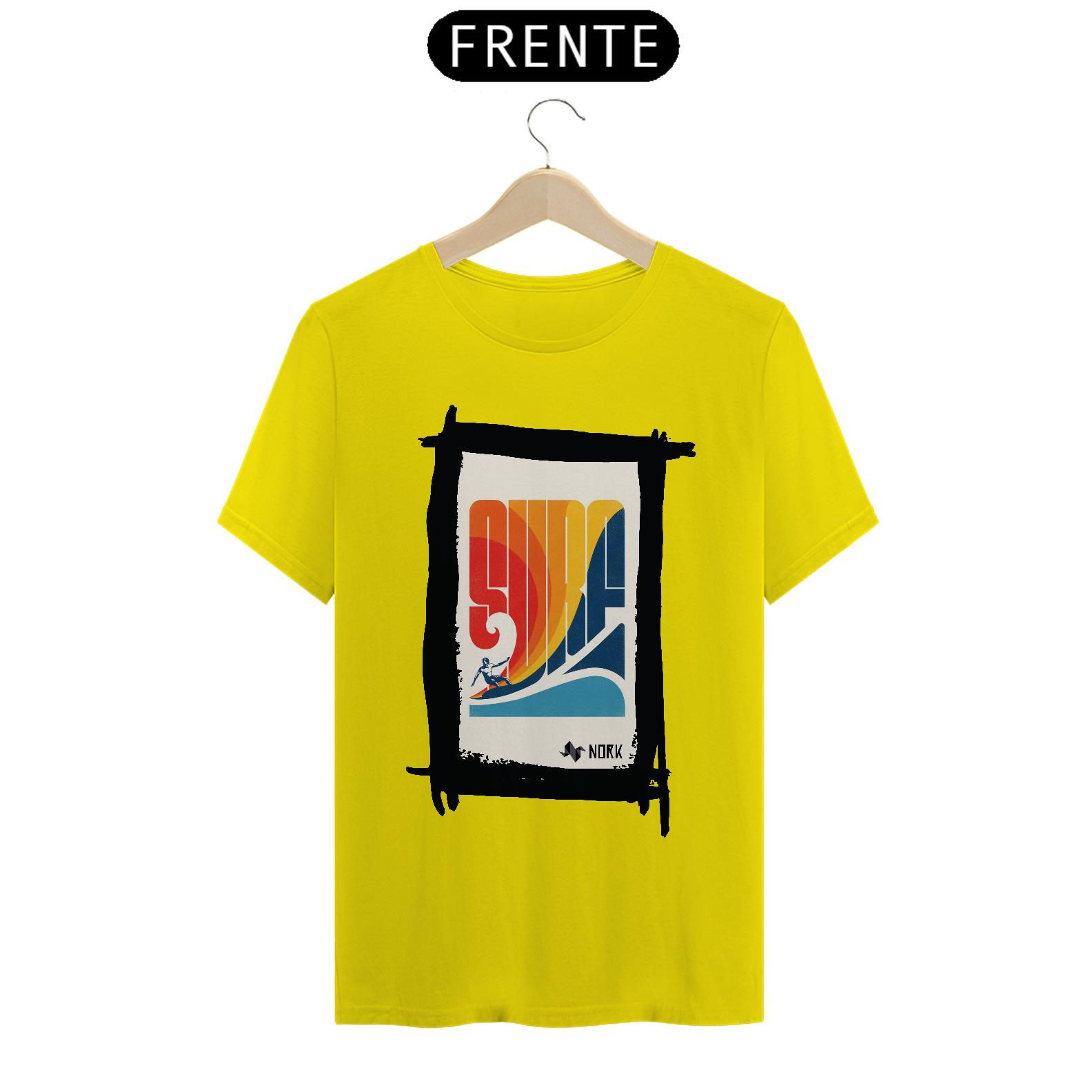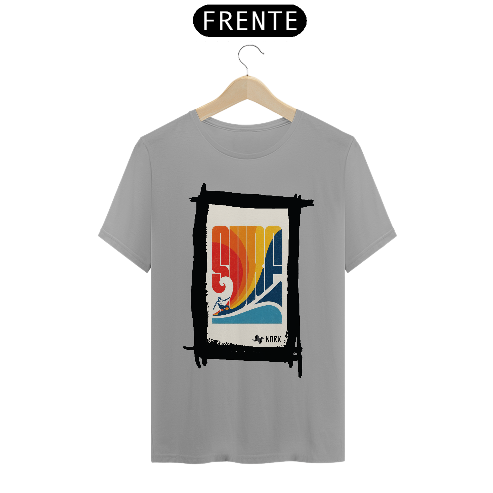 A camisa traz um design retrô vibrante e cheio de energia, capturando o espírito clássico do surfe. A palavra "SURF" é estilizada em letras grandes e geométricas, formando o centro da composição com um degradê em tons quentes de vermelho, laranja e amarelo, que evocam o calor do sol e a energia das ondas. Na parte inferior, um azul profundo representa o oceano, criando um contraste visual equilibrado. A silhueta de um surfista em ação completa o visual, adicionando movimento e dinamismo à peça. O design geral remete à estética vintage dos anos 70, trazendo um toque nostálgico e estiloso. O logo da Nork aparece discretamente na parte inferior, reforçando a autenticidade e exclusividade da peça.