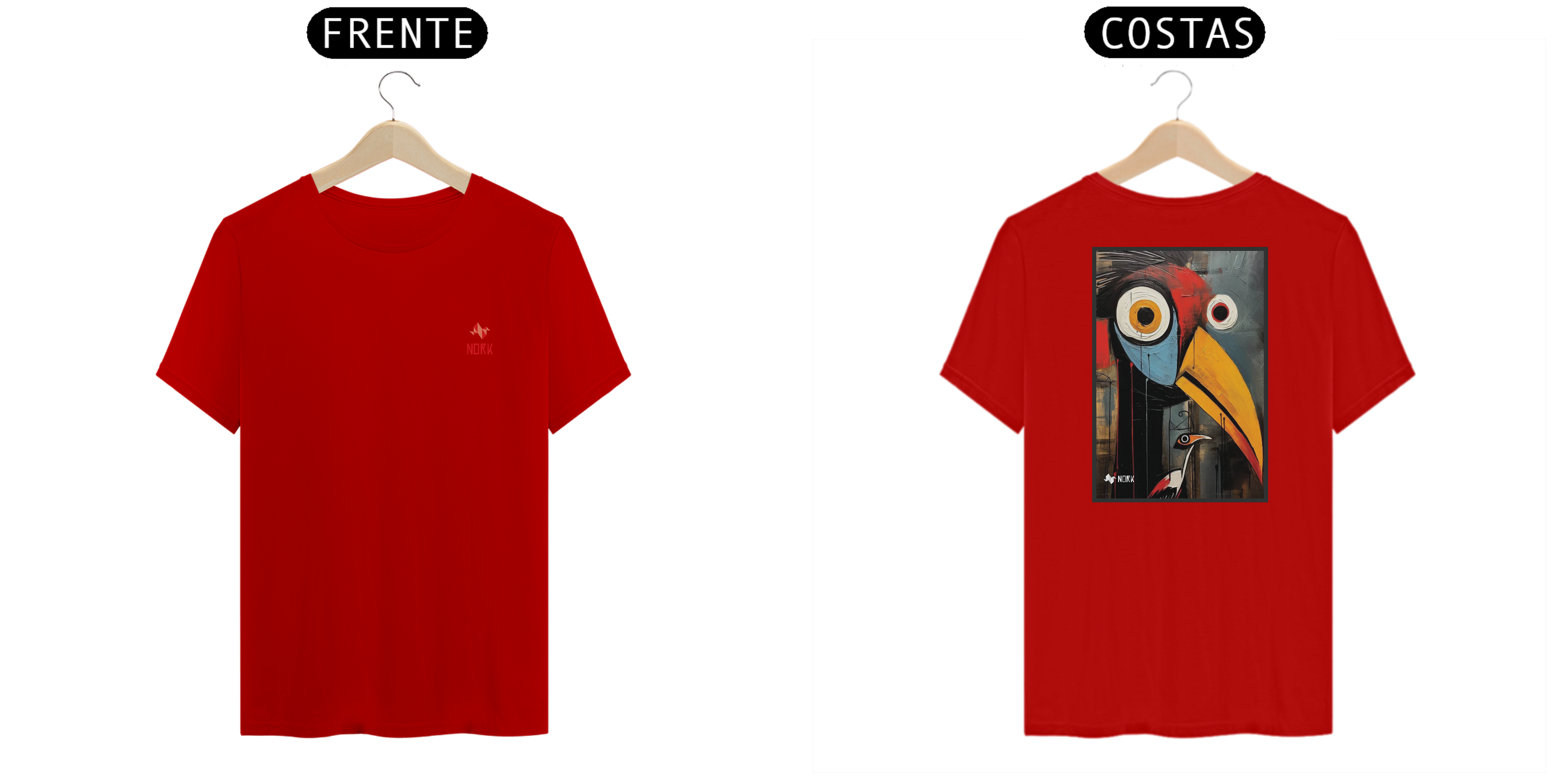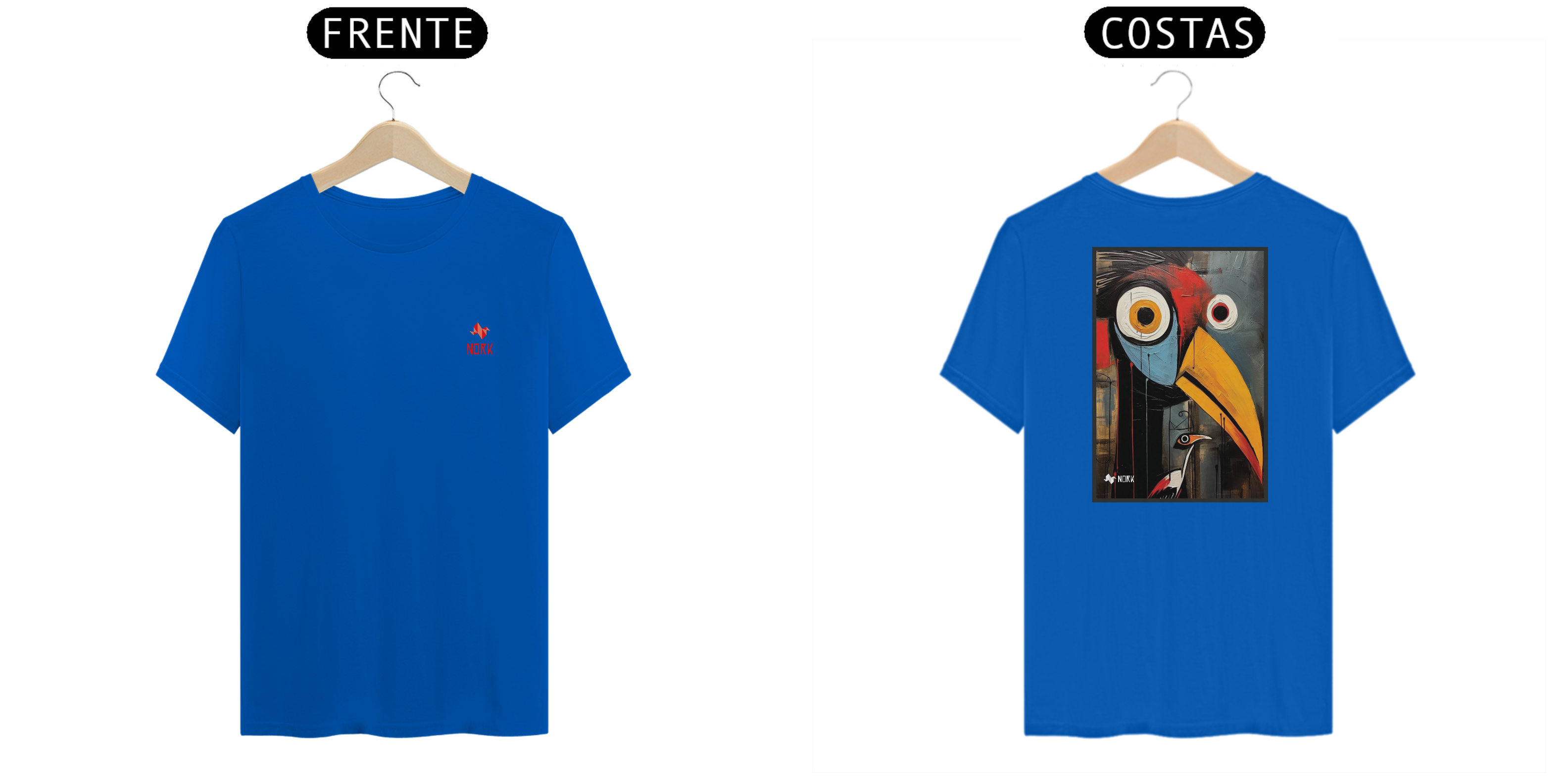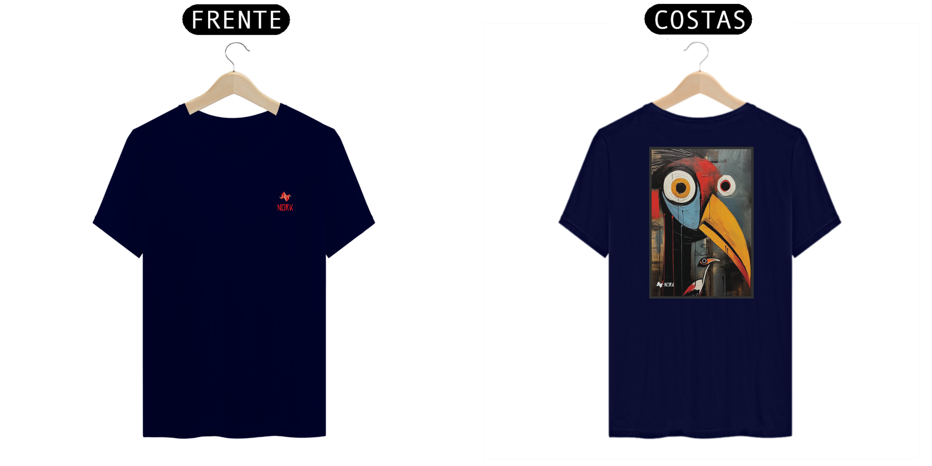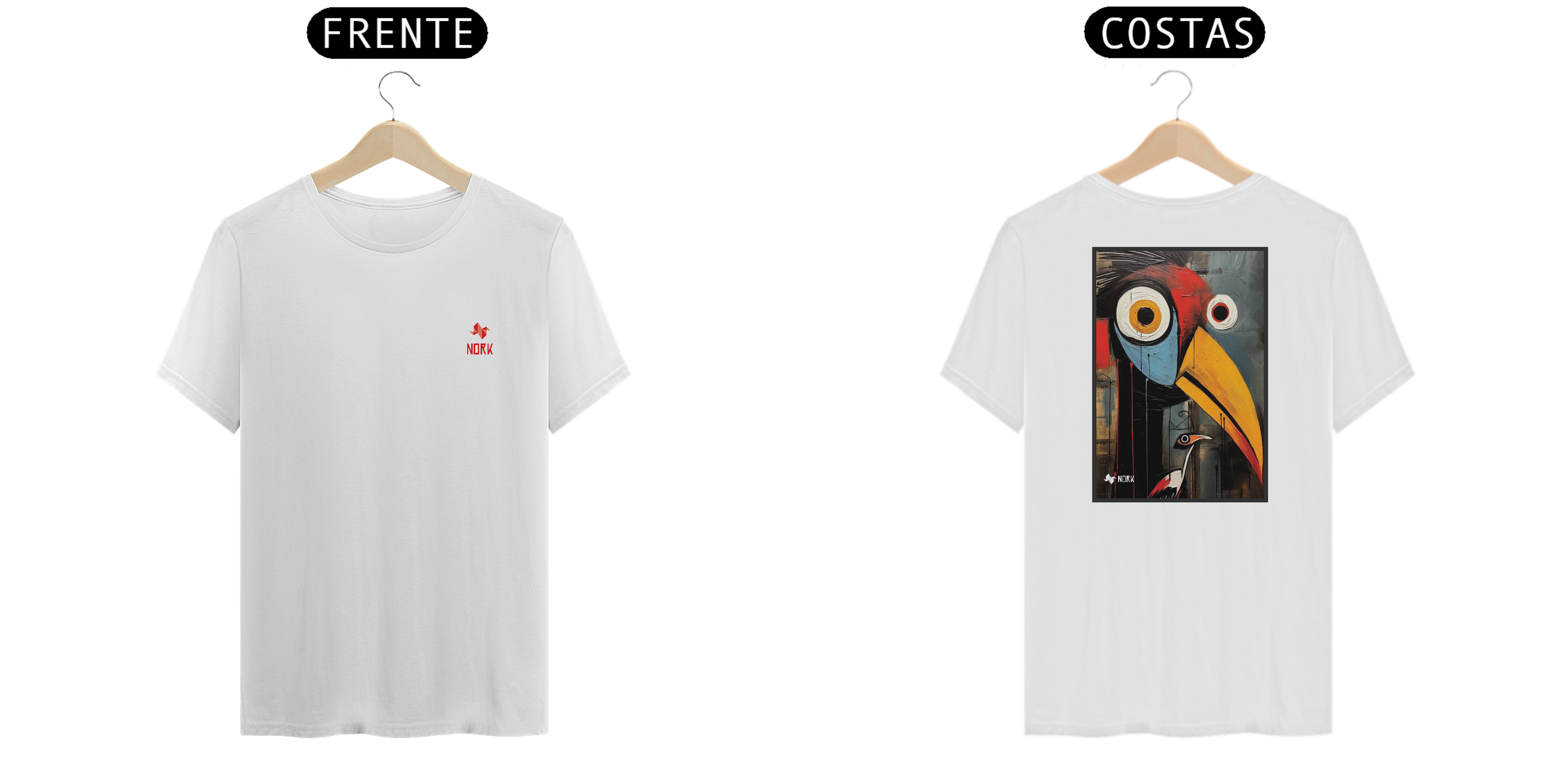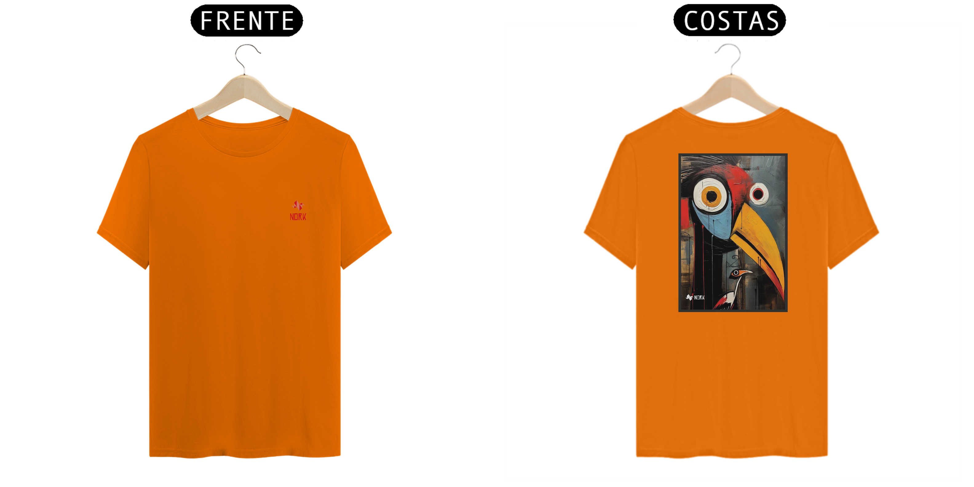 Esta peça criativa da Coleção Nork Animal Planet traz uma interpretação artística de um pássaro grande e outro pequeno, com um design que combina formas geométricas e cores contrastantes. O pássaro maior, com um olho expressivo em amarelo e preto e um bico marcante em amarelo vibrante, domina a composição. O pássaro menor, posicionado na parte inferior, adiciona equilíbrio e uma narrativa visual, criando uma relação intrigante entre as duas figuras. O fundo em tons de cinza e preto, com pinceladas texturizadas e detalhes em vermelho, destaca ainda mais os elementos coloridos e dá profundidade à arte.