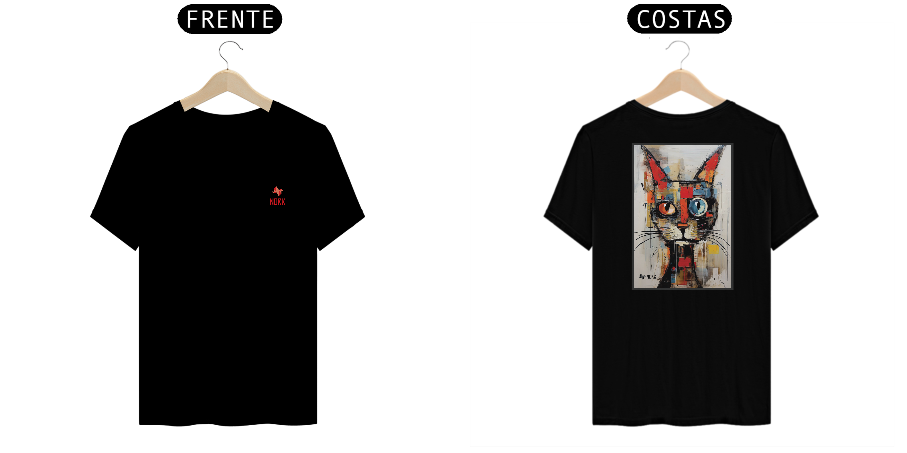 Esta camisa da Coleção Nork Animal Planet apresenta uma representação moderna e abstrata de um gato, com uma combinação impressionante de formas geométricas e pinceladas soltas. O design captura a essência felina com um equilíbrio entre sofisticação e criatividade, destacando olhos de cores distintas: um vibrante azul e outro em um tom quente de laranja. O uso de cores como vermelho, amarelo e azul se mistura ao fundo neutro, criando uma composição harmoniosa e cativante. As orelhas e os bigodes alongados adicionam um toque expressivo e elegante à arte.