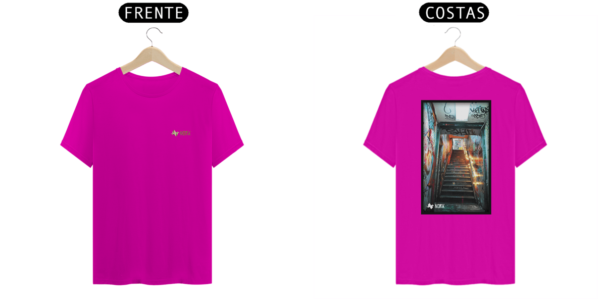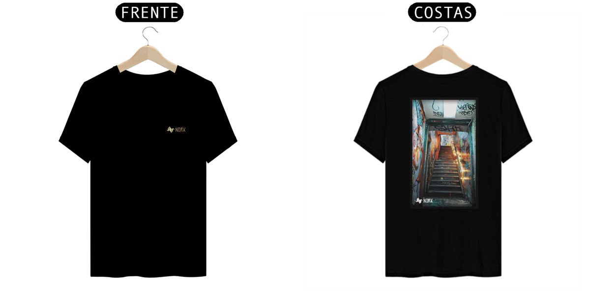 Essa camisa traz uma estampa que captura a essência do ambiente urbano, destacando uma escadaria grafitada repleta de personalidade e histórias. As paredes laterais estão completamente preenchidas por cores vibrantes e tags criativas, em uma composição que mistura azul, rosa, laranja e preto. No corrimão, pequenas luzes penduradas criam um contraste delicado e caloroso, iluminando os degraus marcados por frases e desenhos.