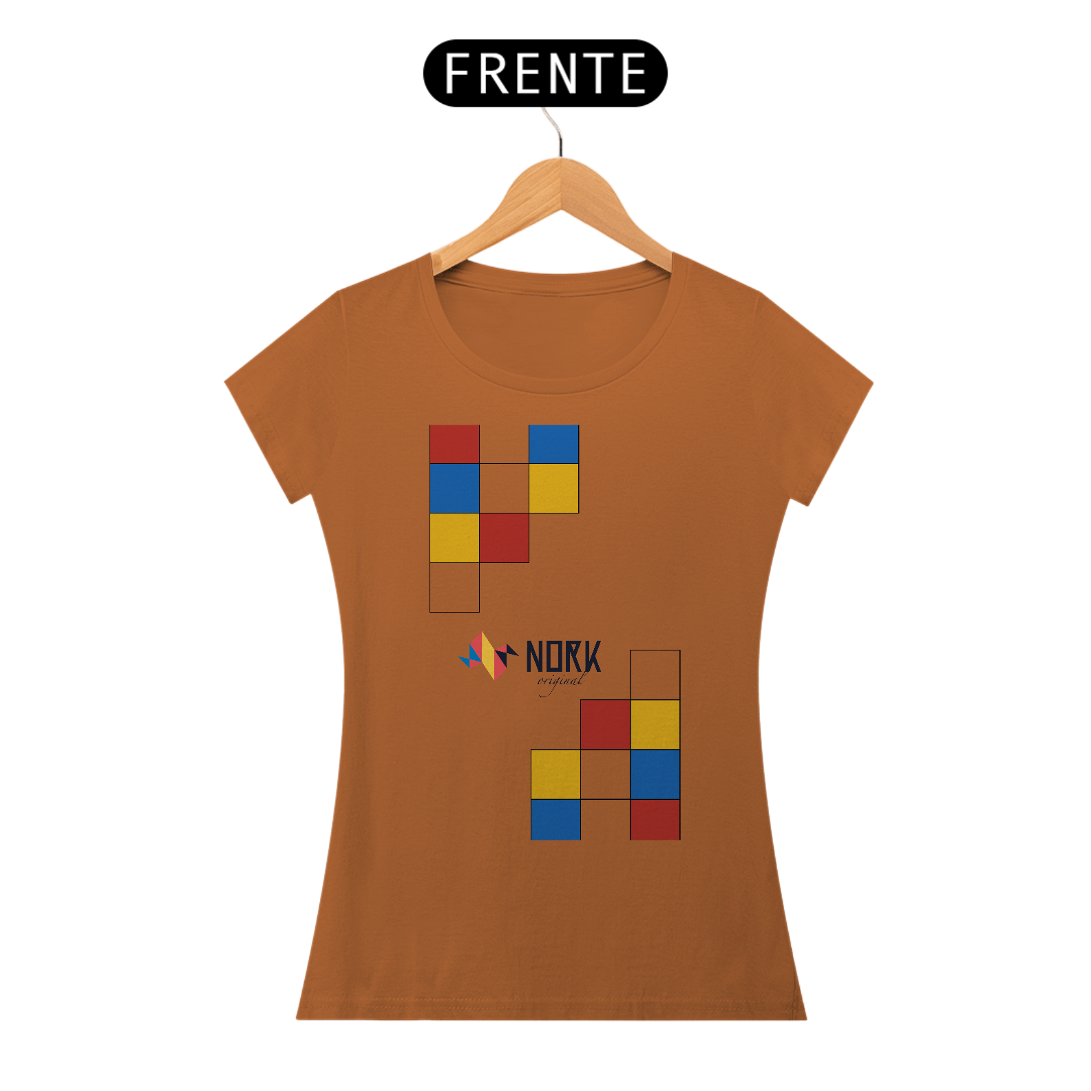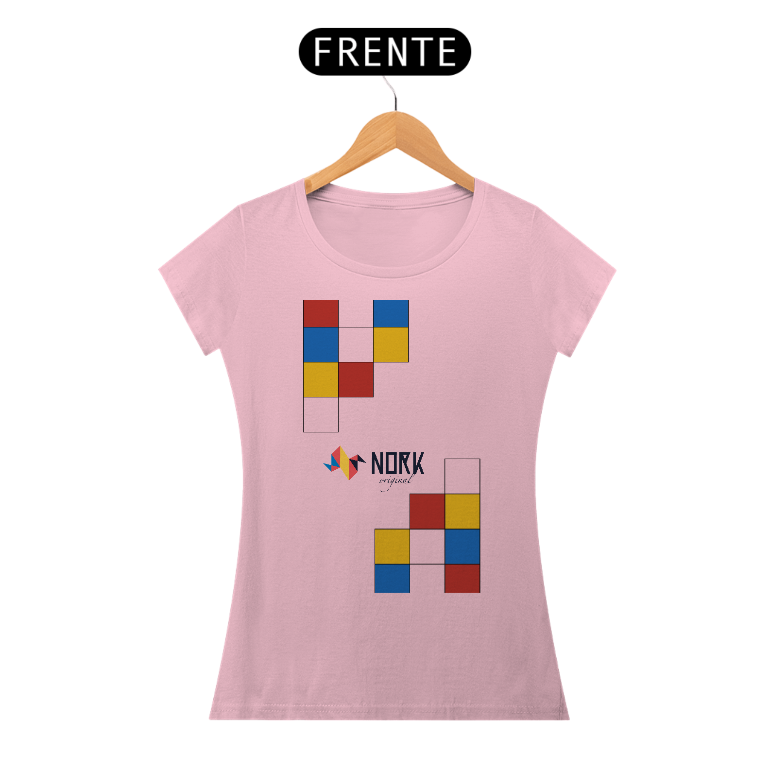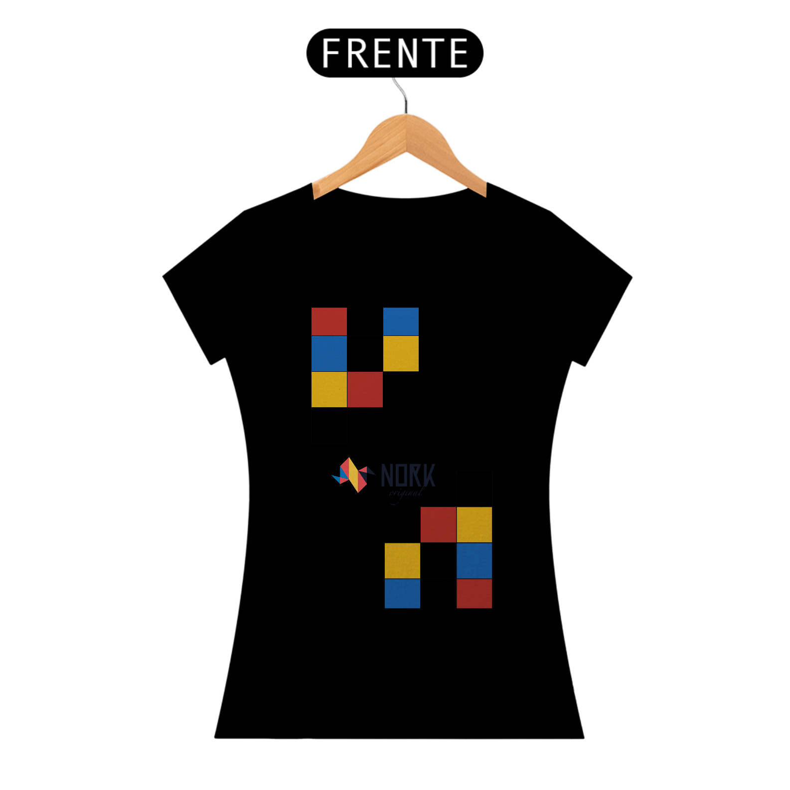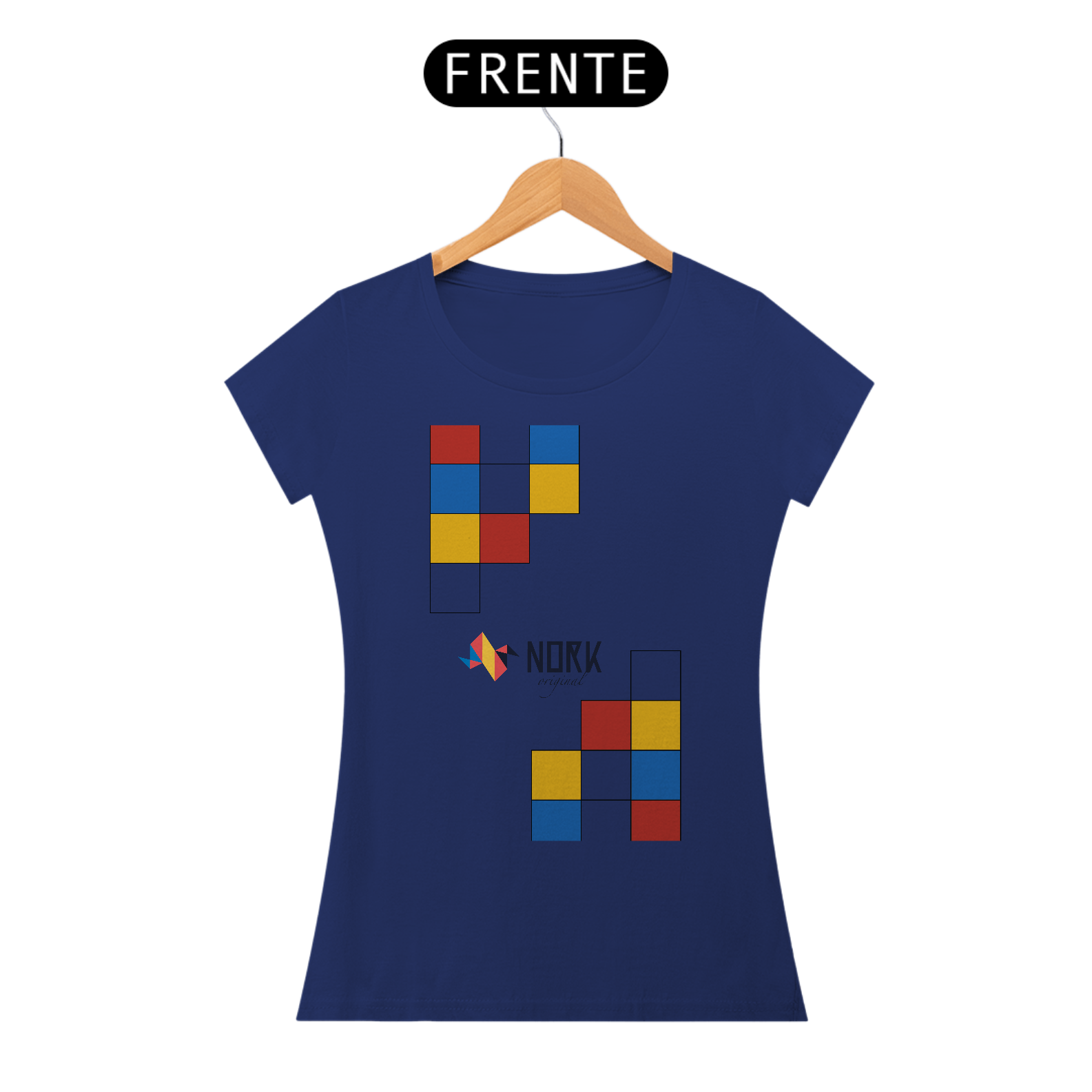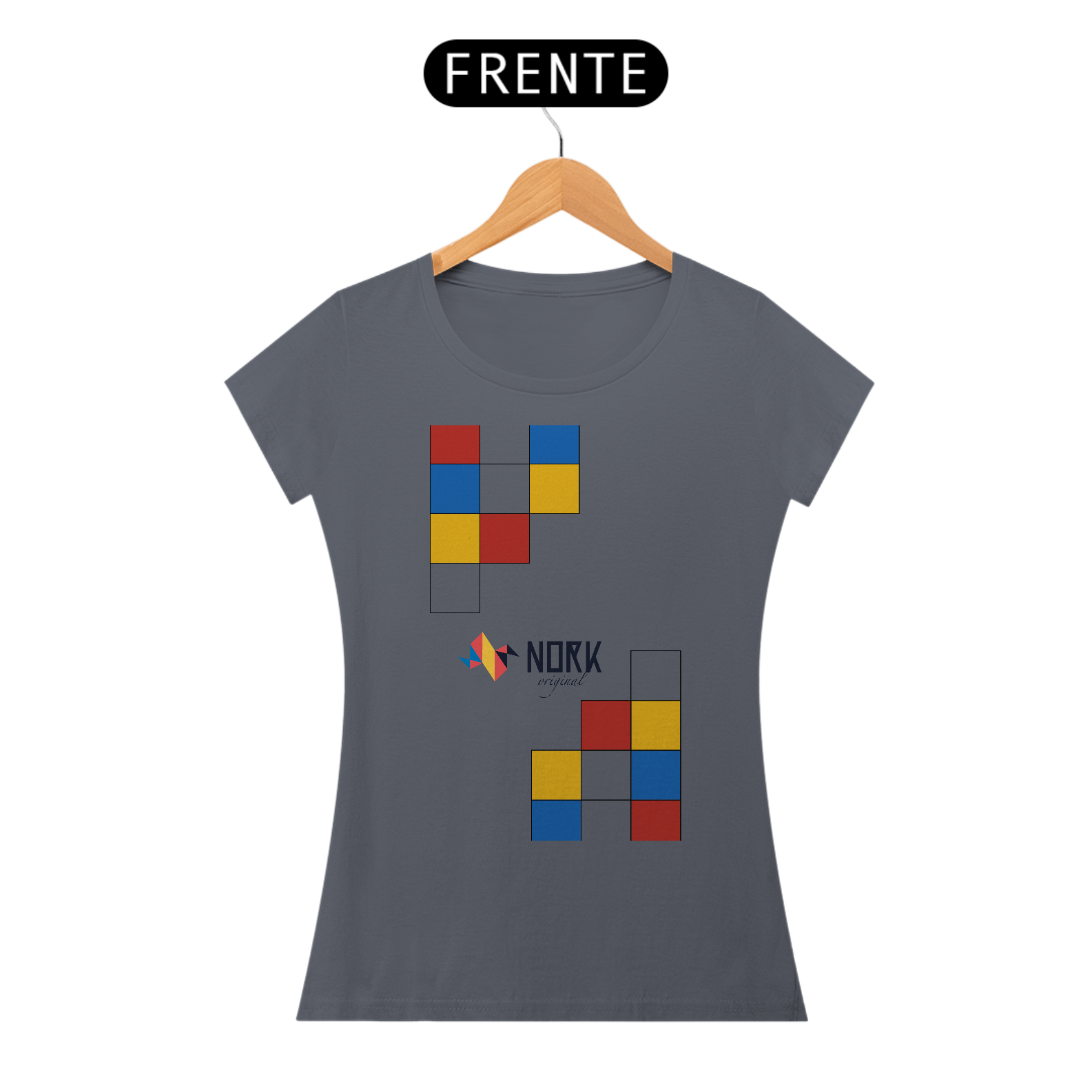 A disposição dos blocos sugere modularidade e movimento, lembrando estruturas lúdicas que combinam forma e cor de maneira instigante. Perfeita para quem busca simplicidade elegante e personalidade, esta peça leva a essência Bauhaus de maneira marcante, destacando a assinatura Nork Original no centro da composição.