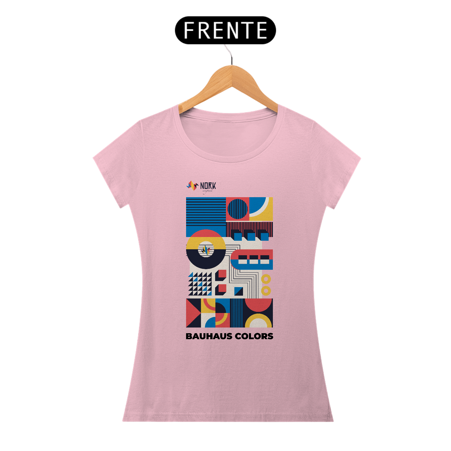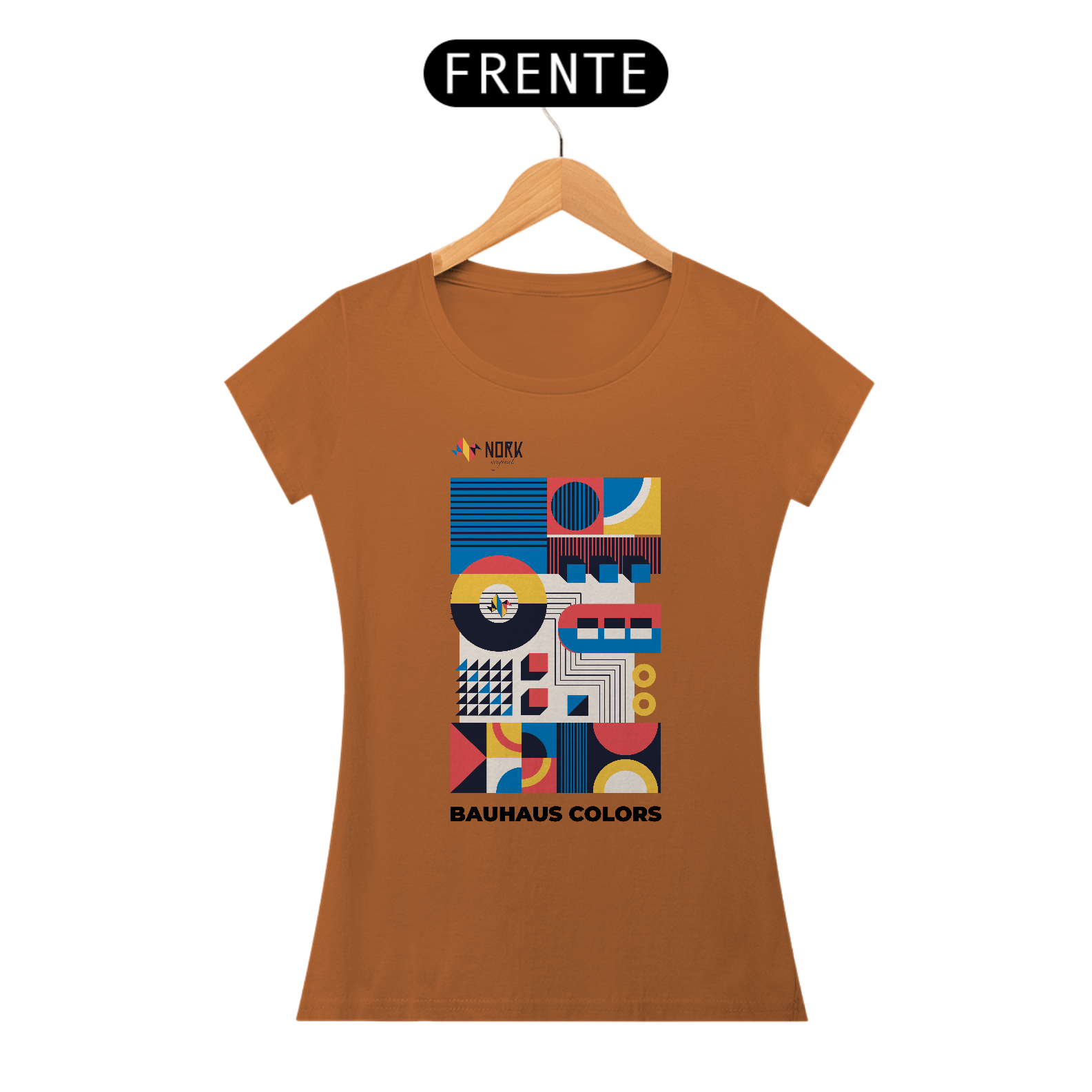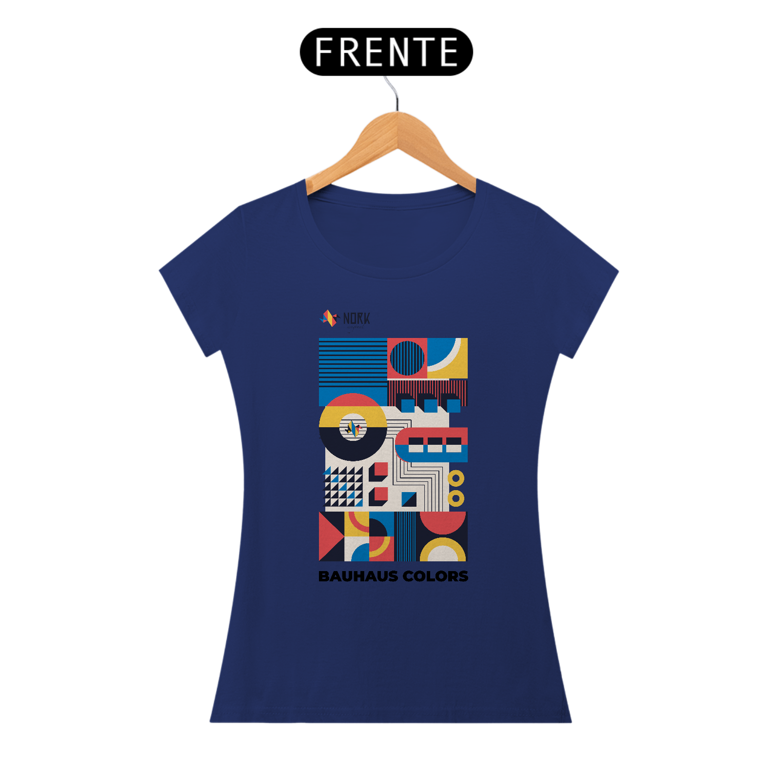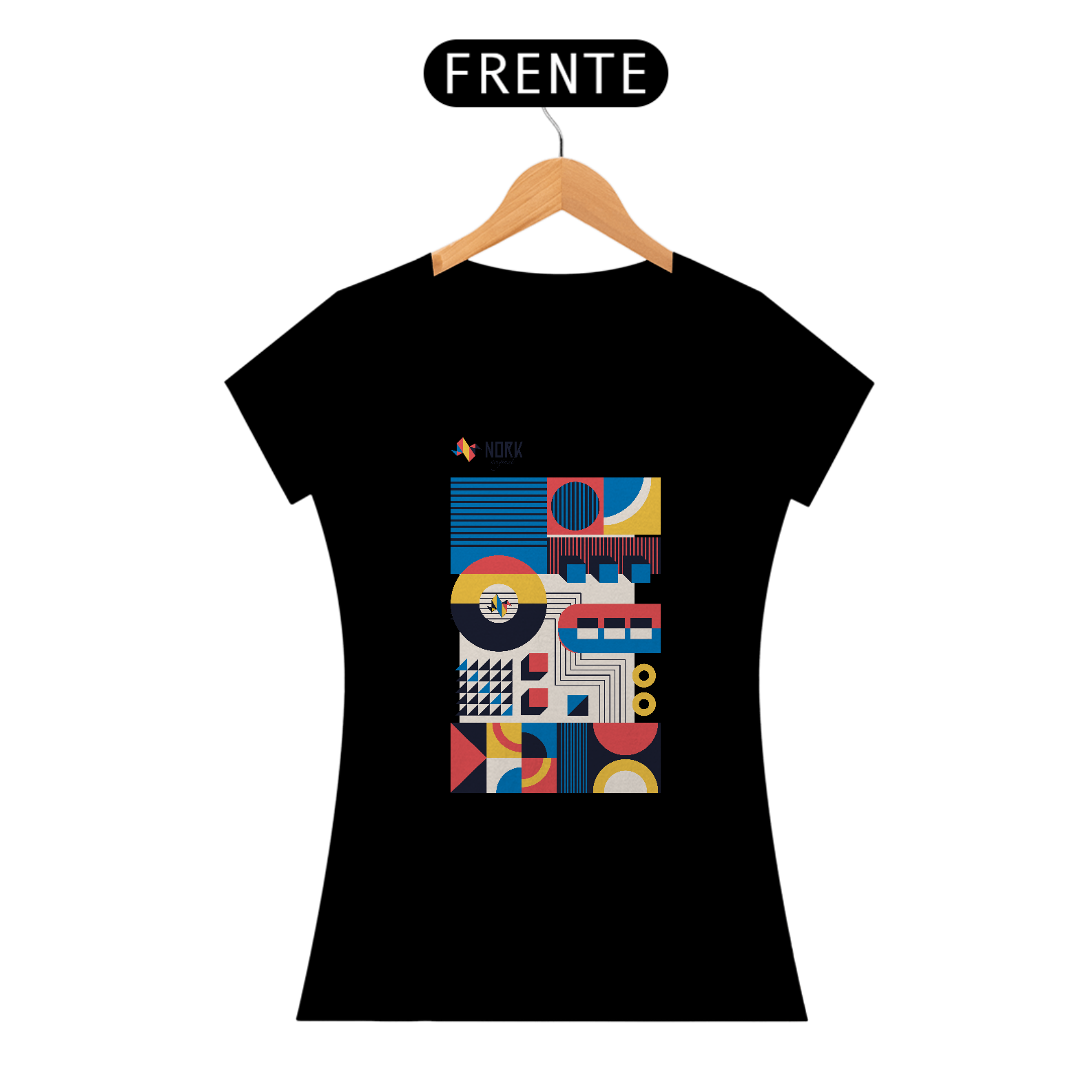 Os elementos dispostos em camadas evocam a ideia de tecnologia e conectividade, enquanto o logotipo Nork aparece inserido em um círculo ao centro, destacando a identidade da marca. Perfeita para quem valoriza design autoral e expressividade, esta peça traduz a união da tradição modernista com um toque contemporâneo.
