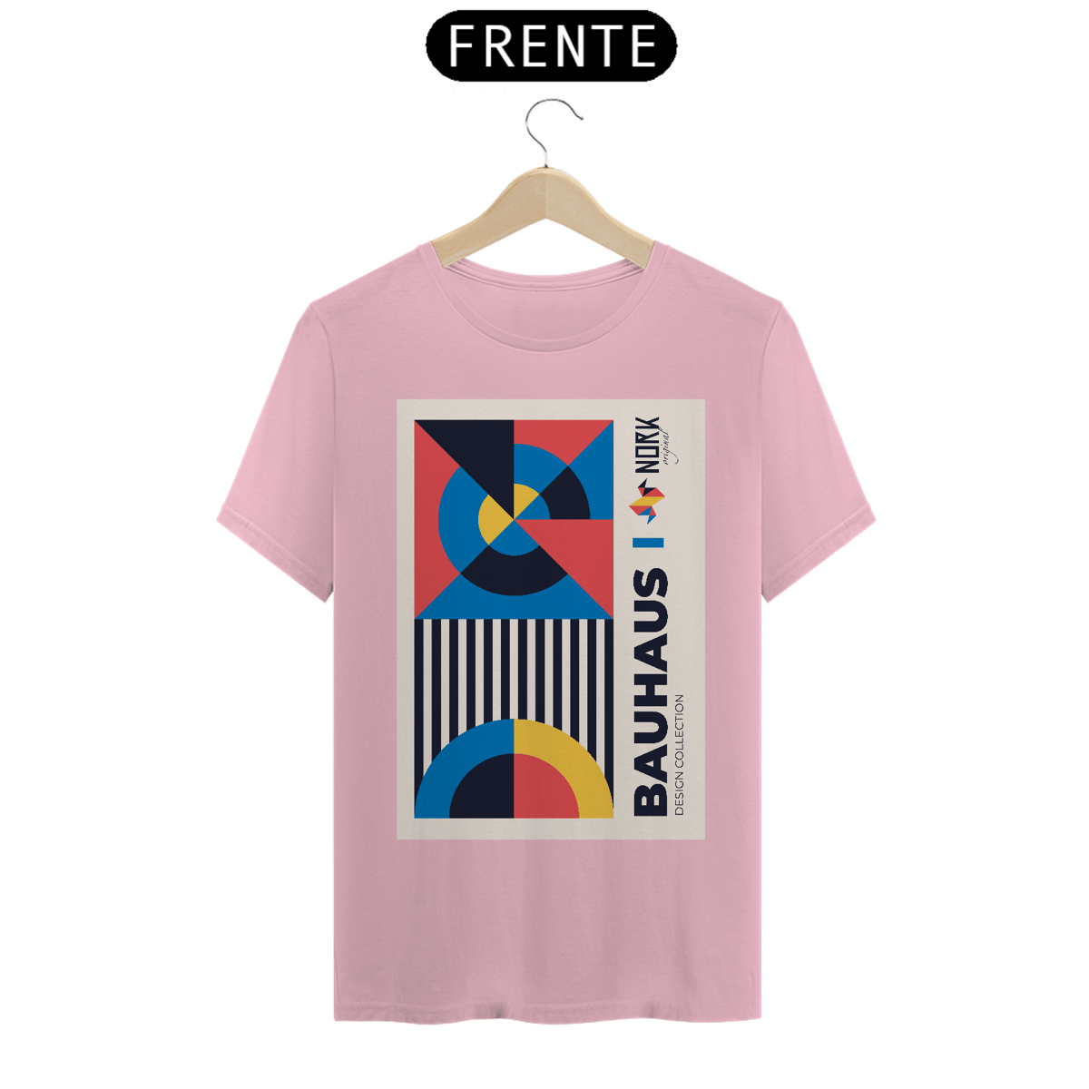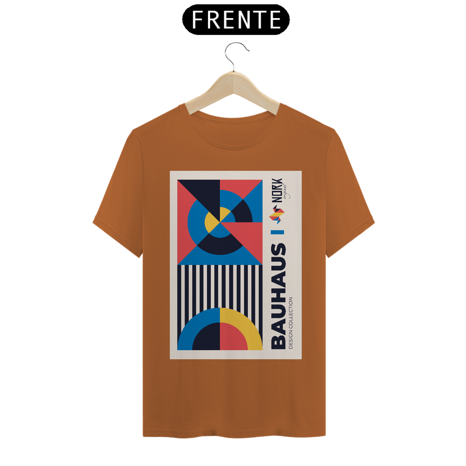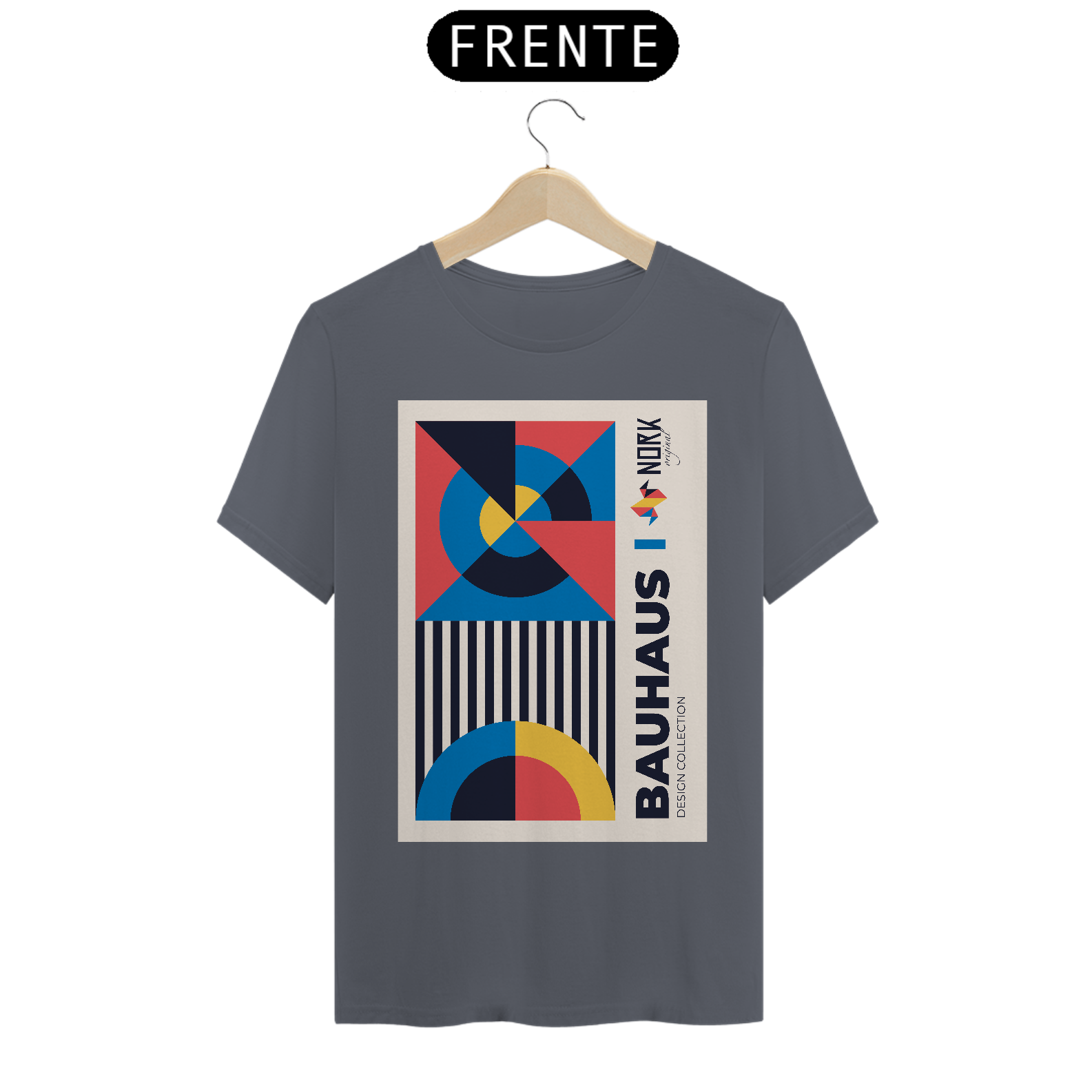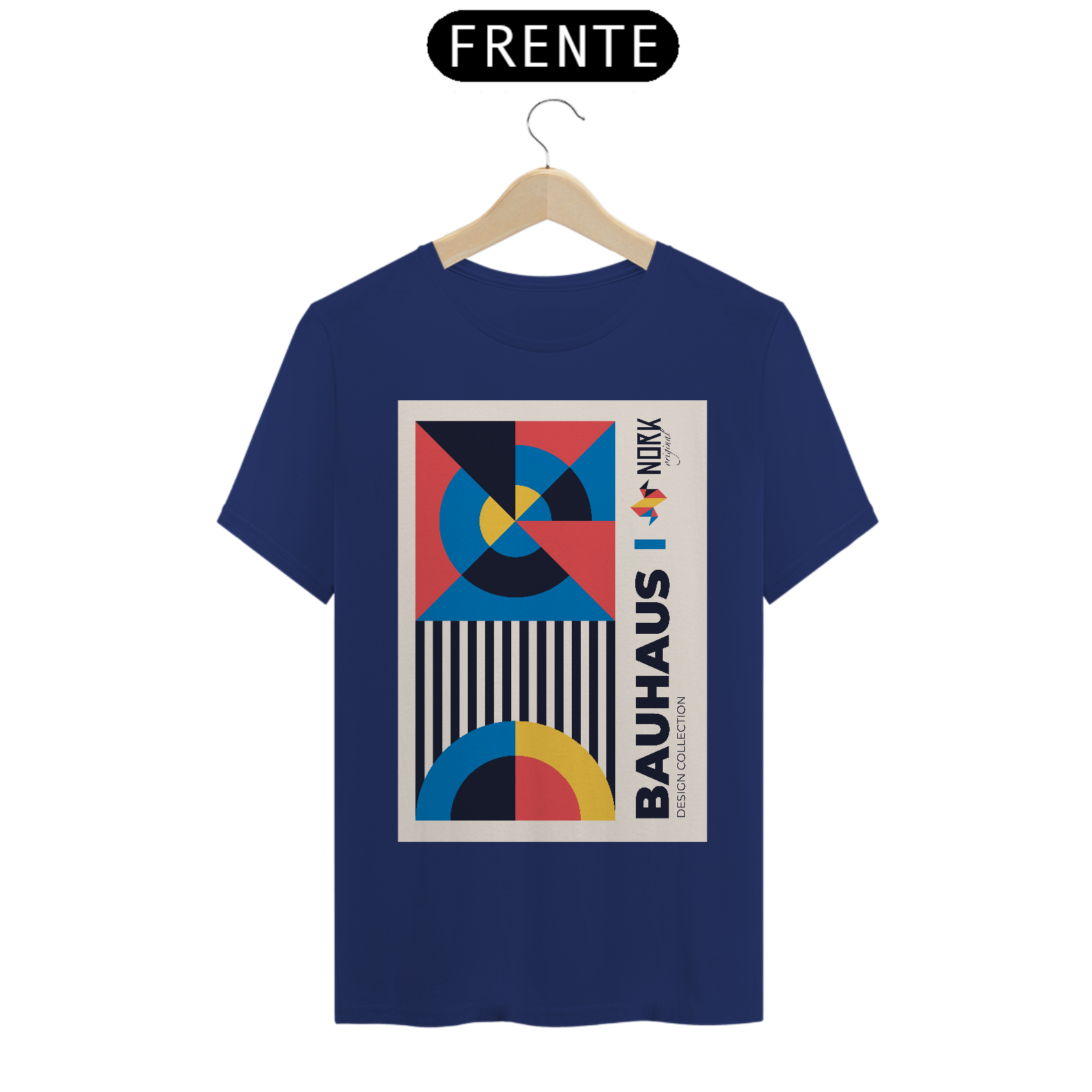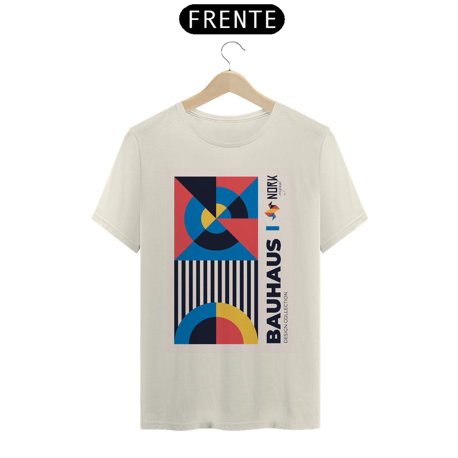 Esta camisa marcante da Coleção Nork Bauhaus destaca-se pela composição de formas geométricas em diferentes proporções, remetendo à essência inovadora do movimento que redefiniu o design moderno. No painel superior, um círculo seccionado em azul, vermelho, amarelo e preto cria um efeito de sobreposição, enquanto a parte central traz faixas verticais contrastantes, evocando um ar de modernidade urbana. A meia-lua colorida na base, dividida em blocos, reforça a ideia de equilíbrio e dinamismo, elementos centrais do universo Bauhaus.
