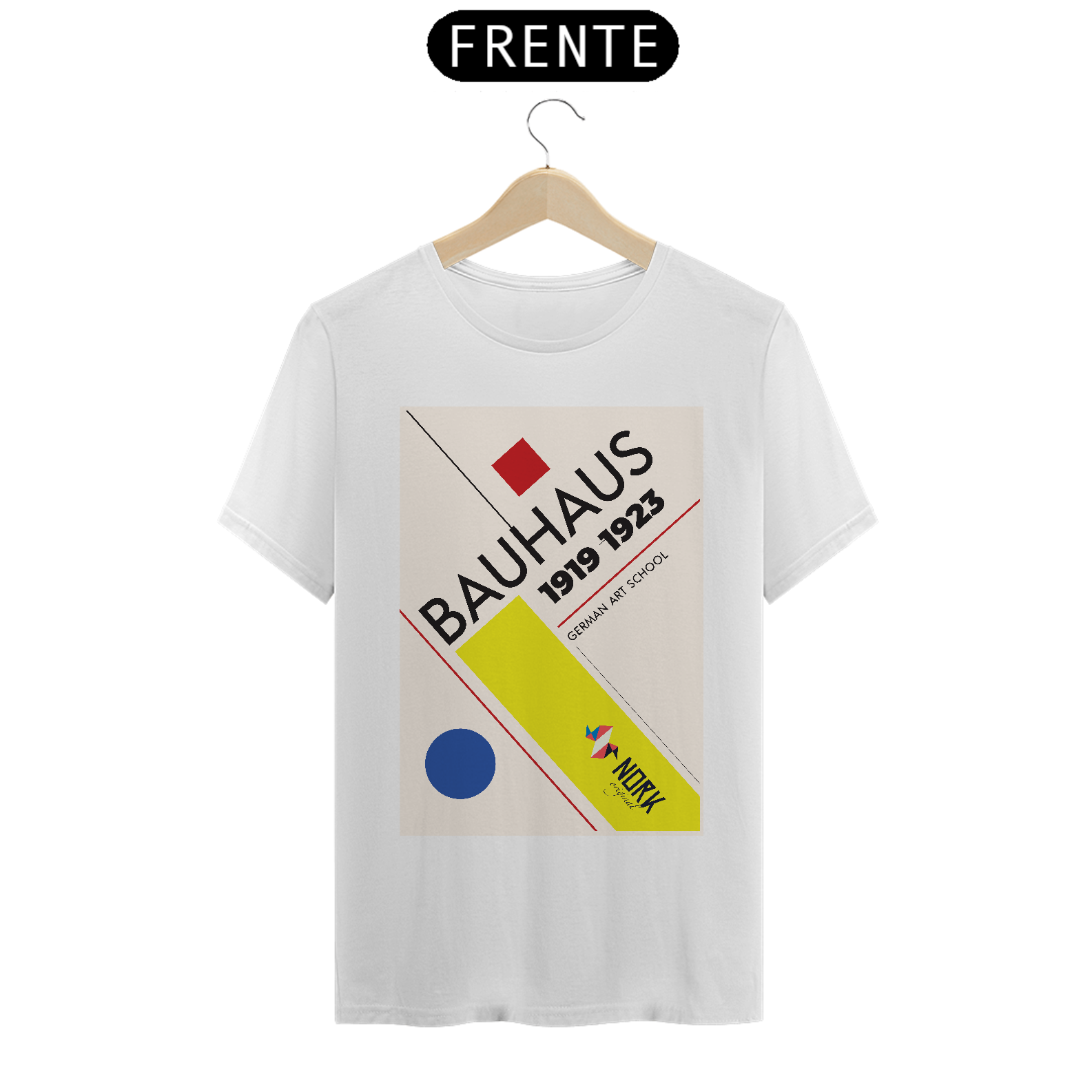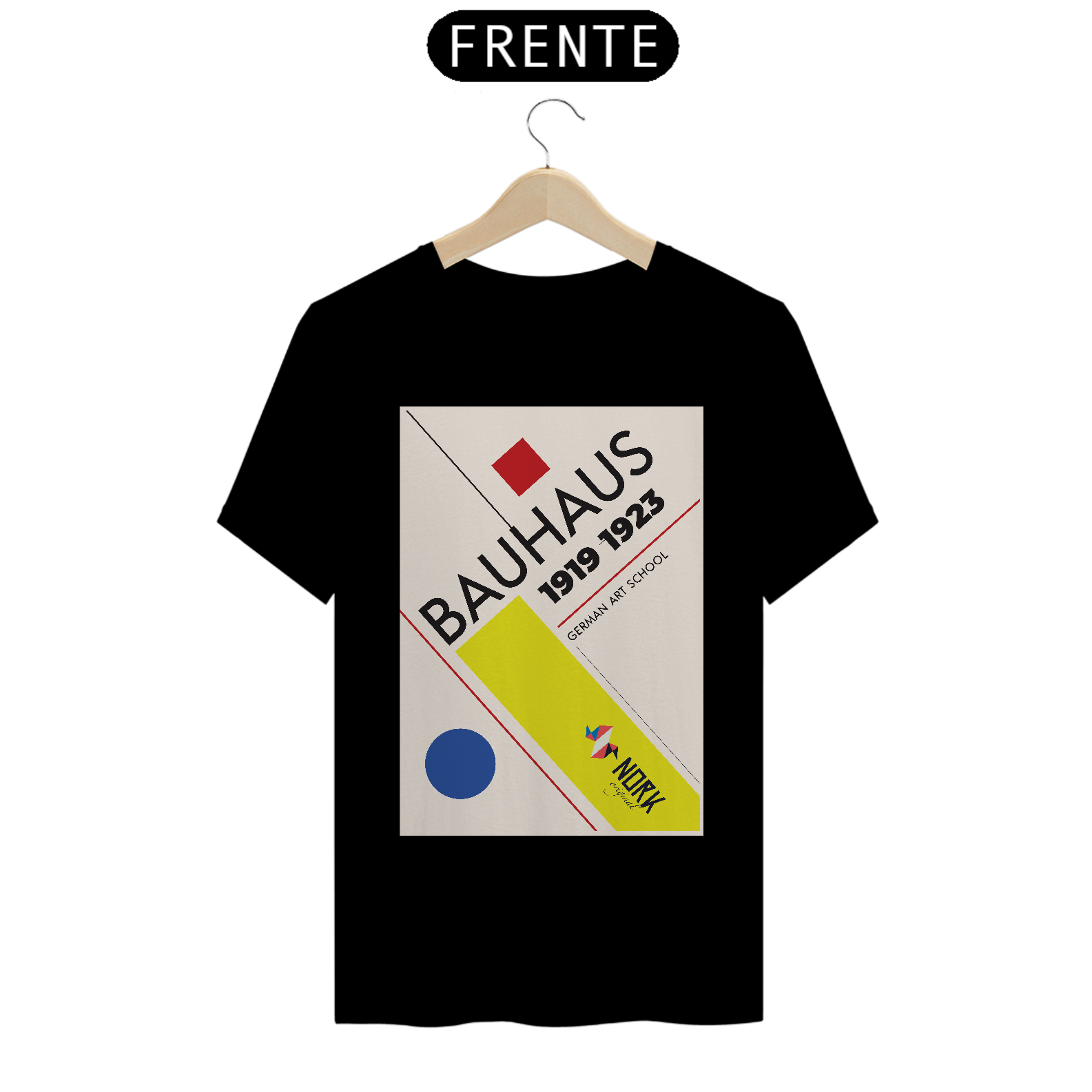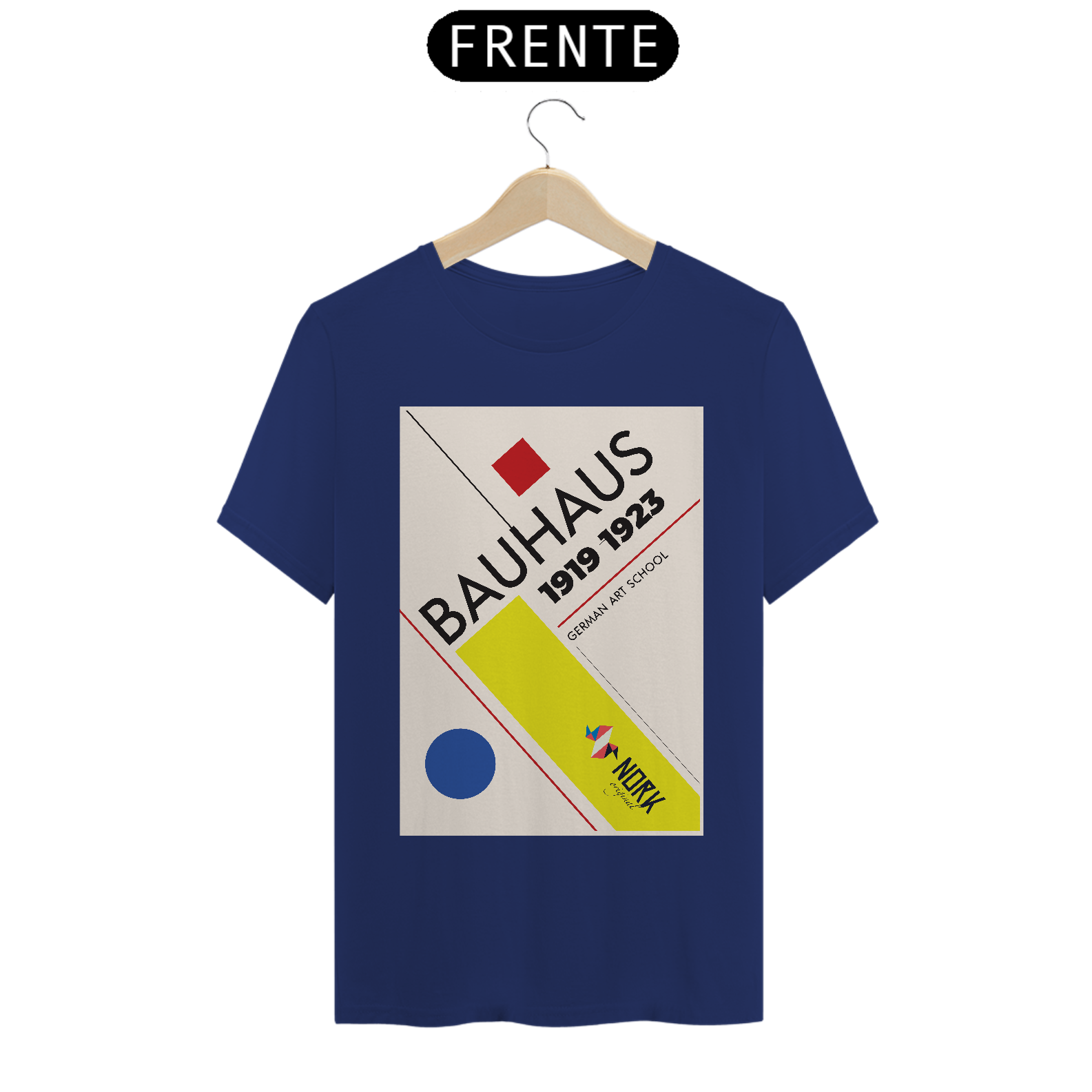 Esta camisa marcante da Coleção Nork Bauhaus evidencia a essência minimalista e icônica do movimento que transformou o design moderno. Linhas diagonais, um círculo azul, um quadrado vermelho e o bloco amarelo central desenham um layout dinâmico, enquanto as inscrições “1919 - 1923” e “German Art School” homenageiam o período e a origem da Bauhaus. A disposição dos elementos em ângulos distintos transmite a ideia de movimento e inovação, evocando a fusão entre arte e funcionalidade.