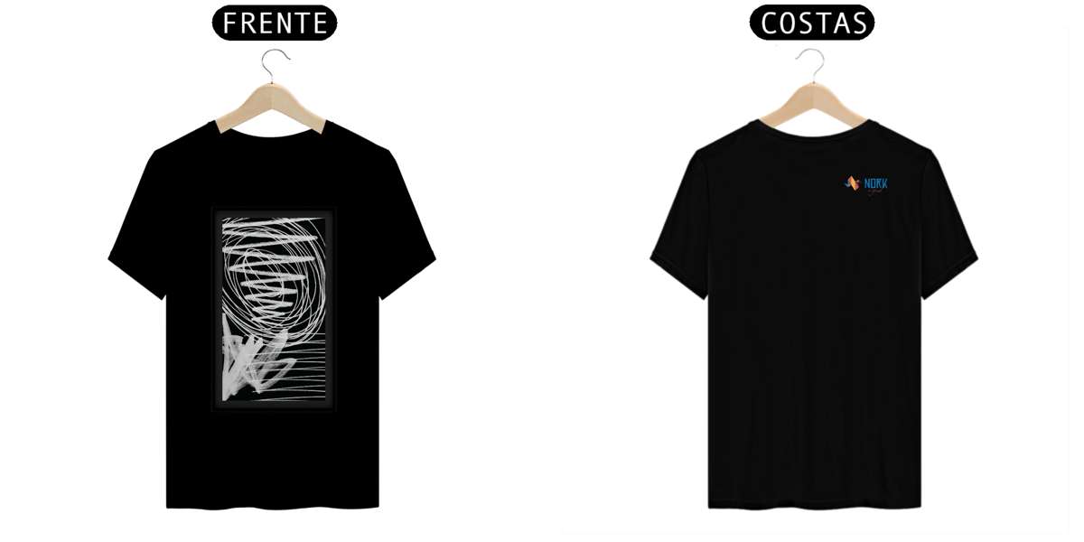 Esta camisa da Coleção Nork Original Terapia apresenta um design abstrato composto por espirais, linhas retas e formas preenchidas em branco sobre um fundo preto. Inspirada na "terapia do rabiscar", a arte transmite uma sensação de movimento e liberdade, refletindo a espontaneidade dos traços feitos à mão.