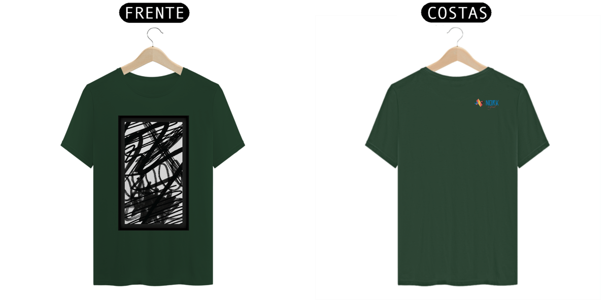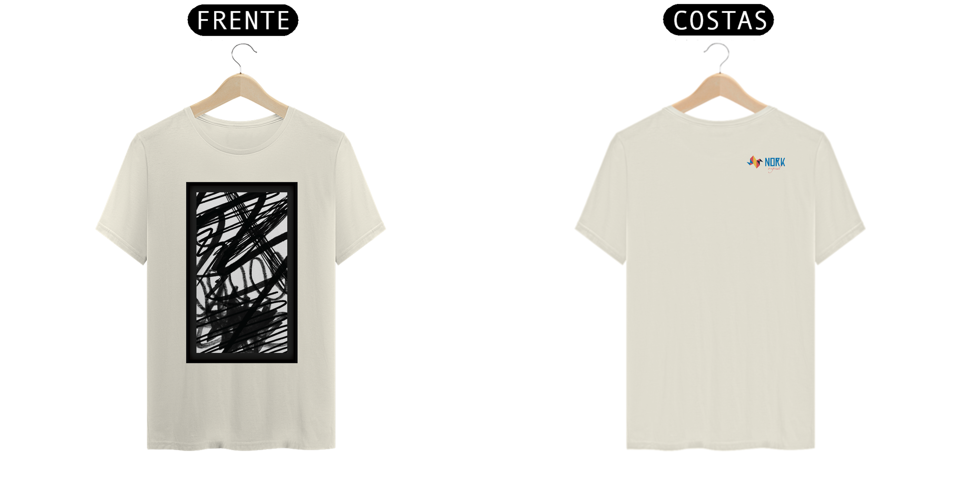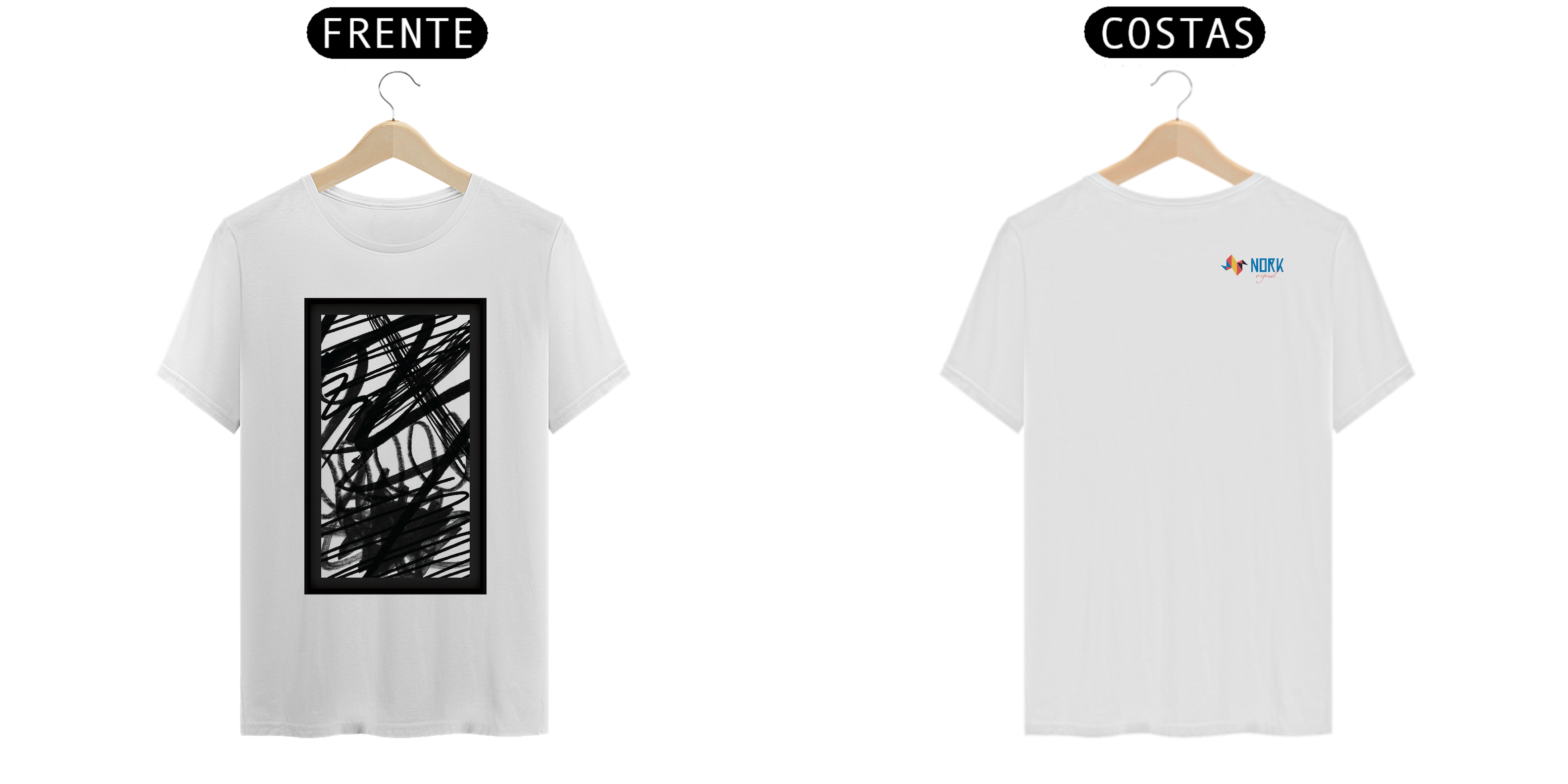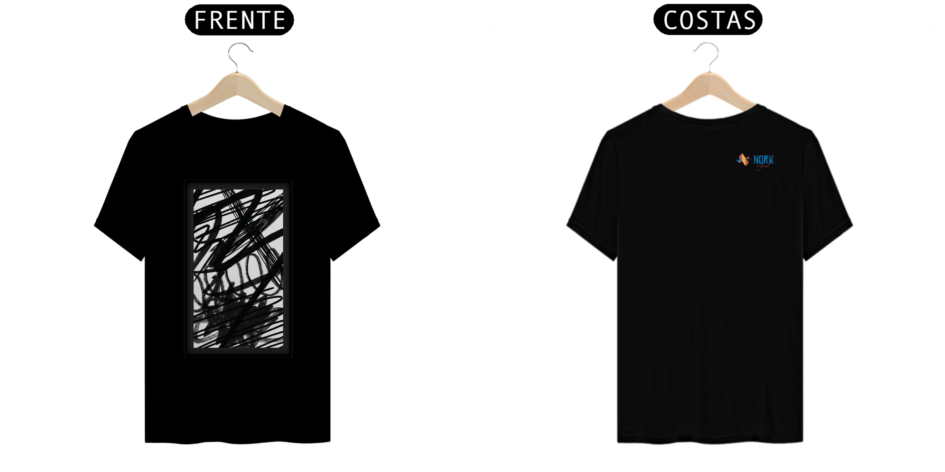 Parte da Coleção Nork Original Terapia, esta camisa exibe um design abstrato e intenso, com uma sobreposição de linhas grossas e finas em preto sobre fundo branco. Inspirada na "terapia do rabiscar", a arte transmite uma energia caótica e criativa, refletindo a liberdade de expressão e a espontaneidade do ato de desenhar.