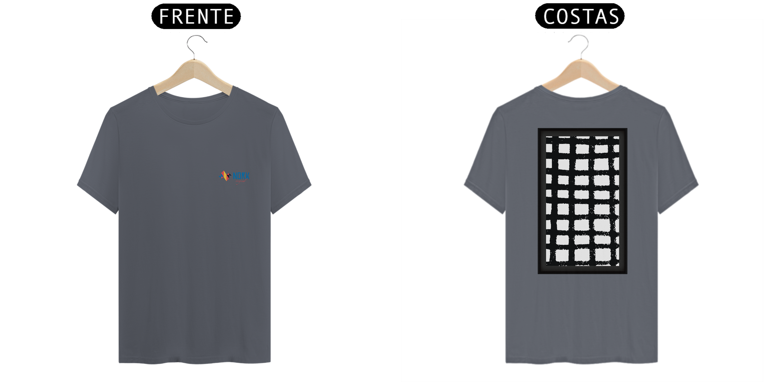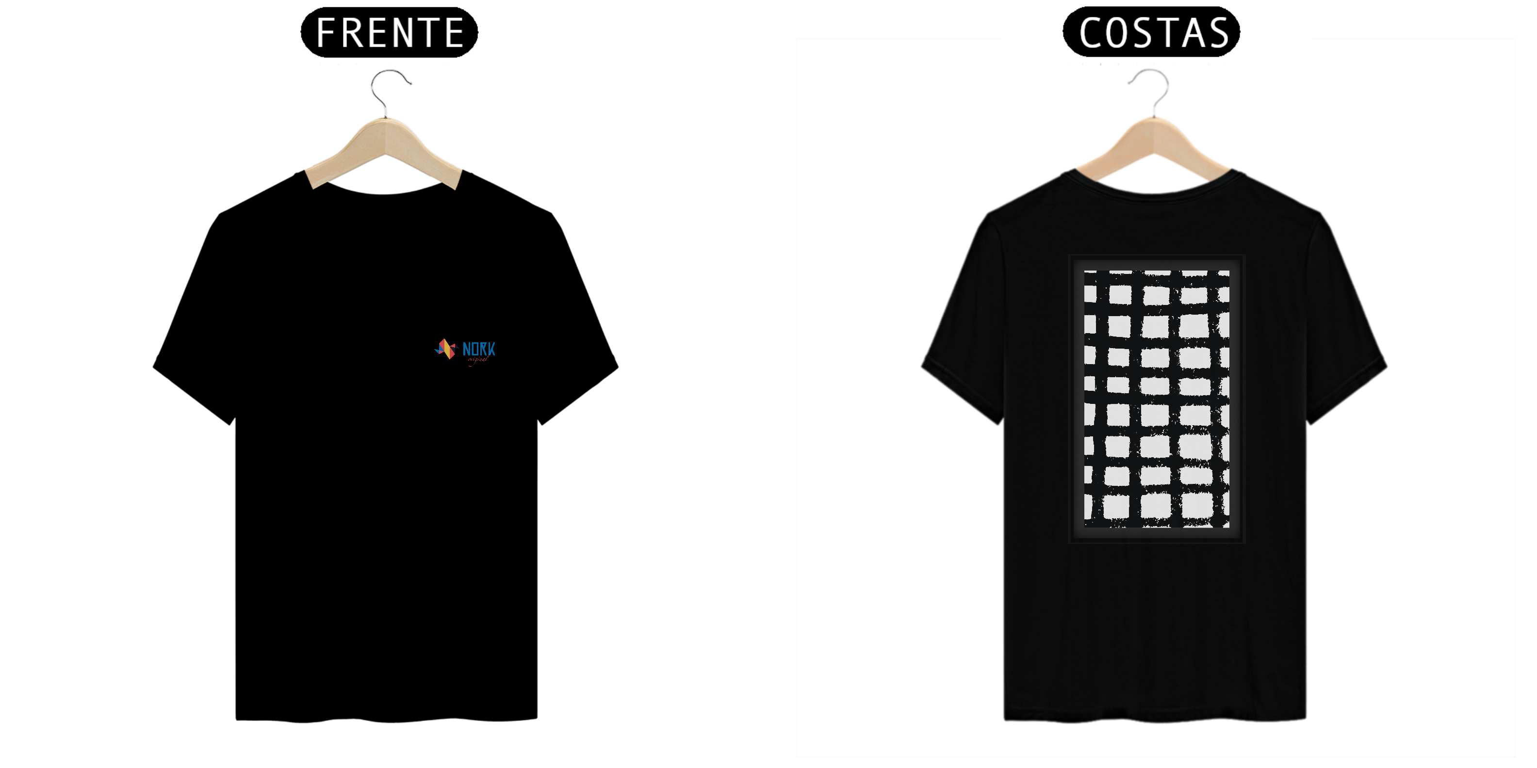 O contraste entre o fundo branco e o grid preto cria uma sensação de ordem e descontração ao mesmo tempo, simbolizando a busca por estabilidade em meio à imperfeição. Essa peça transmite autenticidade e estilo, sendo ideal para quem valoriza originalidade e criatividade no vestir.