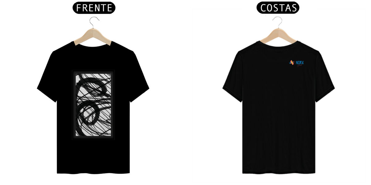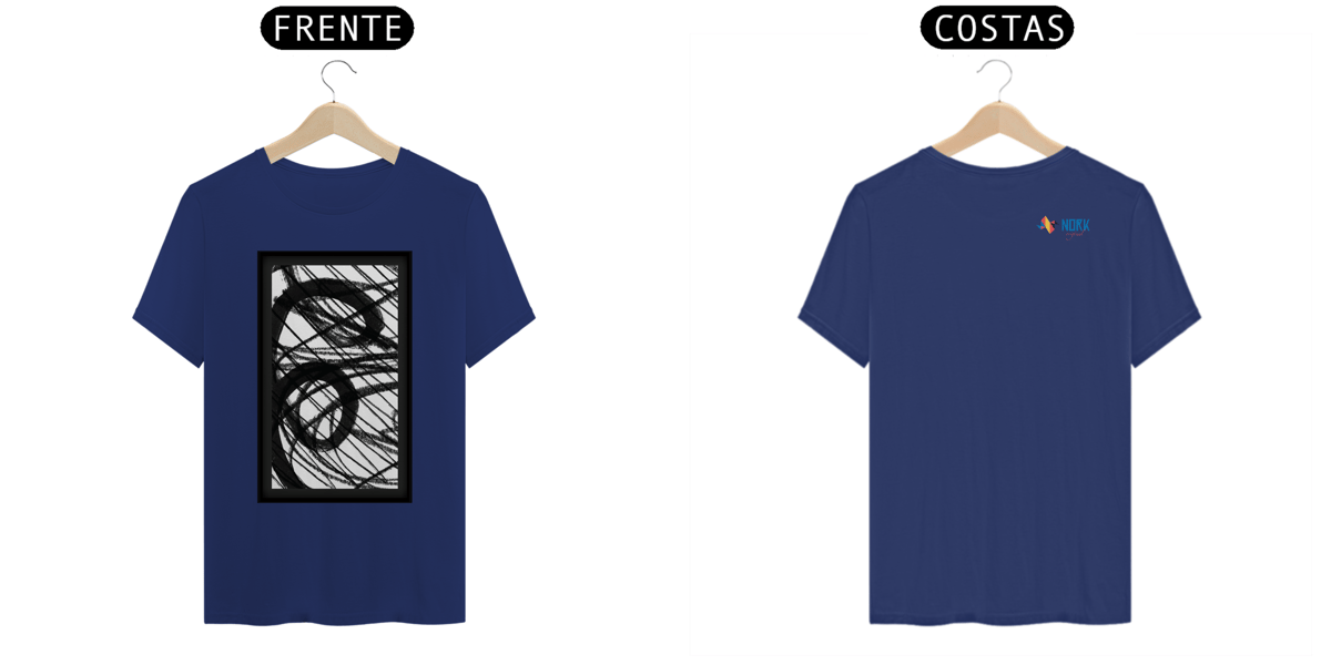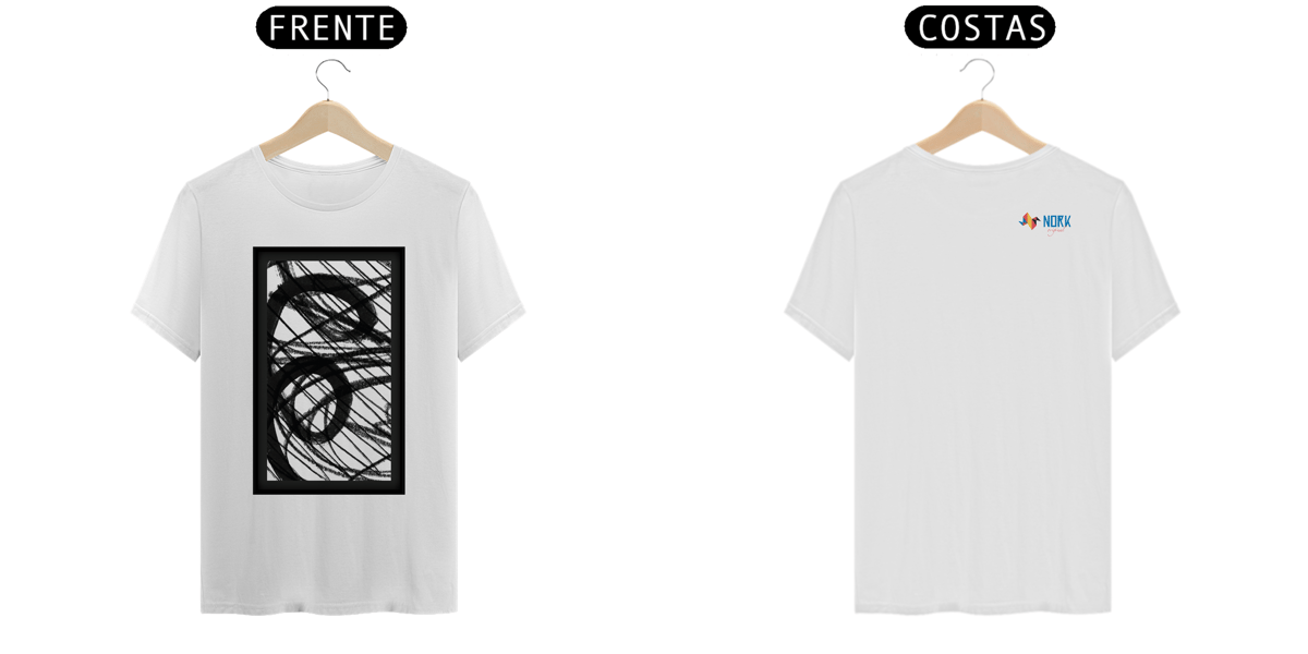 Parte da Coleção Nork Original Terapia, esta camisa apresenta um design abstrato e dinâmico com círculos sobrepostos e traços diagonais em preto, criando uma composição visual rica e cheia de movimento. Inspirada na "terapia do rabiscar", a arte explora o contraste entre linhas curvas e retas, transmitindo equilíbrio entre fluidez e estrutura.