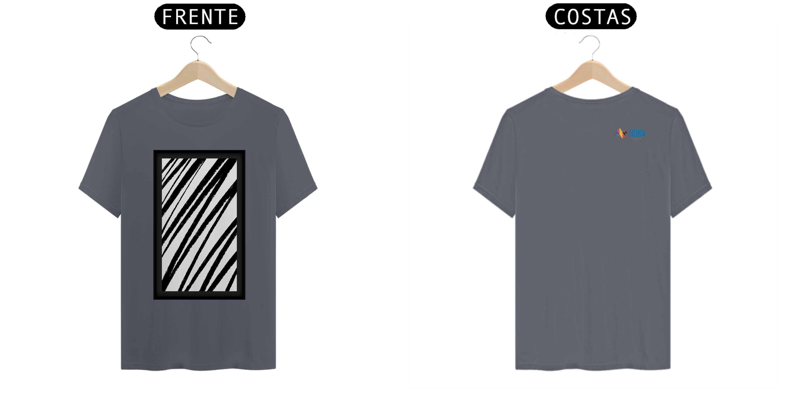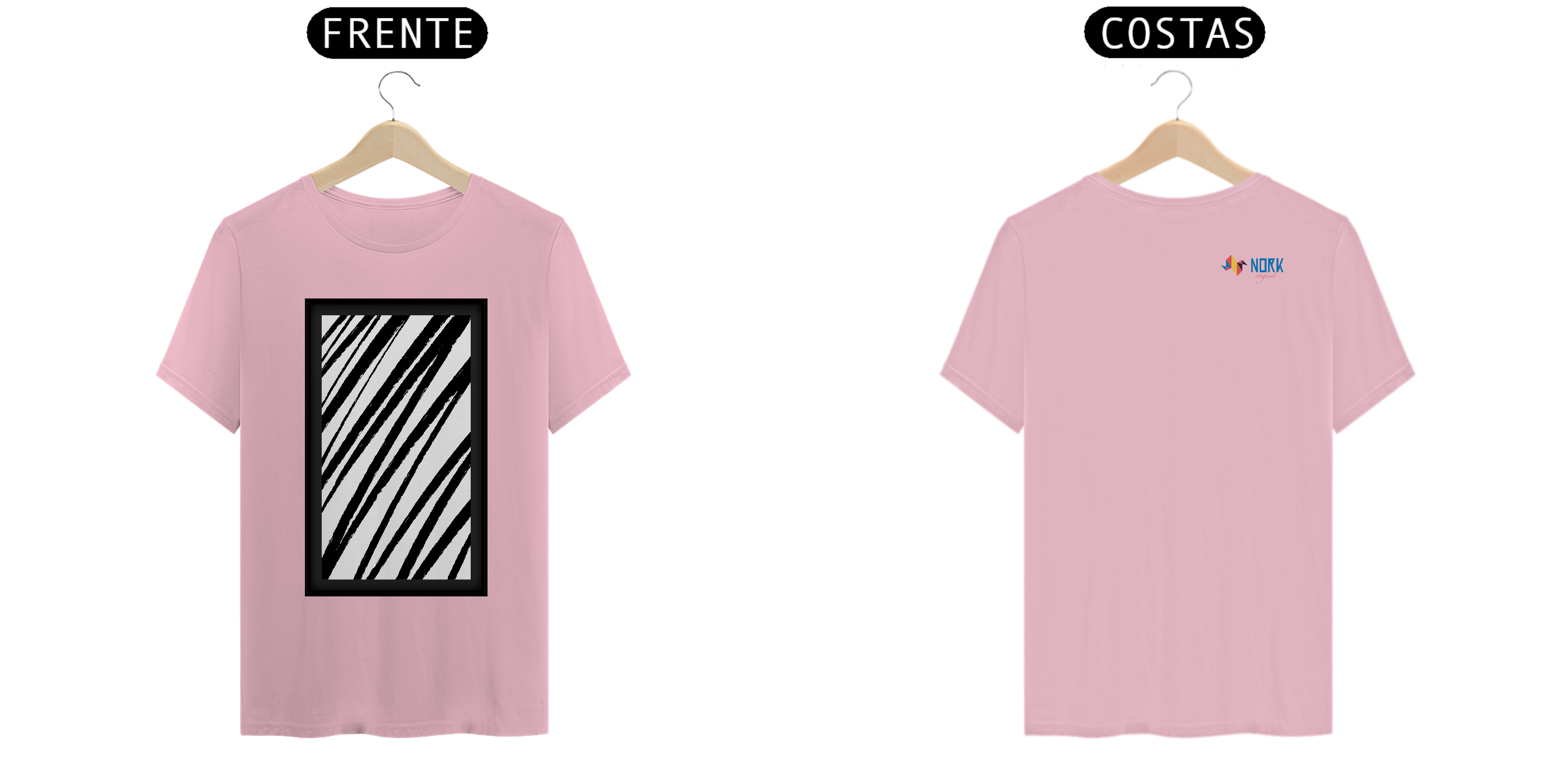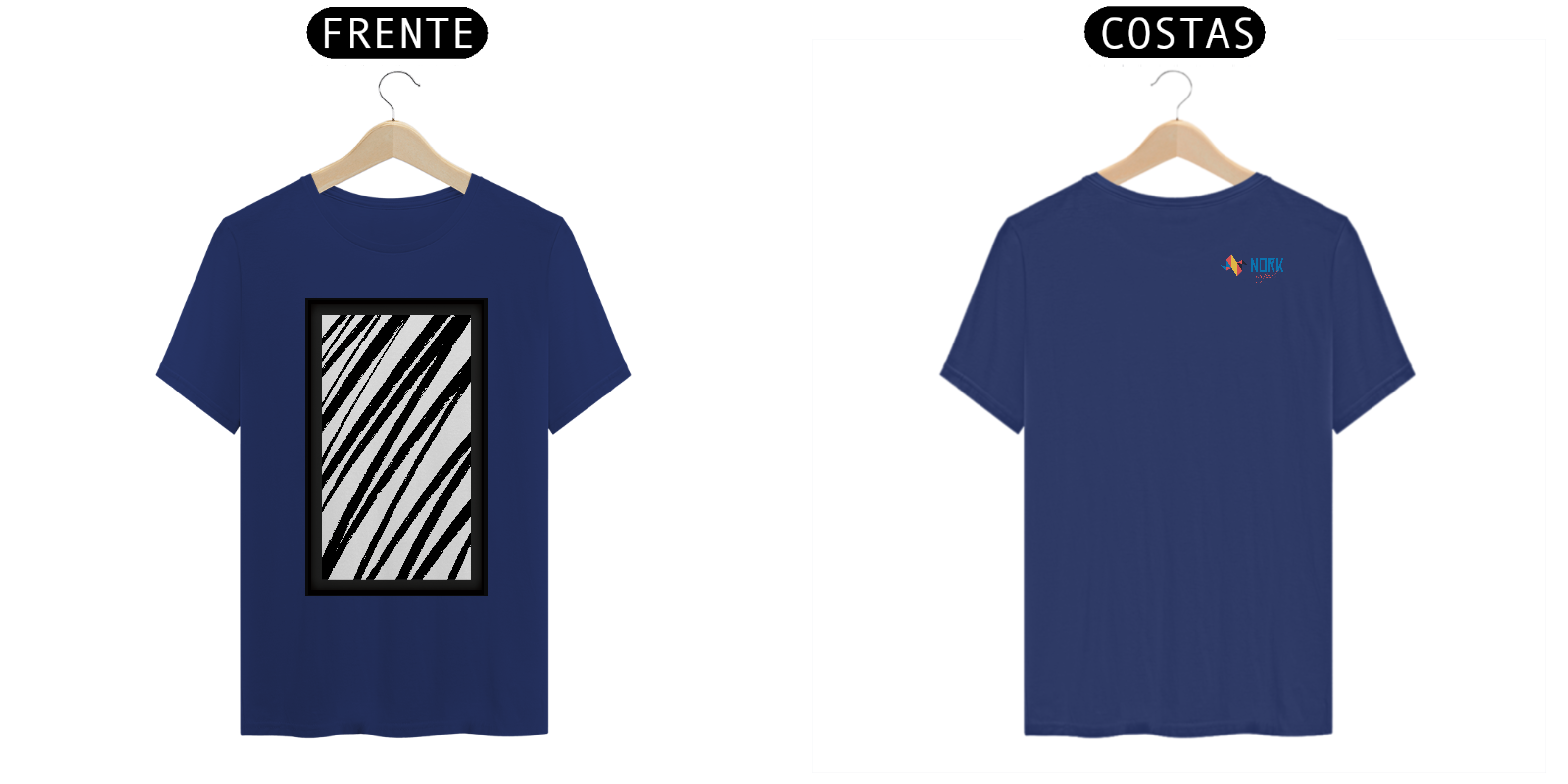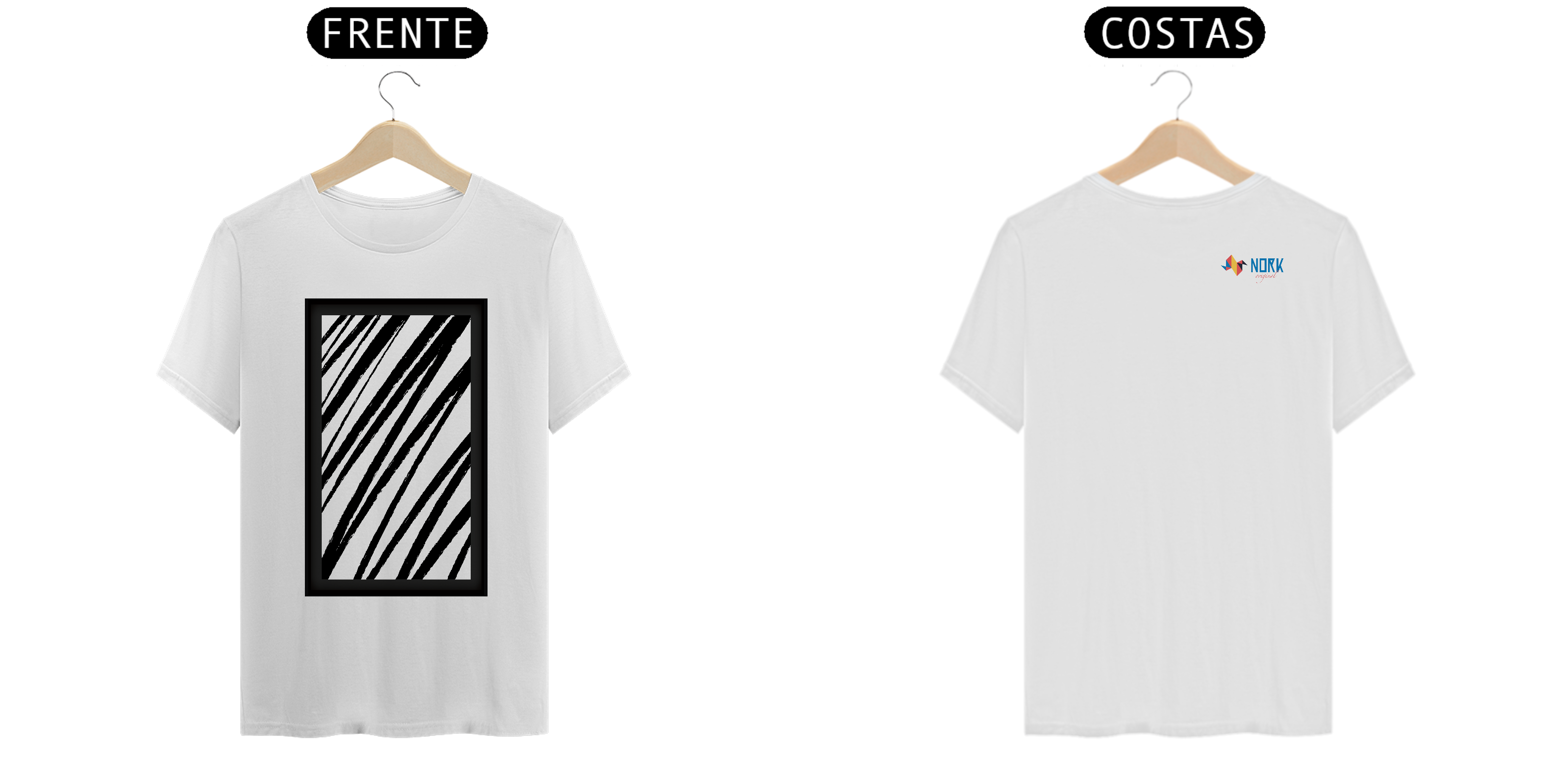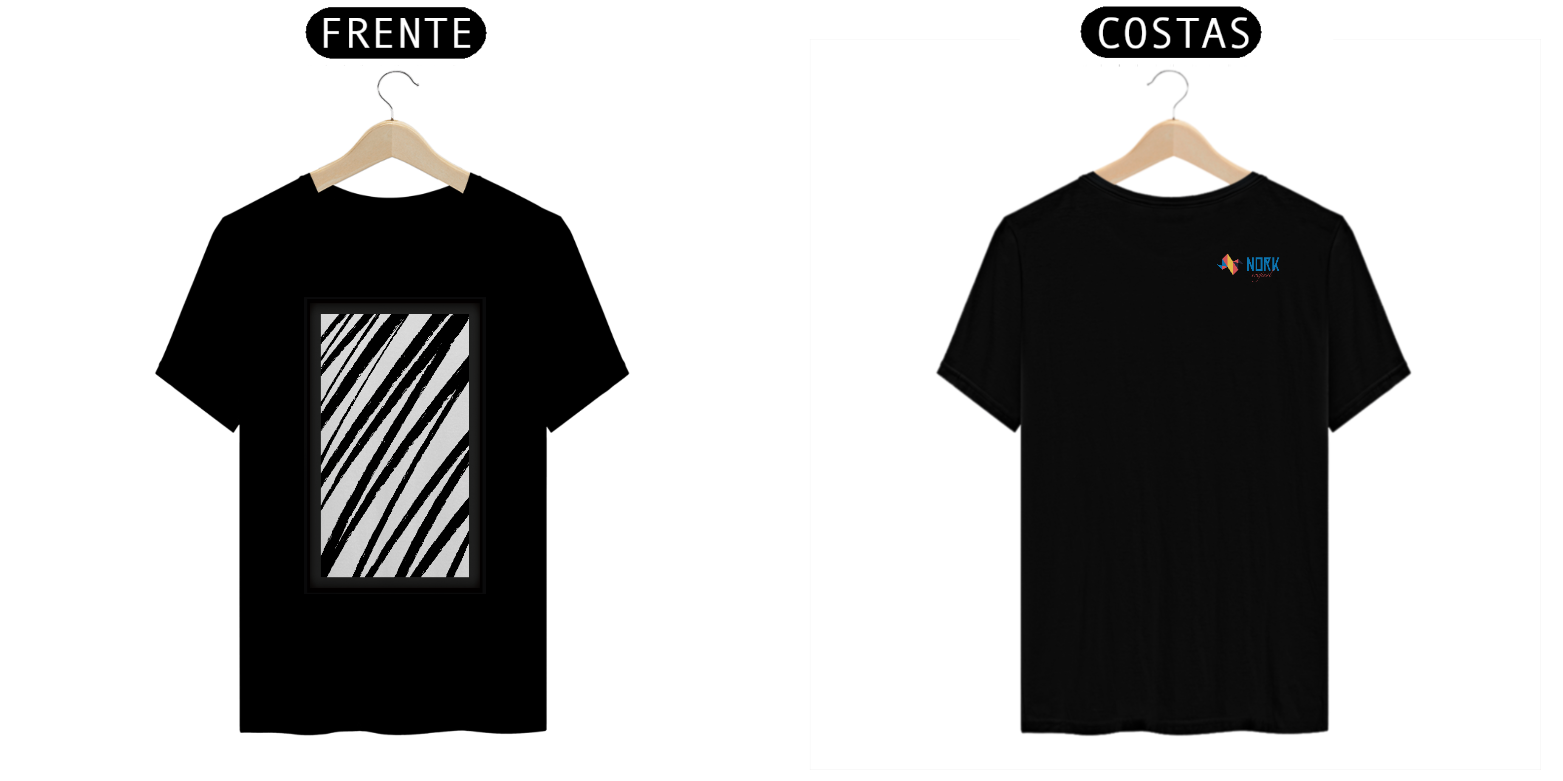 Parte da Coleção Nork Original Terapia, esta camisa apresenta um padrão de listras diagonais em preto e branco com bordas texturizadas, evocando um estilo que combina simplicidade e impacto visual. As linhas irregulares remetem à espontaneidade da "terapia do rabiscar", transmitindo movimento, energia e liberdade criativa.