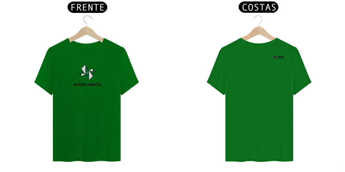 Descrição da Camisa: A estampa representa a Arábia Saudita com um design geométrico e contemporâneo. Um pássaro formado por triângulos assimétricos exibe as cores verde e branco da bandeira saudita, simbolizando o islamismo, a paz e a prosperidade. No centro, a inscrição em árabe com a shahada (profissão de fé islâmica) e a espada são destacados, remetendo à rica herança cultural e religiosa do país. A palavra "ARÁBIA SAUDITA", em tipografia angular, complementa o design com um toque moderno e forte, reforçando a identidade do país.