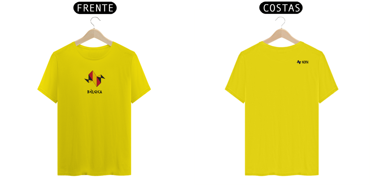A estampa celebra a Bélgica com um design geométrico sofisticado, utilizando um pássaro formado por triângulos que incorporam as cores da bandeira belga: preto, amarelo e vermelho. Esses tons vibrantes simbolizam a força, a prosperidade e o orgulho nacional. O contraste das cores cria um efeito visual impactante, enquanto a palavra "BÉLGICA", em uma tipografia moderna e angular, confere um toque de contemporaneidade, reforçando a elegância e a identidade cultural da peça.