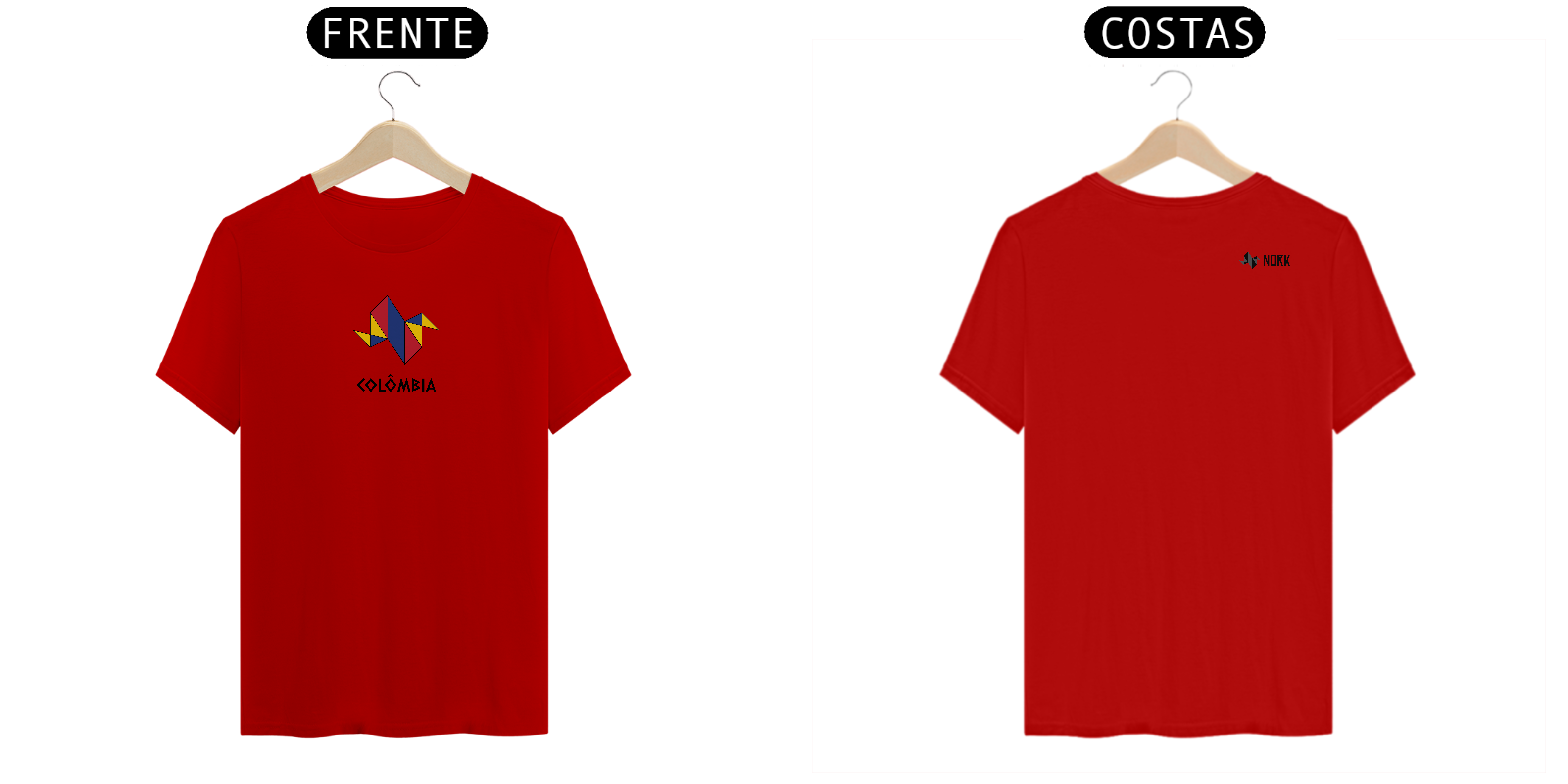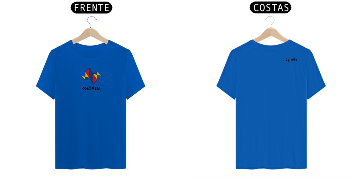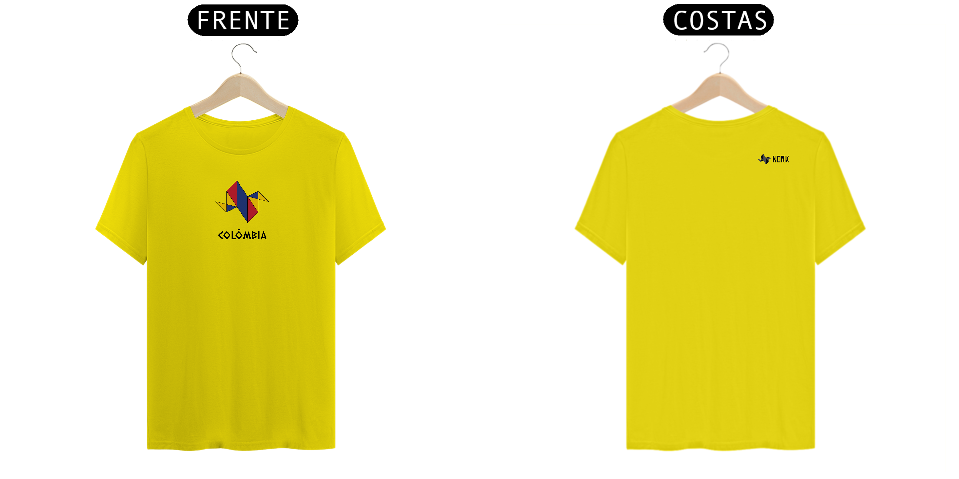 A estampa destaca a logo da Nork em formato de origami, estilizada com as cores vibrantes da bandeira da Colômbia: amarelo, azul e vermelho. O design geométrico transmite modernidade e sofisticação, enquanto as cores simbolizam a riqueza natural, a paz e o sangue daqueles que lutaram pela independência do país. A palavra "COLÔMBIA", apresentada em uma tipografia angular e contemporânea, complementa o design, reforçando a identidade e o orgulho nacional que a peça transmite.