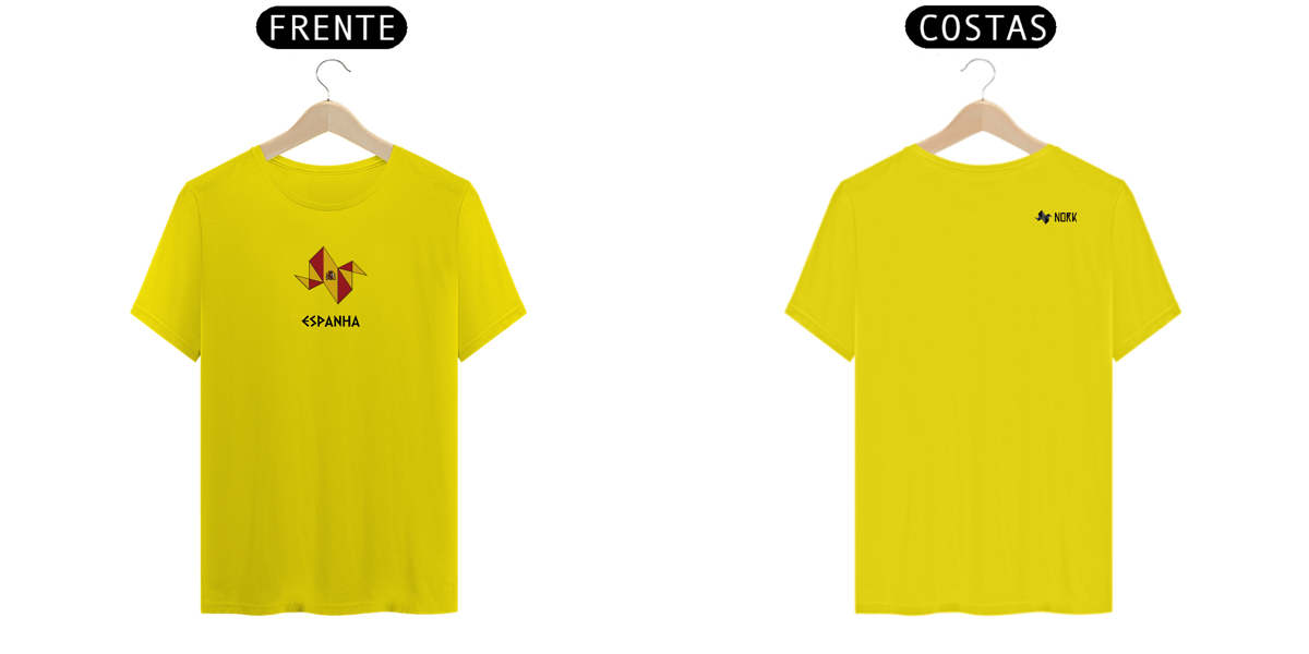 A estampa traz a logo da Nork em formato de origami, estilizada com as cores da bandeira da Espanha: vermelho e amarelo. O brasão central é destacado no design, simbolizando a rica história e a tradição do país. O design geométrico reflete modernidade e elegância, enquanto a palavra "ESPANHA", em tipografia angular e marcante, complementa o visual, reforçando o orgulho nacional e a sofisticação da peça.
