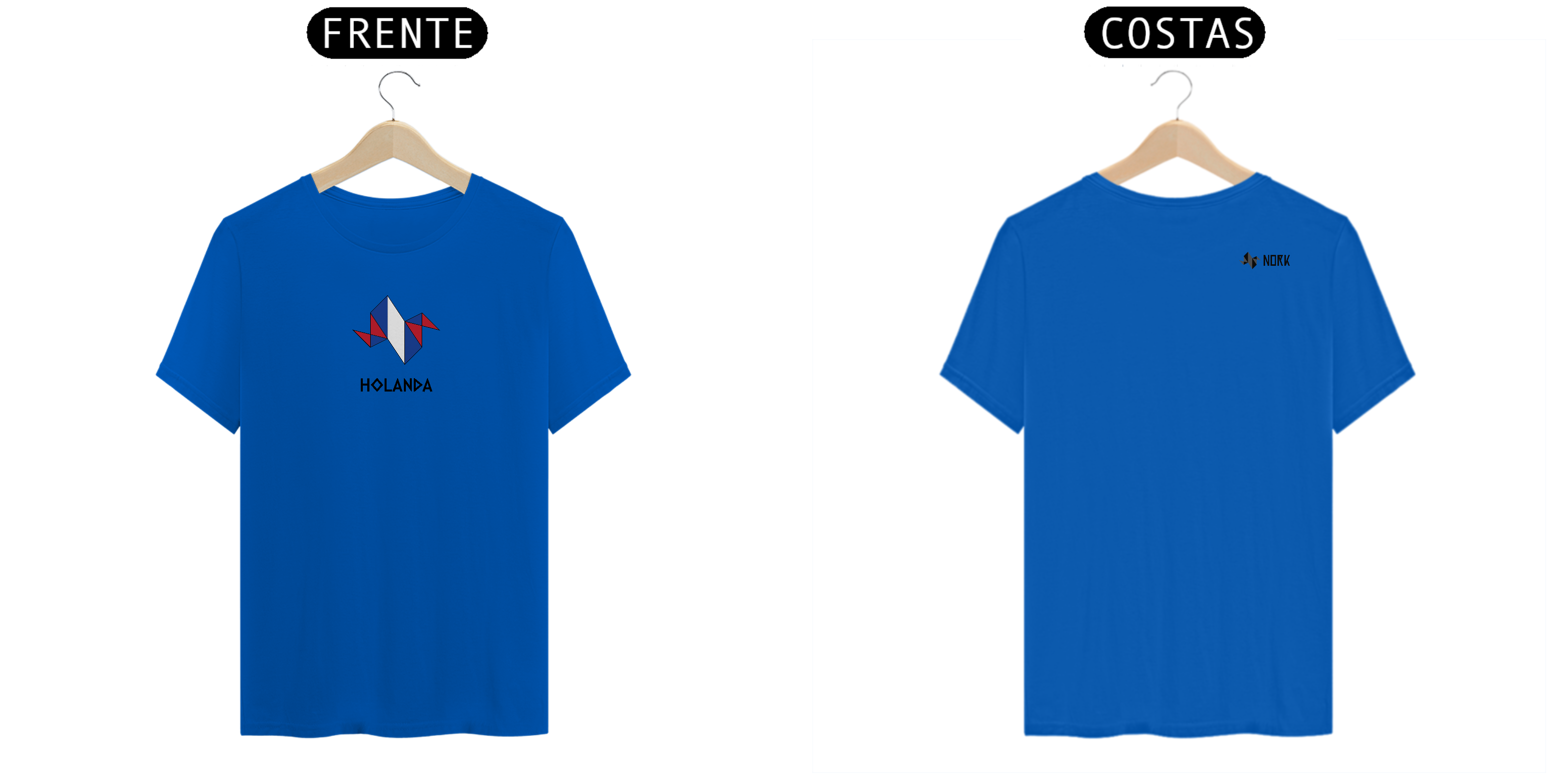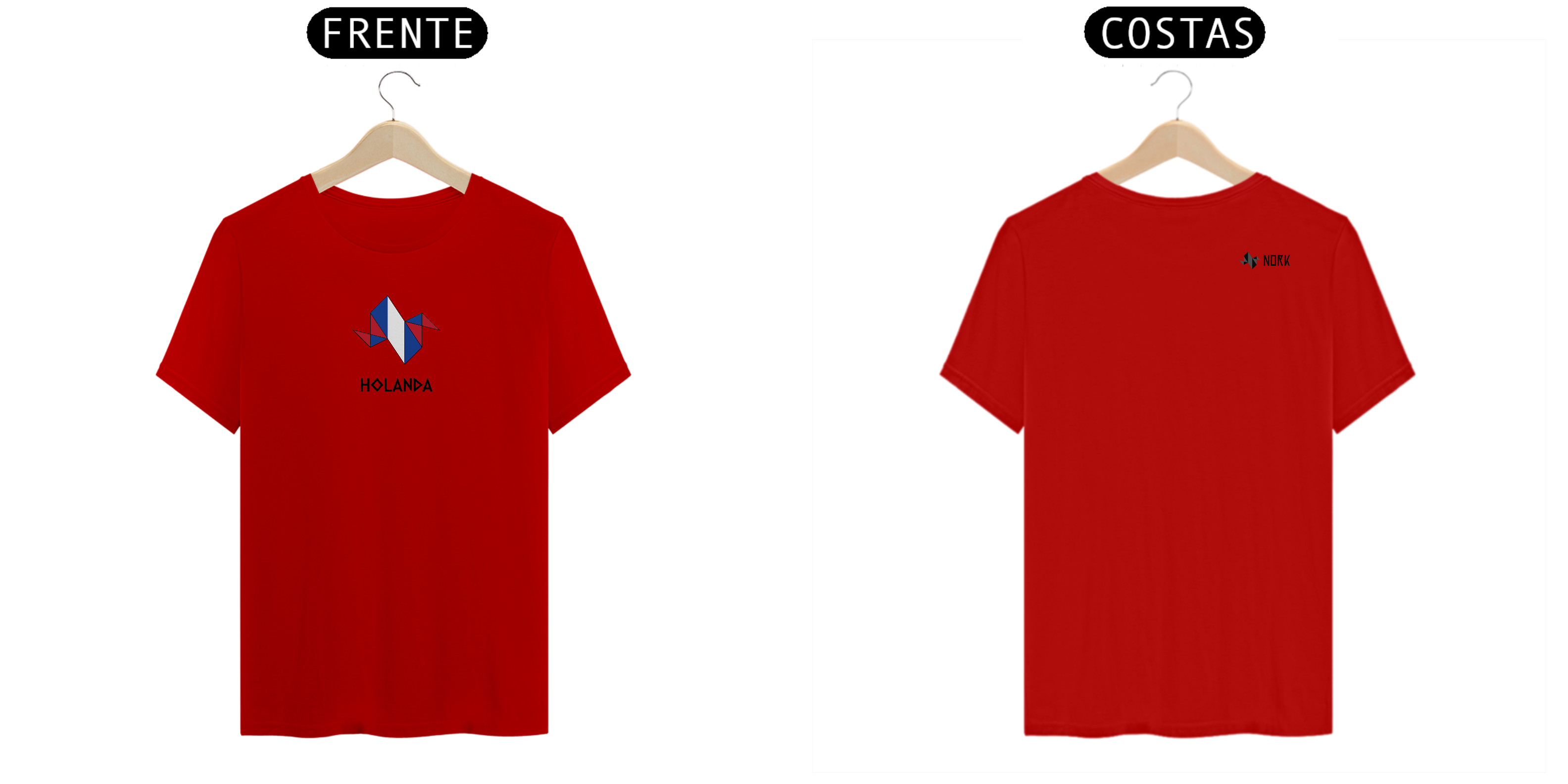 A estampa apresenta a logo da Nork em formato de origami, estilizada com as cores da bandeira da Holanda: vermelho, branco e azul. O design geométrico reflete a modernidade e a sofisticação do país, remetendo à sua rica história e tradição. A palavra "HOLANDA", em uma tipografia angular e marcante, complementa o visual, destacando a força e o orgulho nacional de forma contemporânea.