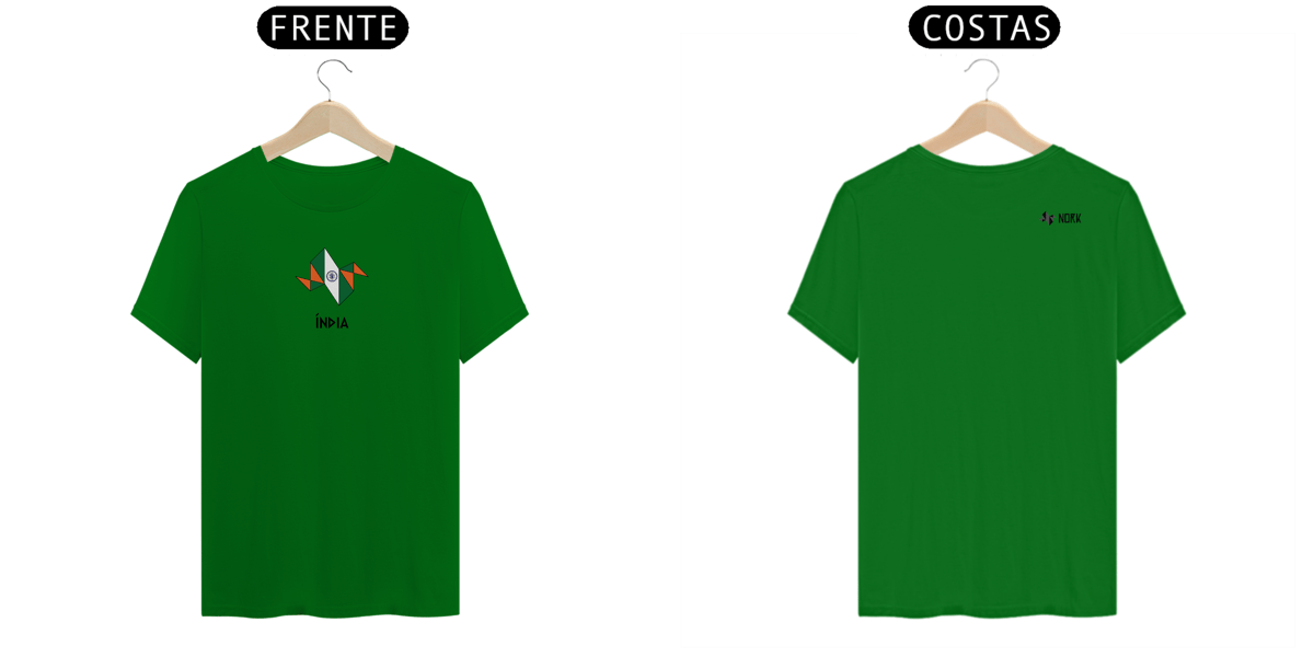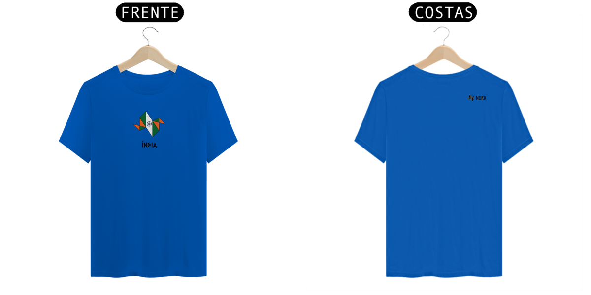 A estampa destaca a logo da Nork em formato de origami, estilizada com as cores da bandeira da Índia: laranja, branco e verde. O design geométrico é complementado pela roda Ashoka (Chakra) no centro, símbolo de progresso e justiça. As cores transmitem unidade, pureza e coragem, enquanto a palavra "ÍNDIA", apresentada em uma tipografia angular e moderna, completa o visual, destacando o espírito cultural e a história rica do país.