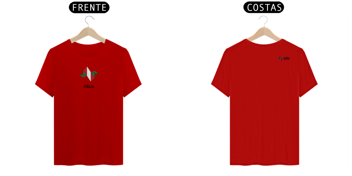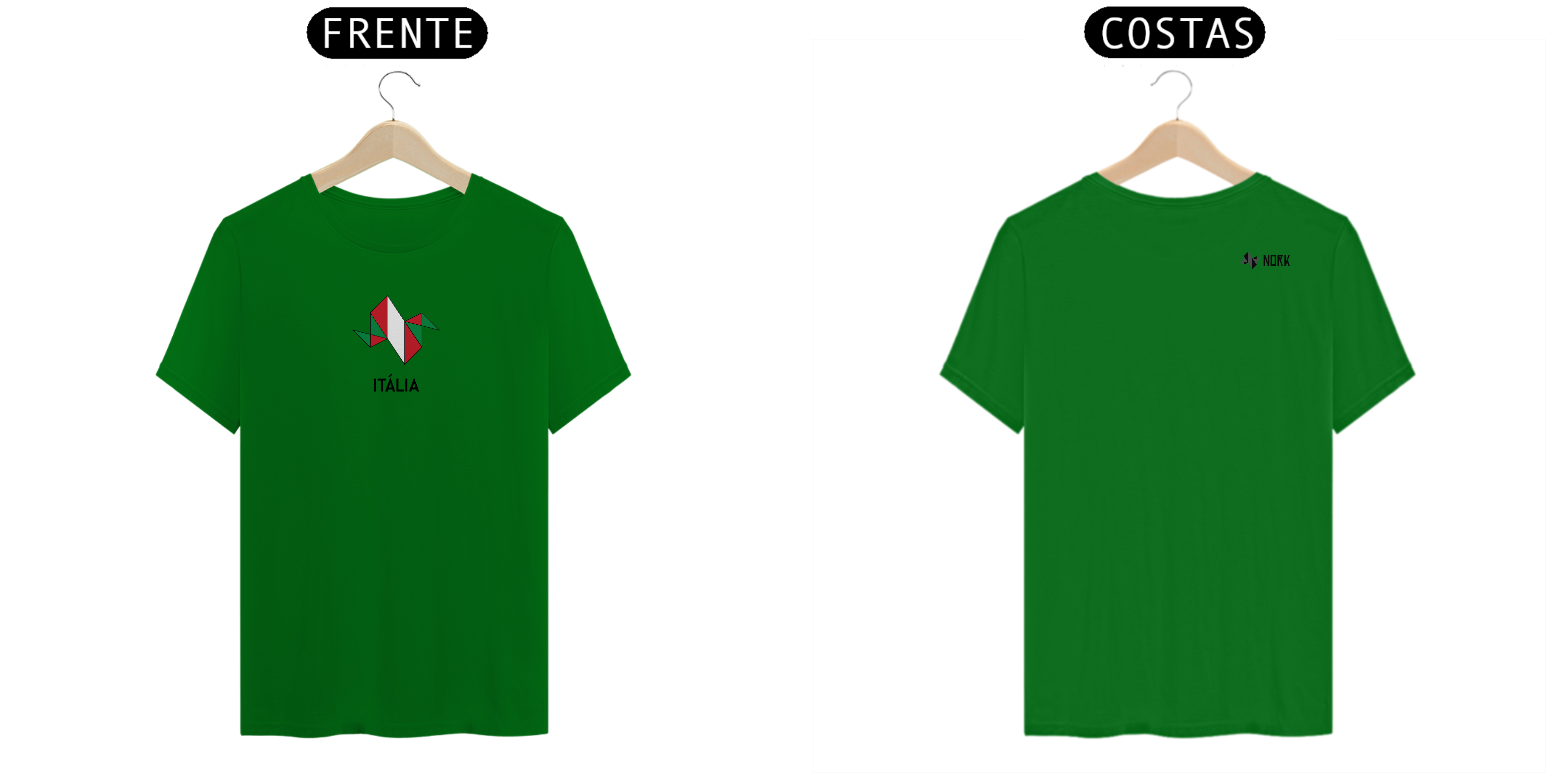 A estampa destaca a logo da Nork em formato de origami, estilizada com as cores da bandeira da Itália: verde, branco e vermelho. O design geométrico reflete elegância e modernidade, homenageando a rica cultura e a tradição italiana. A palavra "ITÁLIA", apresentada em uma tipografia angular e contemporânea, complementa o visual, simbolizando o orgulho nacional e a sofisticação que caracterizam o país.