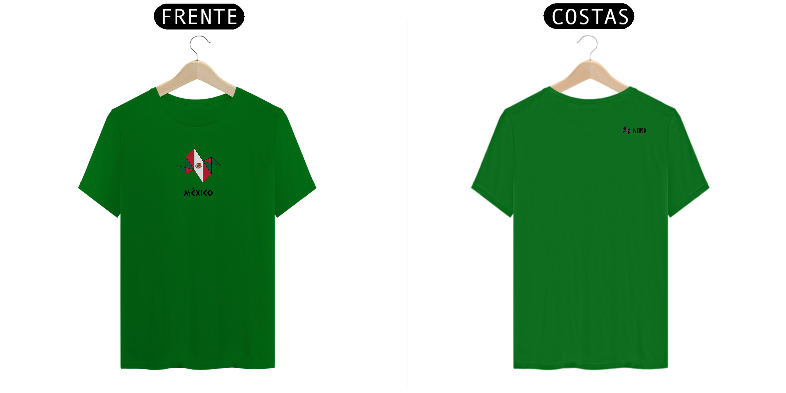 A estampa destaca a logo da Nork em formato de origami, estilizada com as cores da bandeira do México: verde, branco e vermelho. No centro, o brasão nacional, com a águia pousada sobre um cacto e segurando uma serpente, representa força, independência e identidade nacional. O design geométrico reflete modernidade e tradição, enquanto a palavra "MÉXICO", em uma tipografia angular e marcante, complementa o visual, destacando o orgulho e a cultura do país.