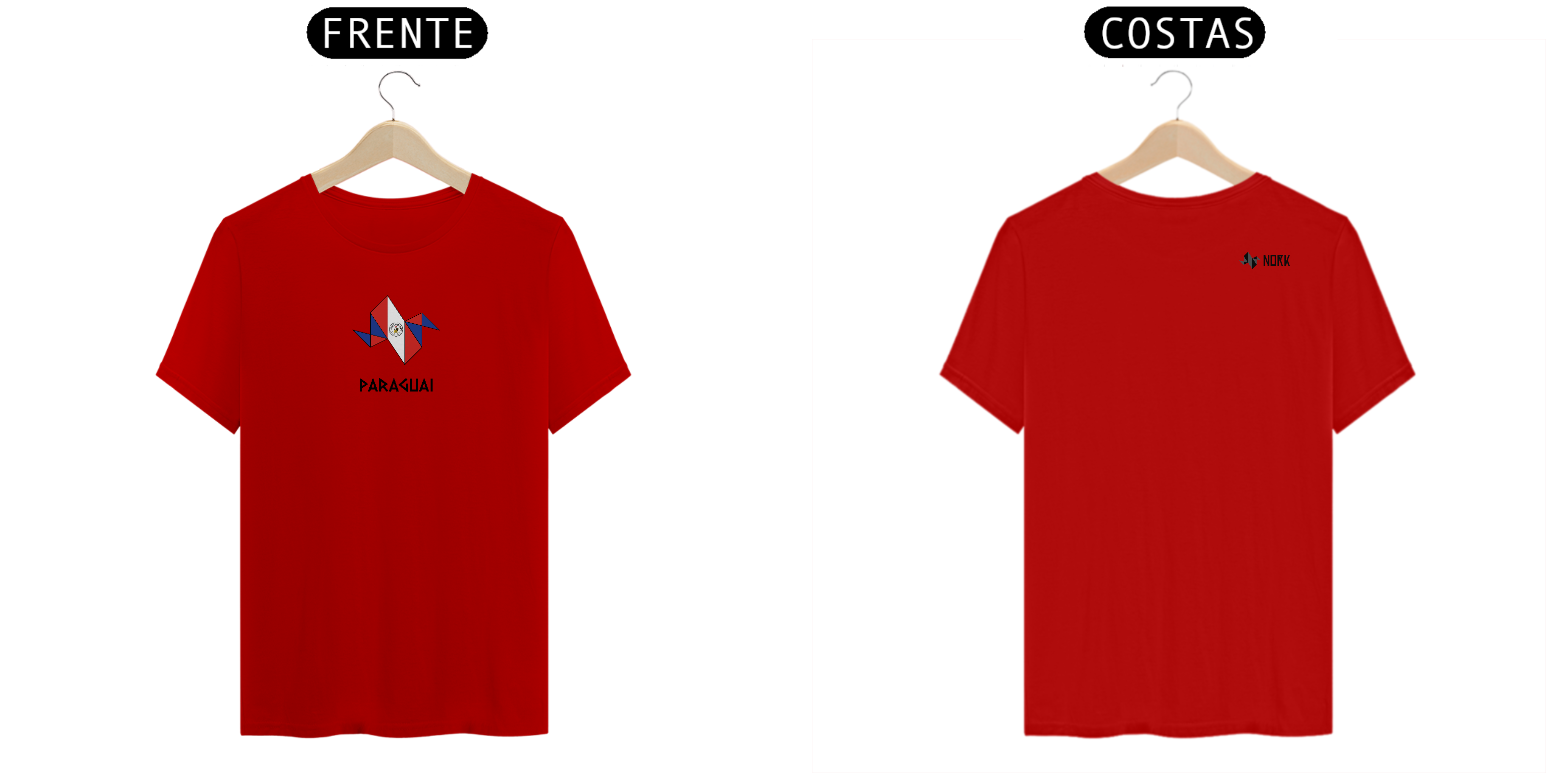 A estampa representa o Paraguai com um design geométrico estilizado que une tradição e modernidade. O pássaro formado por triângulos incorpora as cores da bandeira paraguaia — vermelho, branco e azul —, simbolizando patriotismo, paz e liberdade. O brasão central, com seus detalhes únicos, destaca o orgulho nacional e a riqueza cultural do país. A palavra "PARAGUAI", em uma tipografia moderna e angular, completa o visual da peça, reforçando sua elegância e identidade.