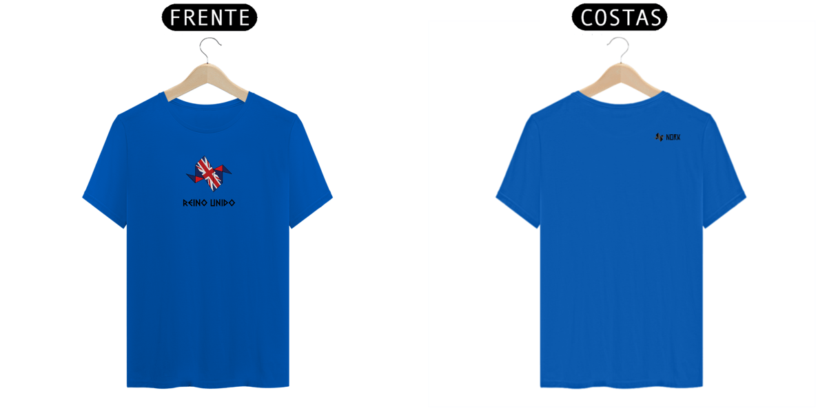 A estampa apresenta a logo da Nork em formato de origami, estilizada com as cores e elementos da bandeira do Reino Unido: azul, vermelho e branco. O design geométrico reflete a elegância e a modernidade, enquanto a Union Jack, um dos símbolos mais reconhecidos mundialmente, representa a união e a história rica das nações que compõem o Reino Unido. A palavra "REINO UNIDO", em uma tipografia angular e marcante, completa o visual, destacando o orgulho e a tradição britânica.