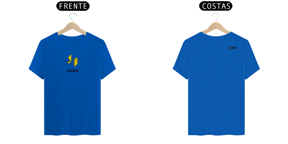 A estampa apresenta a logo da Nork em formato de origami, composta pelas cores simbólicas da bandeira da Ucrânia: o azul e o amarelo. O azul, que domina as partes superiores, remete aos céus abertos, enquanto o amarelo, presente nas seções inferiores, simboliza os vastos campos de trigo do país. A logo é complementada pelo nome "UCRÂNIA" em uma fonte estilizada, trazendo modernidade e elegância ao design, além de destacar o orgulho nacional.