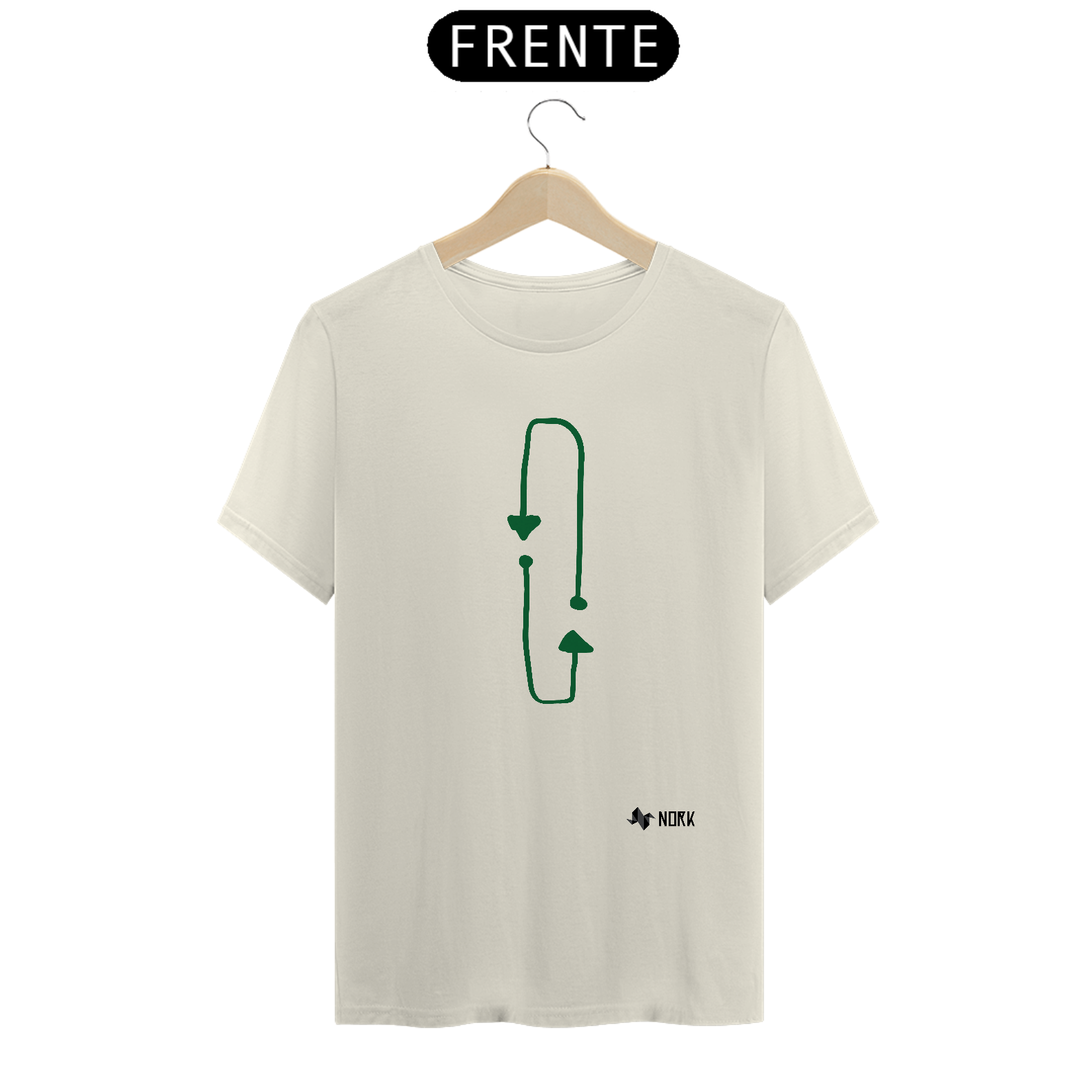 O design apresenta um traçado verde que forma um loop com setas indicando direções opostas, sugerindo continuidade e um fluxo cíclico. O traçado minimalista e curvado transmite equilíbrio e movimento constante, representando processos dinâmicos e interconectados.