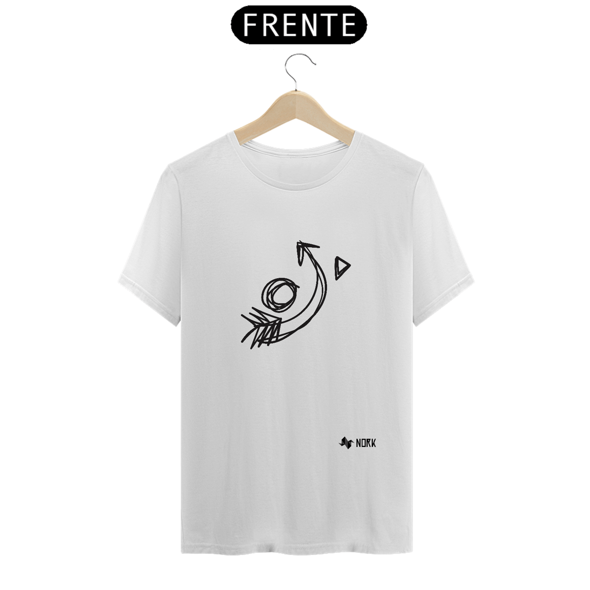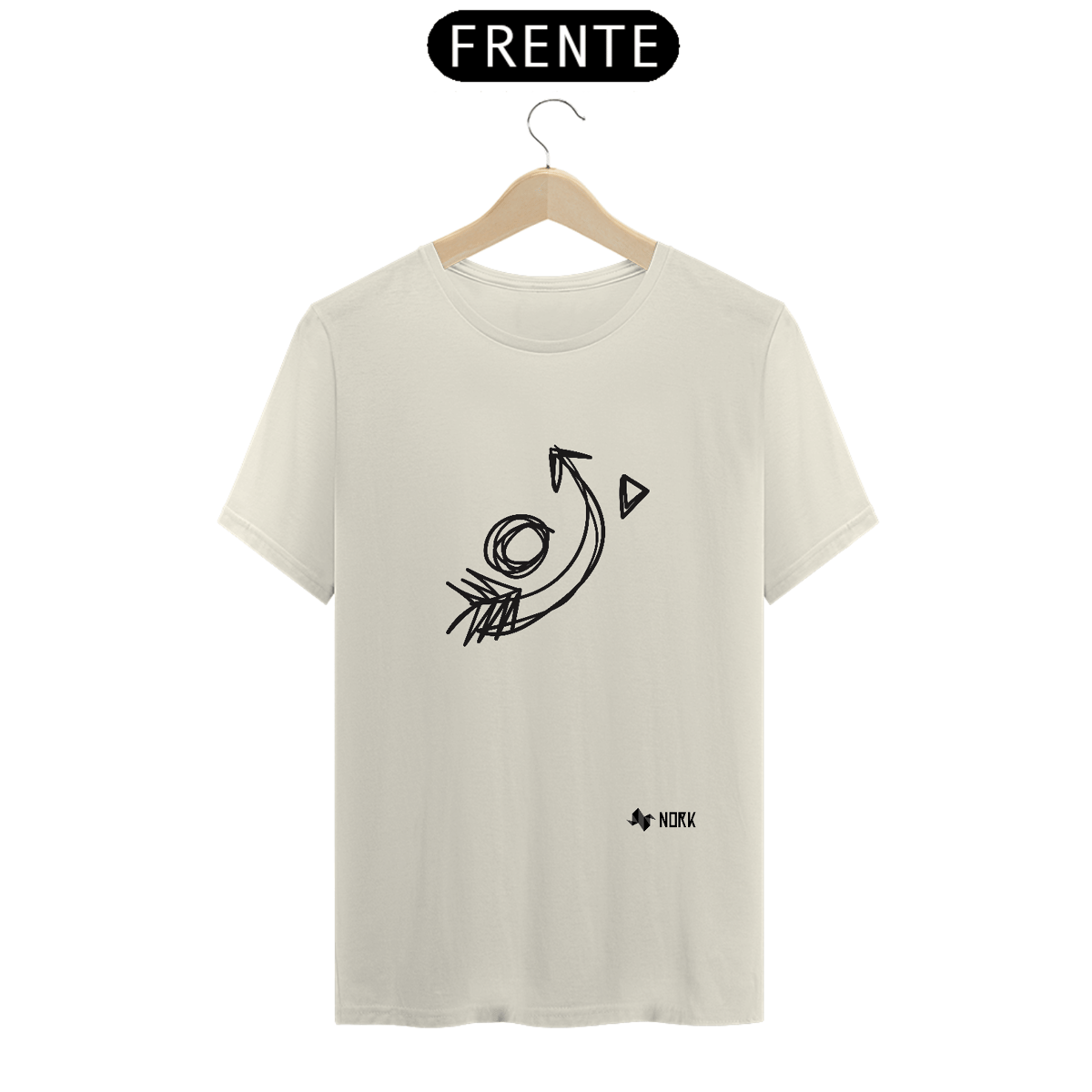 A composição traz uma seta curva que se entrelaça em torno de um círculo rabiscado, acompanhada por um pequeno triângulo flutuante. A estampa, marcada por traços livres e imperfeitos, reflete dinamismo e movimento contínuo, remetendo à ideia de ciclos e evolução. Esse design captura a essência experimental e intuitiva da Coleção Nork Rabisco, com um apelo contemporâneo e criativo.
