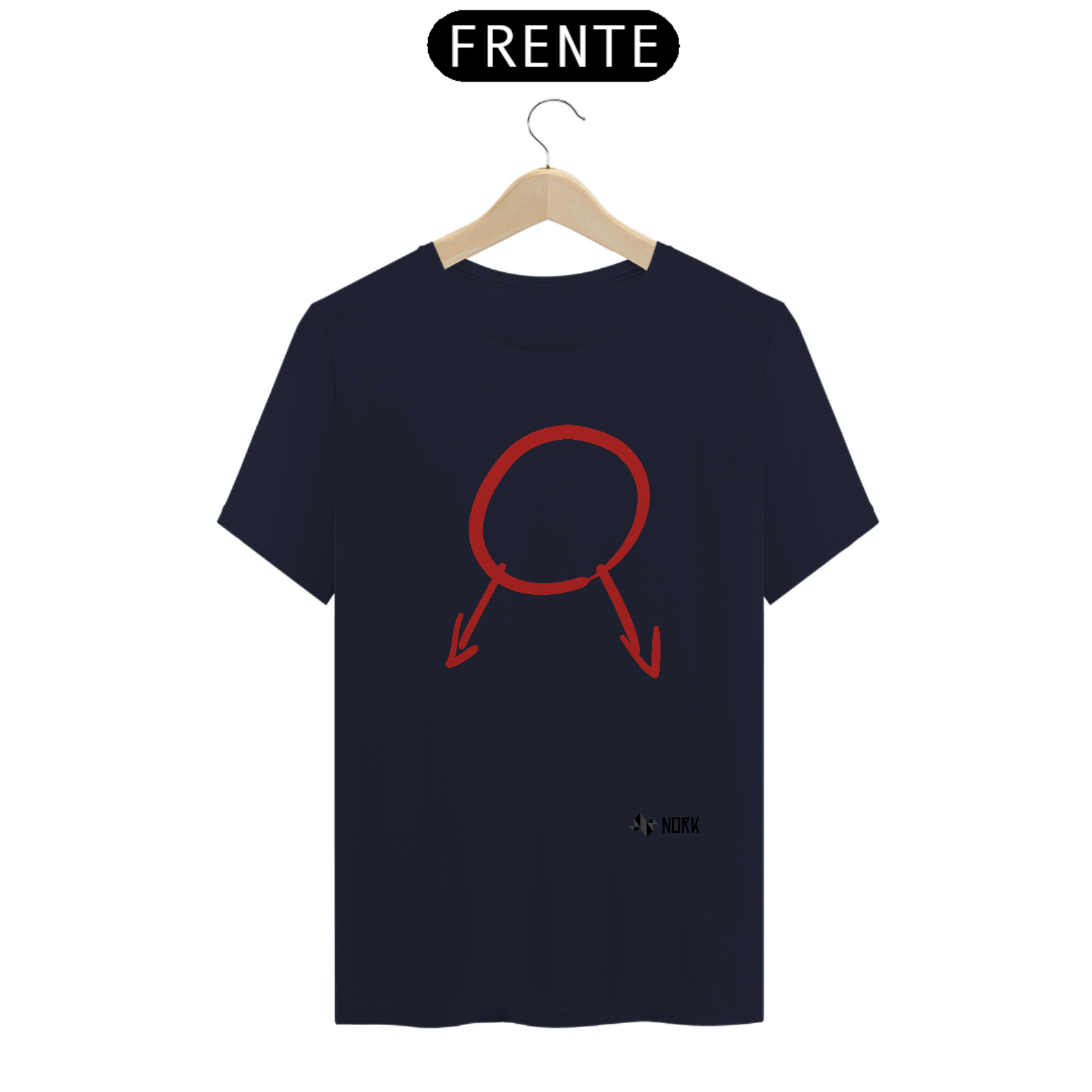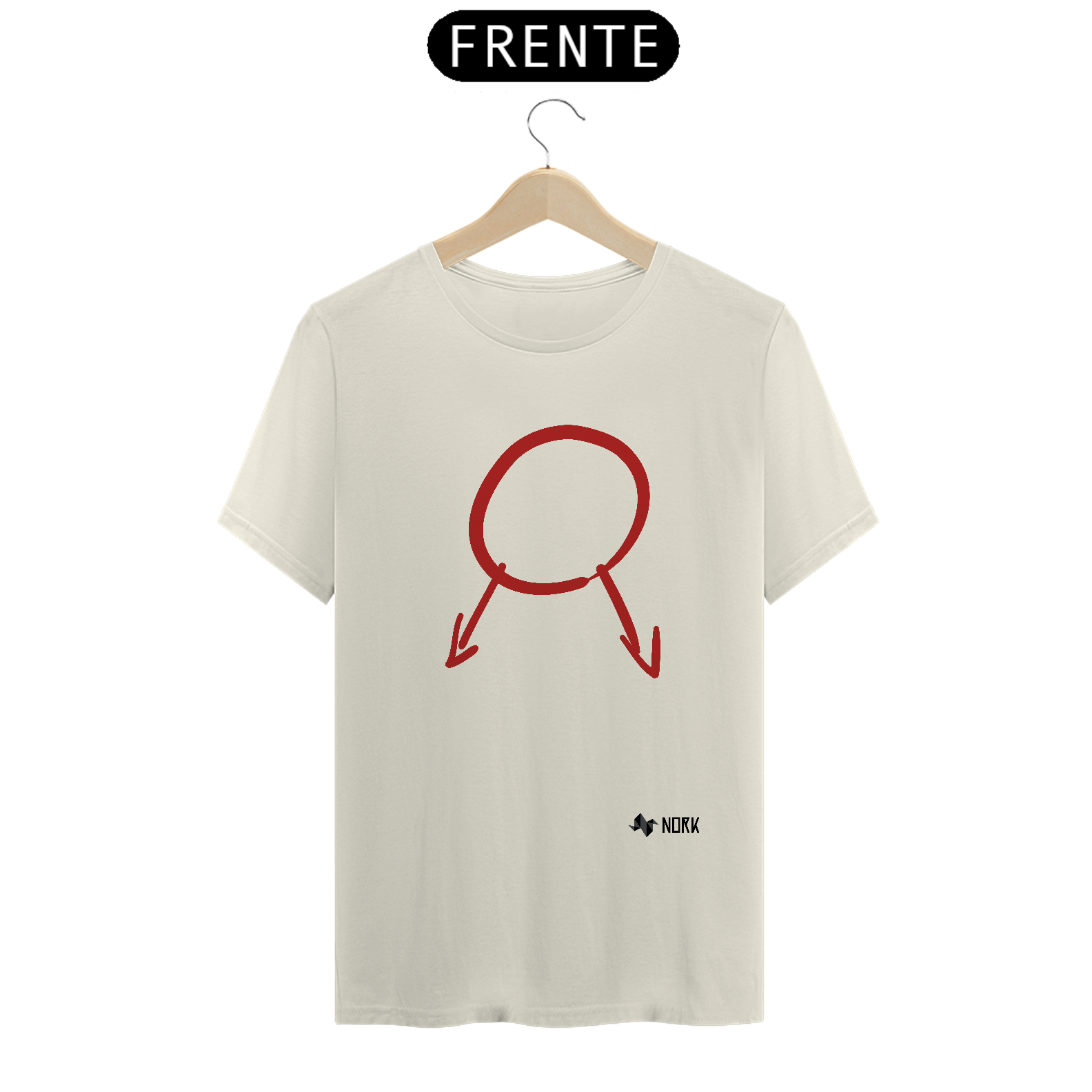 Um traço contínuo em vermelho que forma um círculo na parte superior e se divide em duas setas apontando para baixo. Essa composição lembra uma ideia central irradiando em duas direções, evocando foco e conexão com o mundo ao redor. A cor vermelha traz intensidade e paixão, em sintonia com a essência expressiva da Coleção Nork Rabisco.