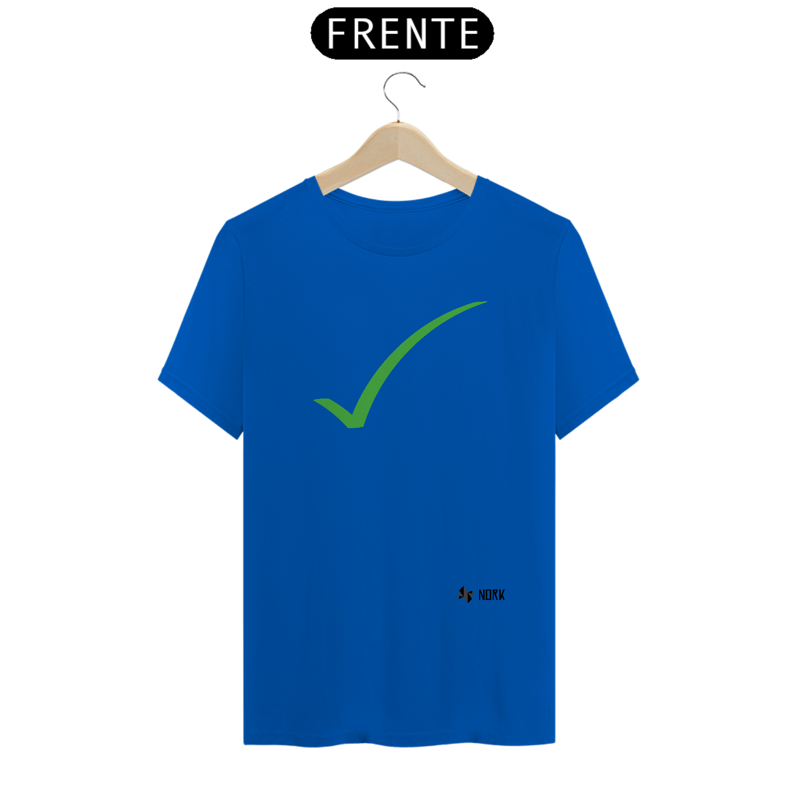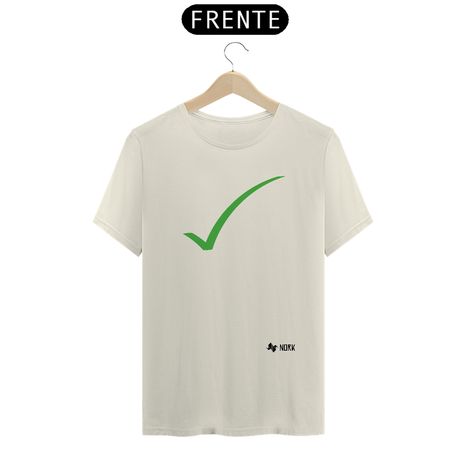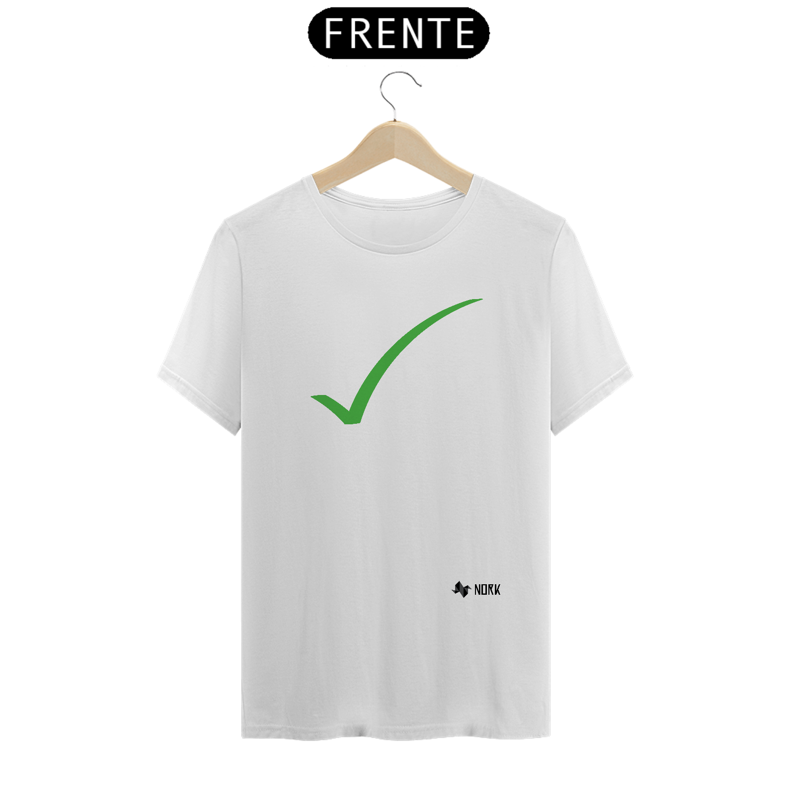 A estampa traz o ícone universal de um "check" em verde vibrante, representando aprovação, validação e positividade. O design limpo e direto transmite uma mensagem de confiança e realização. O uso do verde reflete crescimento, equilíbrio e conexão com a natureza, alinhando-se com o conceito de harmonia e sustentabilidade.