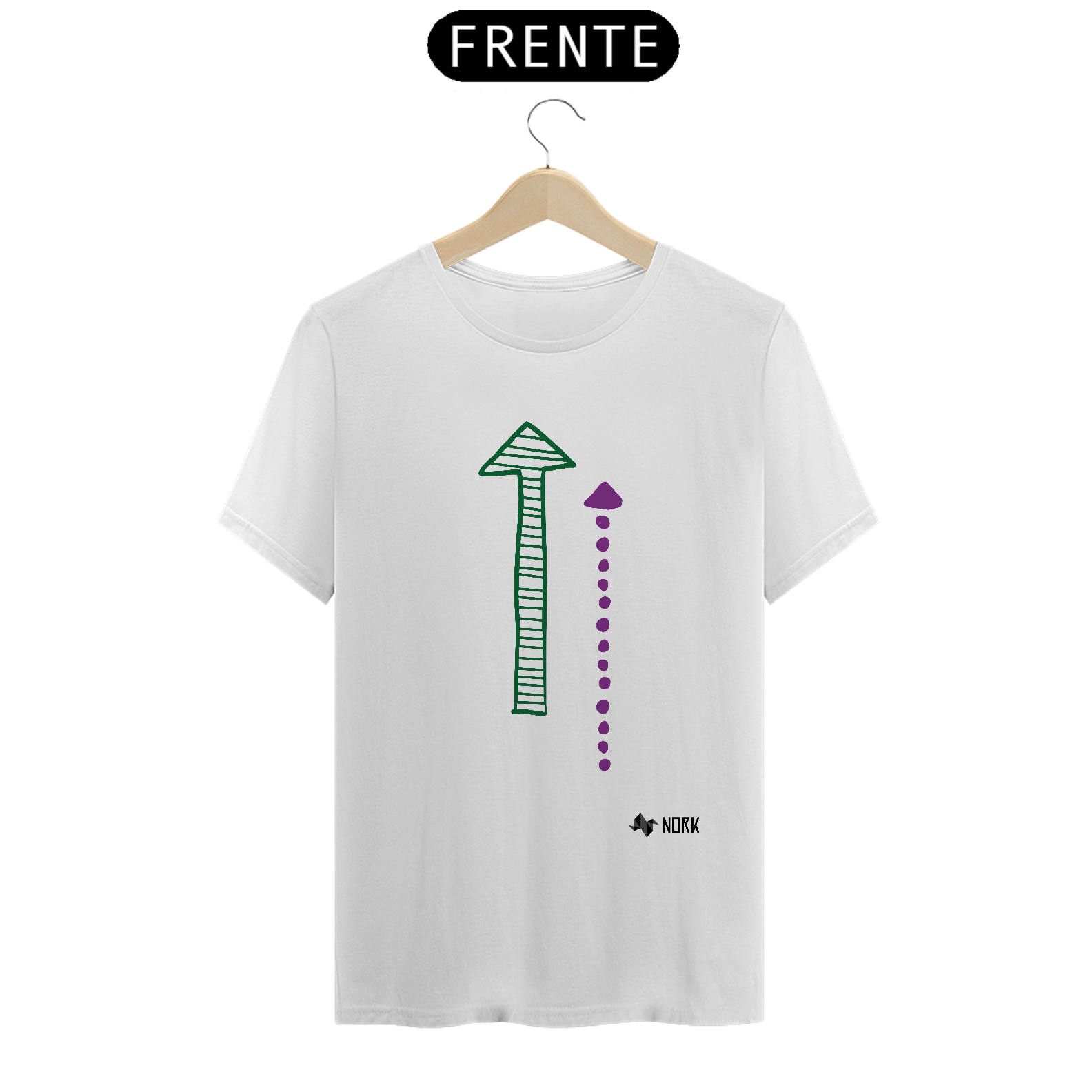 Esta arte combina uma seta verde preenchida com listras horizontais e uma seta roxa menor composta por círculos que formam um movimento crescente. O design evoca contraste e equilíbrio entre o crescimento estável (representado pela seta verde) e o progresso dinâmico (indicado pela seta pontilhada roxa).