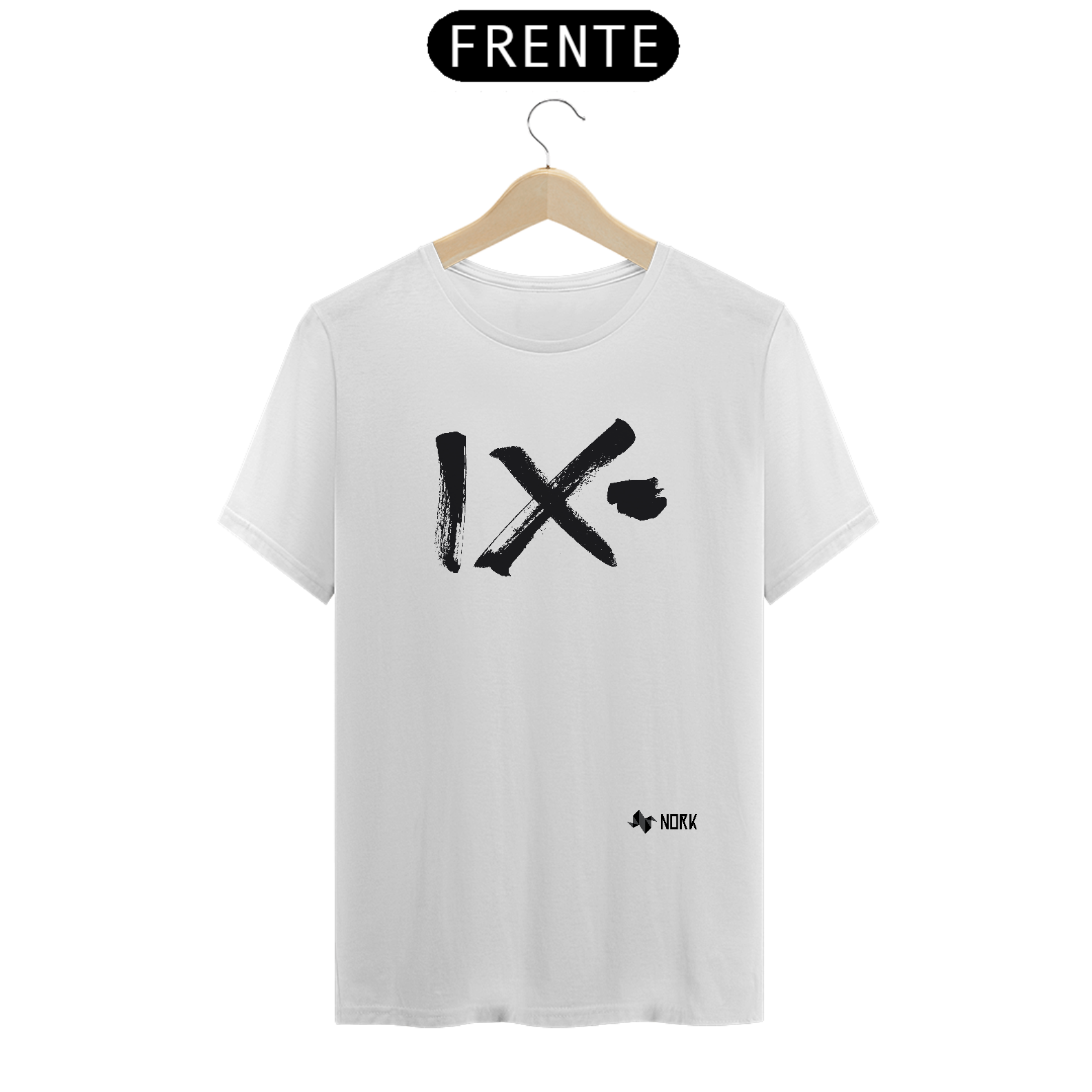 Três pinceladas marcantes em preto compõem a estampa: uma linha vertical texturizada à esquerda, seguida por um “X” de traços grossos que se cruzam com força e espontaneidade, e uma pequena pincelada flutuando ao lado. A disposição lembra caligrafia livre, carregando dinamismo e energia, em harmonia com o estilo arrojado e criativo da Coleção Nork Rabisco.