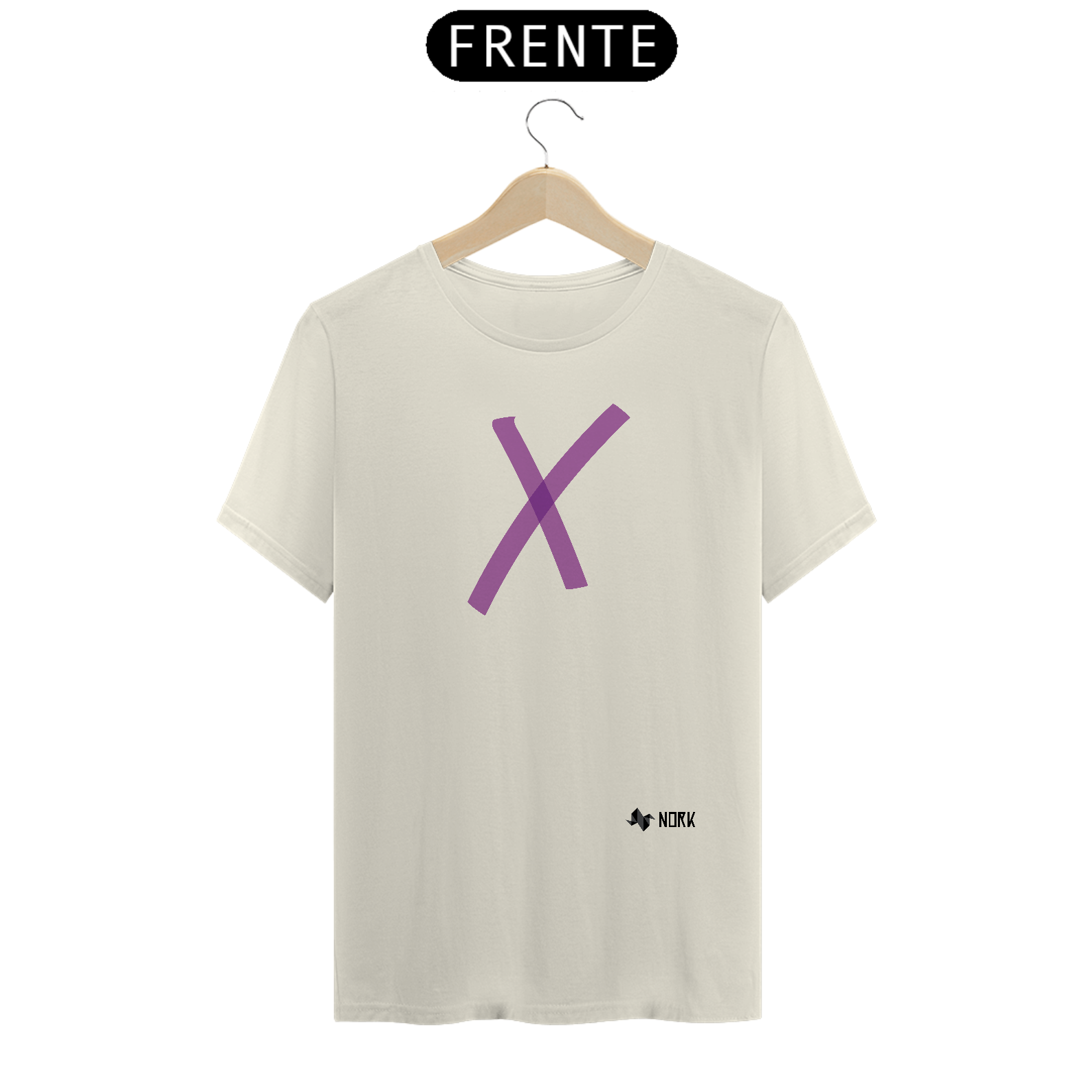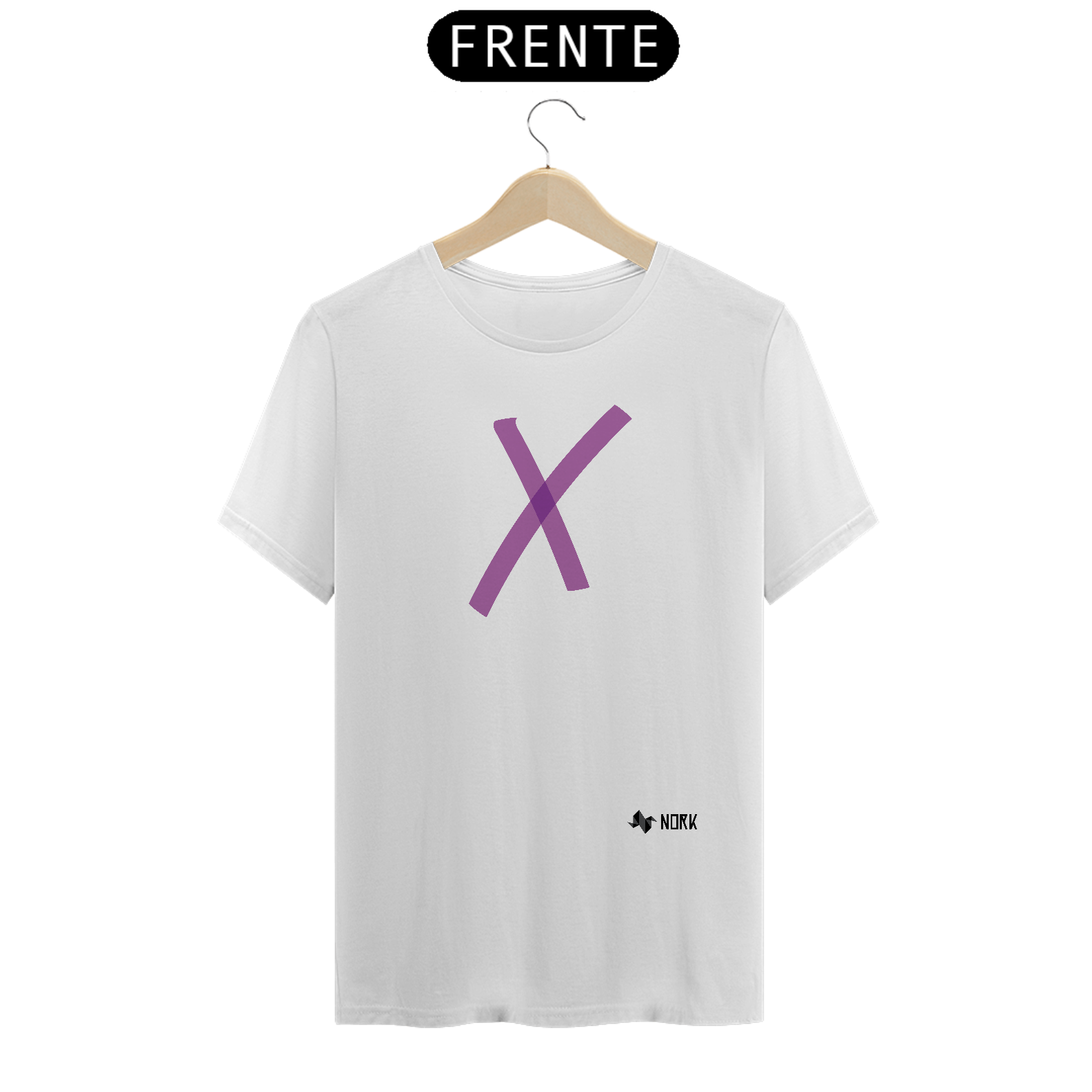 A estampa apresenta um "X" em tonalidade roxa translúcida, com linhas que se sobrepõem no centro, criando um efeito de profundidade e intensidade. O design minimalista evoca mensagens de destaque, escolha ou negação, permitindo interpretações subjetivas que variam entre o marcante e o enigmático. A cor roxa agrega um toque de sofisticação e mistério.