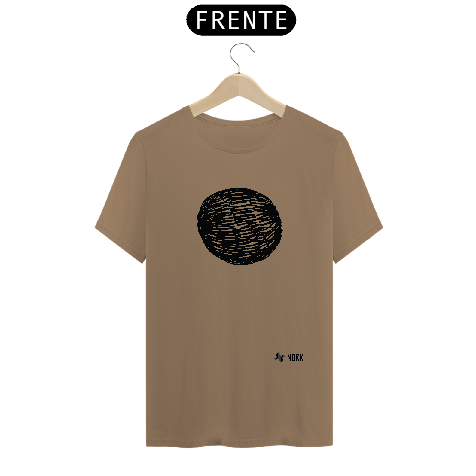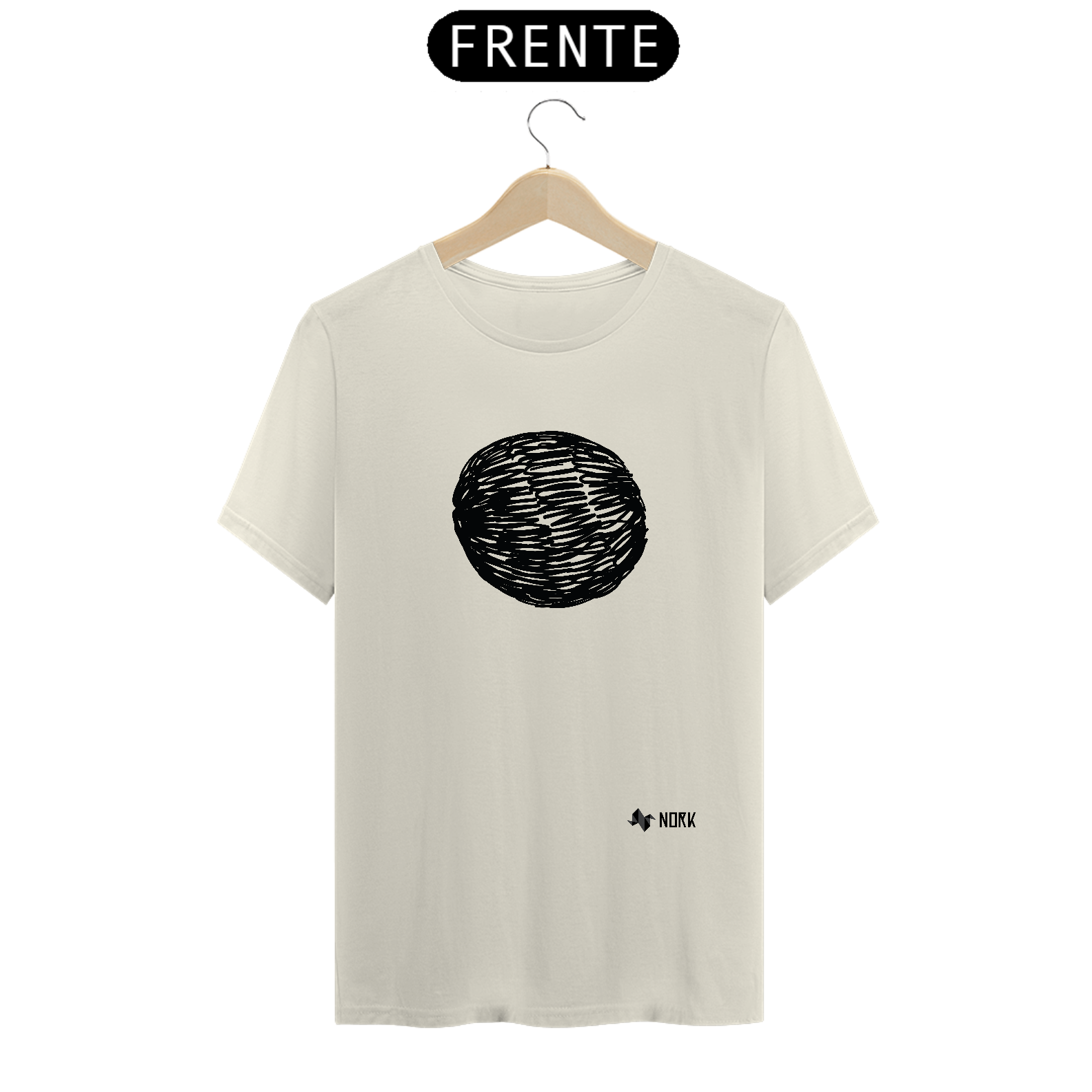 Uma forma oval criada a partir de linhas pretas sobrepostas, simulando um rabisco contínuo. As variações de traços e espaços entre eles conferem profundidade e movimento, como se fosse uma esfera abstrata. O estilo expressivo e solto reflete o espírito artístico e espontâneo da Coleção Nork Rabisco.