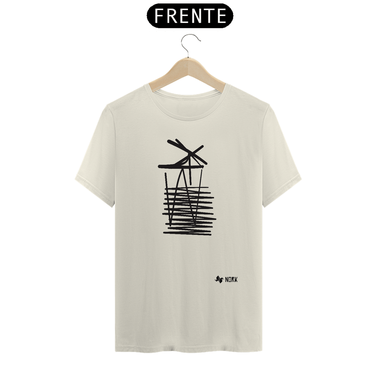 Esta estampa apresenta um conjunto de linhas sobrepostas que formam um padrão abstrato e caótico. Na parte superior, traços cruzados criam a impressão de um ponto de intersecção, enquanto linhas horizontais densamente empilhadas na base remetem a uma estrutura arquitetônica ou a uma grade desordenada. O design utiliza traços simples em preto sobre fundo branco, reforçando um estilo minimalista e expressivo, característico da Coleção Nork Rabisco.