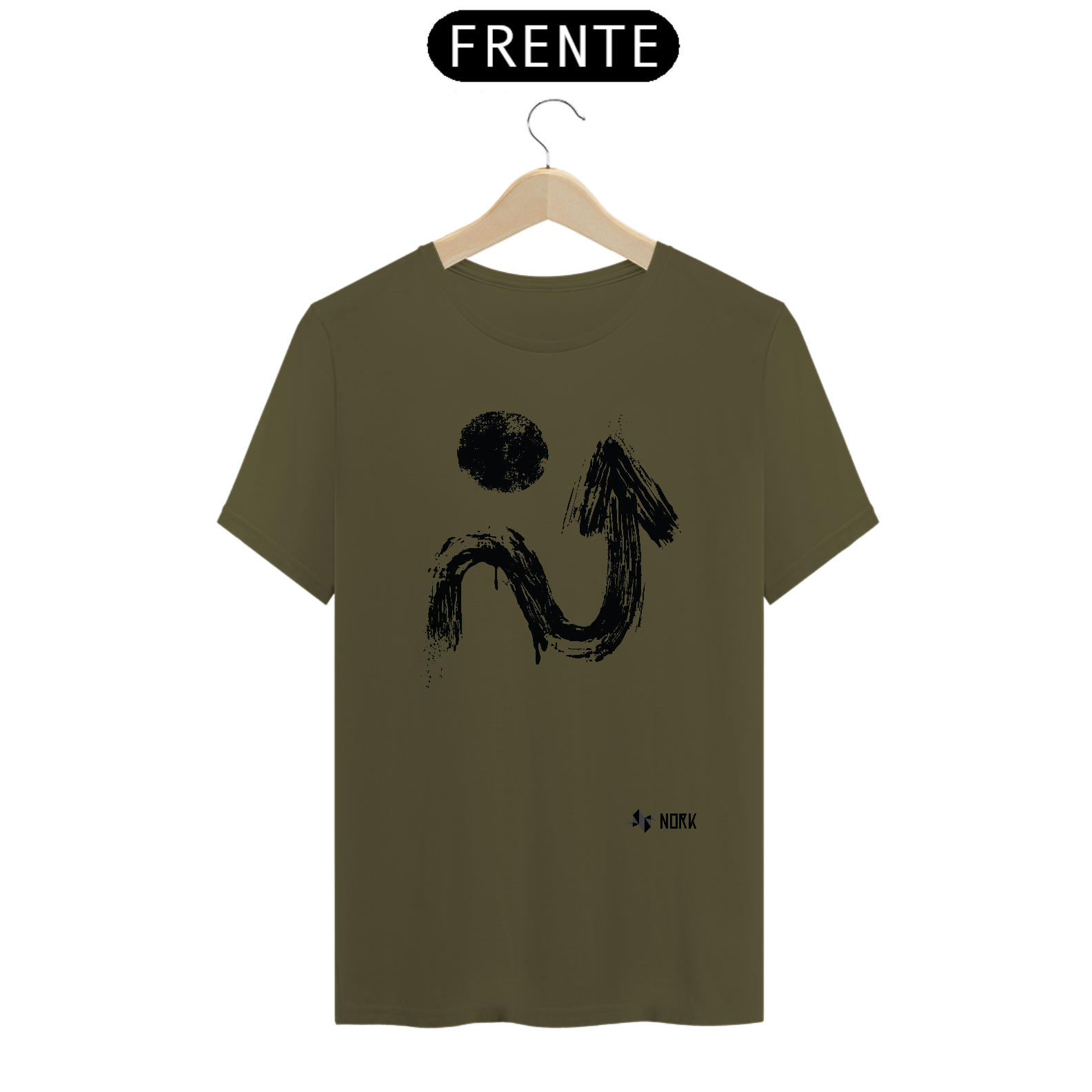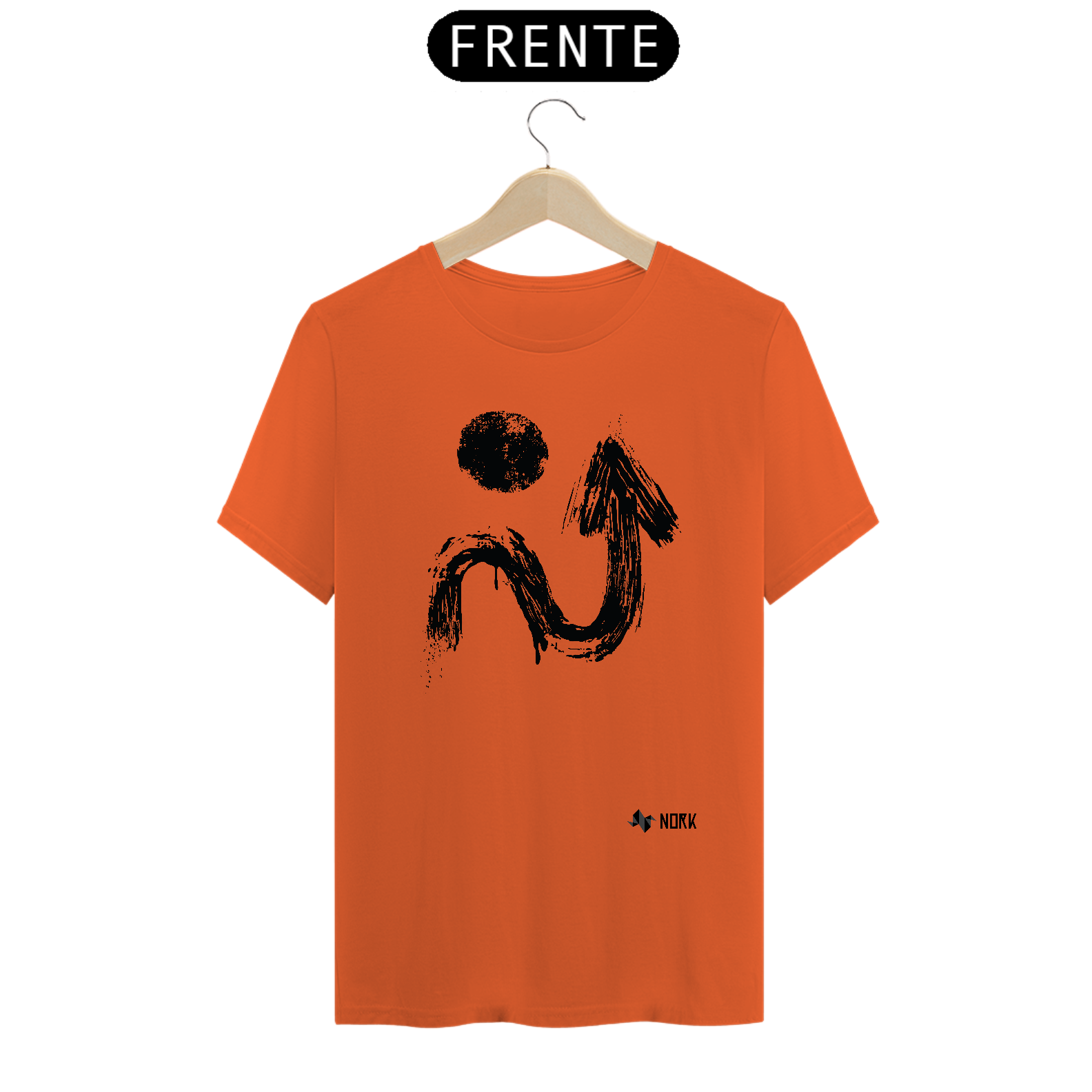 Esta arte utiliza o preto com pinceladas intensas e texturizadas que formam uma composição dinâmica. O círculo superior remete a um ponto focal ou ao conceito de um sol, enquanto a seta curva cria um movimento fluido, indicando ascensão ou transformação. O traço imperfeito e gotejante adiciona um ar de rebeldia e expressão artística.