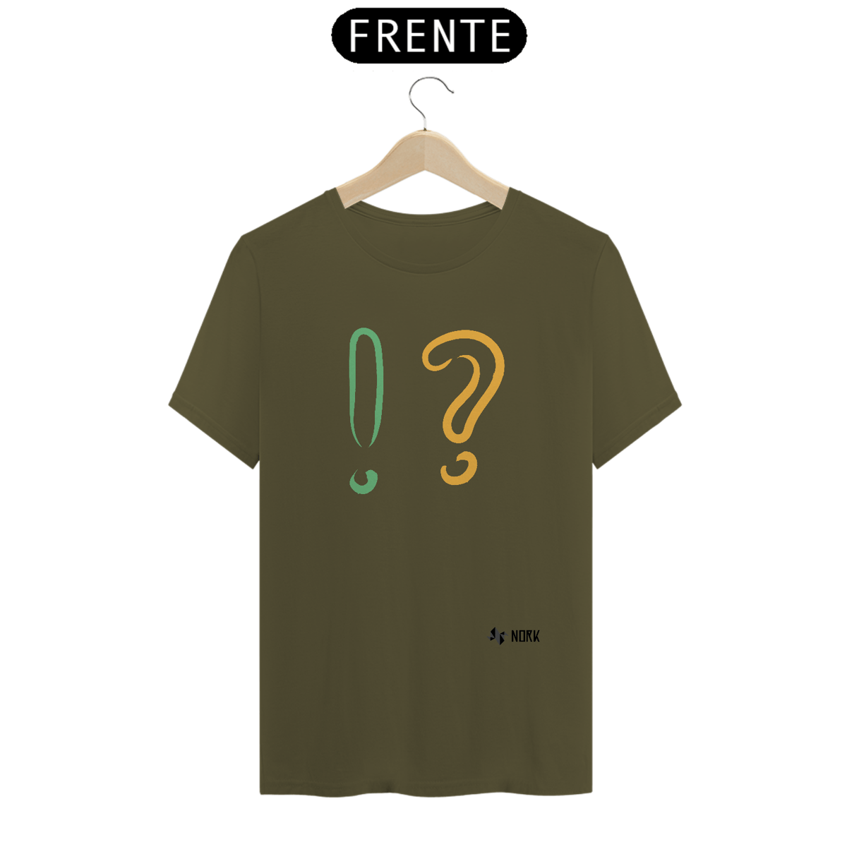 O design combina dois símbolos de pontuação destacados em um estilo fluido e simplificado: um ponto de exclamação verde à esquerda e um ponto de interrogação amarelo à direita. A composição sugere dualidade, curiosidade e intensidade, evocando emoções e questionamentos de maneira leve e moderna.