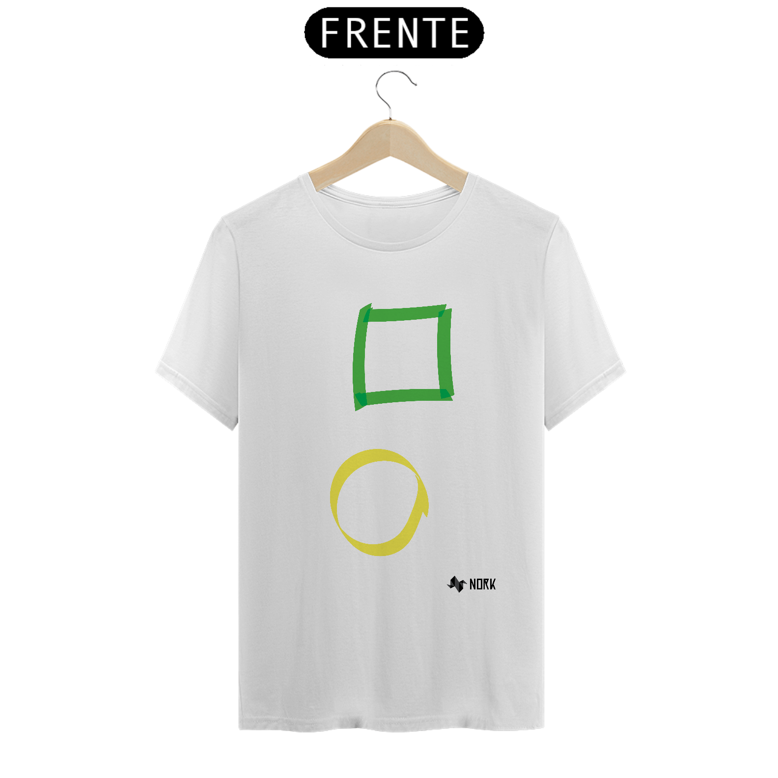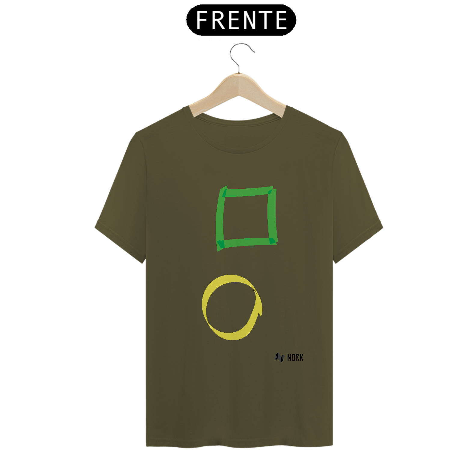 A arte apresenta duas formas geométricas simples, porém contrastantes. Na parte superior, um quadrado formado por traços verdes com estilo de fita, que transmite equilíbrio e estrutura. Na parte inferior, um círculo amarelo com acabamento fluido e dinâmico, simbolizando continuidade e energia. A combinação dessas figuras básicas em cores vibrantes cria uma composição que une ordem e movimento.