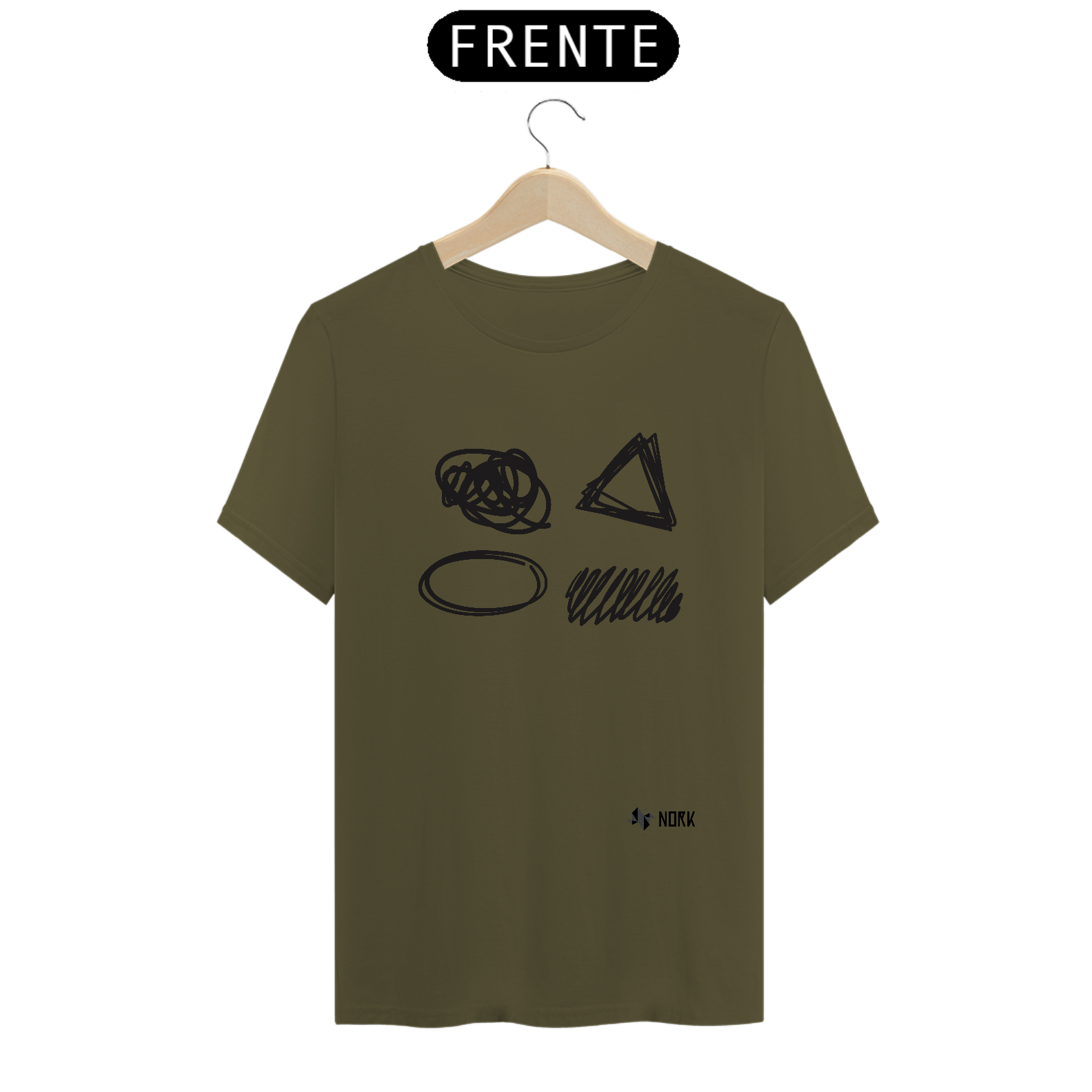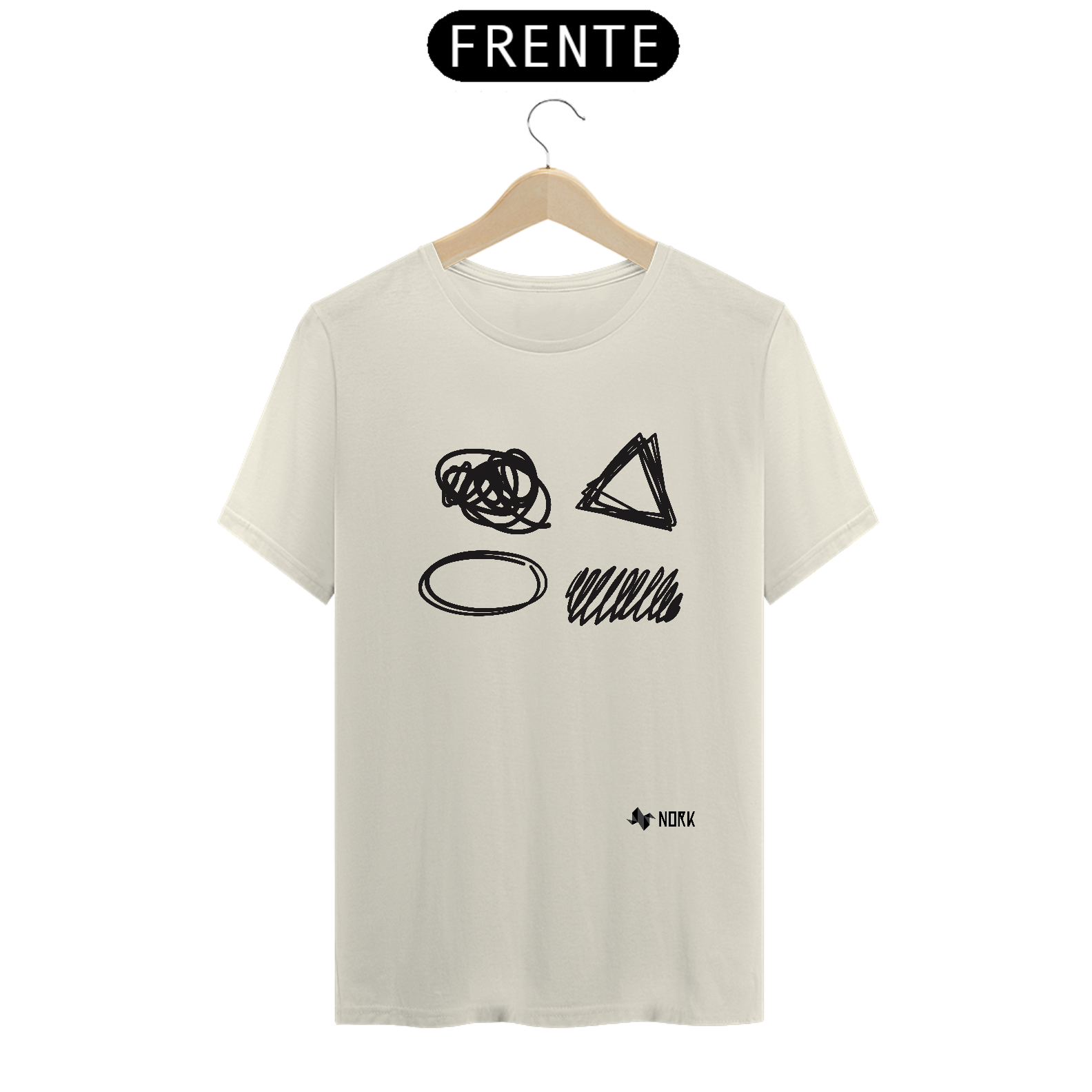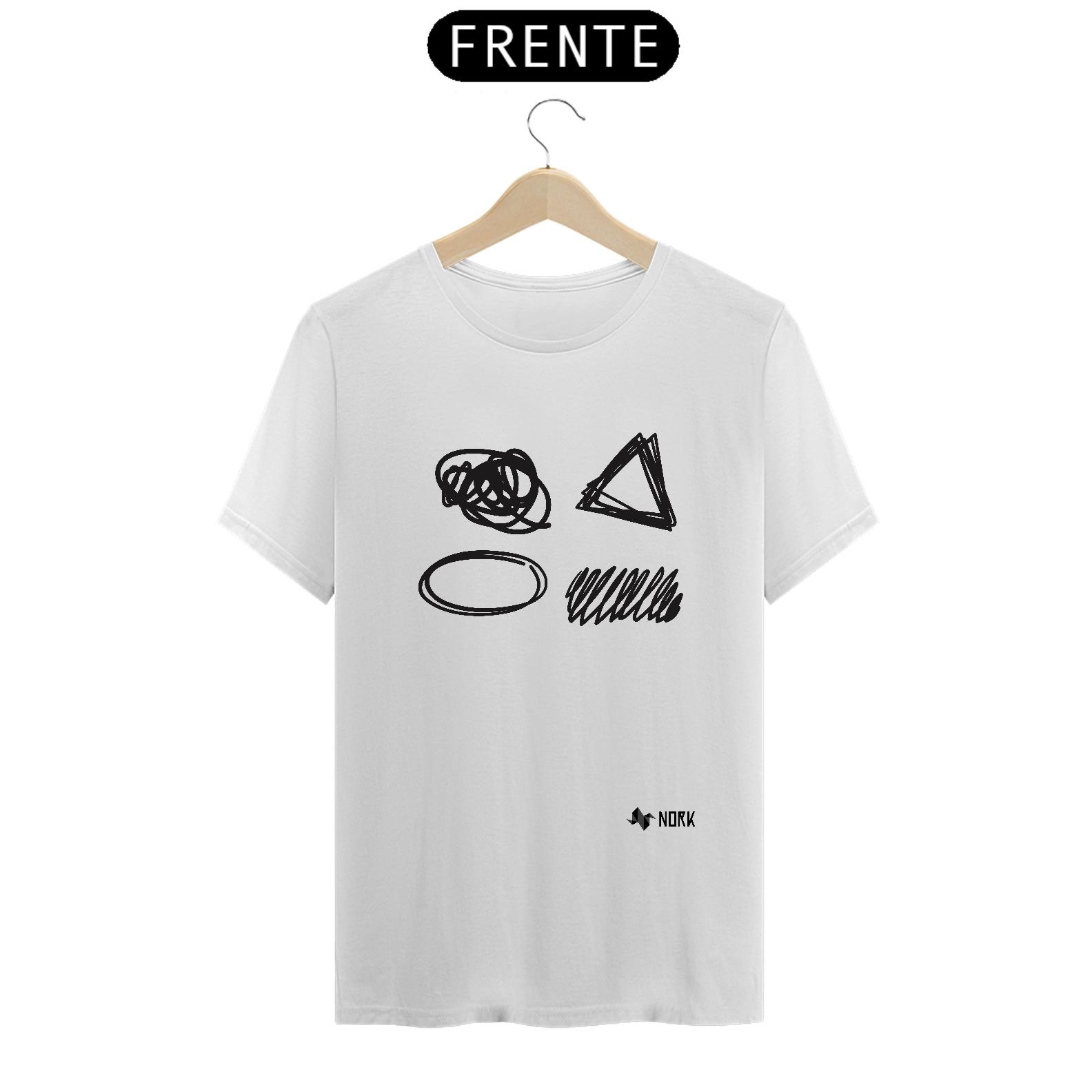 A estampa apresenta formas geométricas e orgânicas desenhadas com linhas irregulares e rabiscadas, incluindo um círculo, um triângulo, uma forma oval e um conjunto de traços diagonais. A composição brinca com o contraste entre precisão e casualidade, criando uma atmosfera de liberdade criativa e expressão abstrata. O fundo branco ressalta os traços pretos, garantindo dest