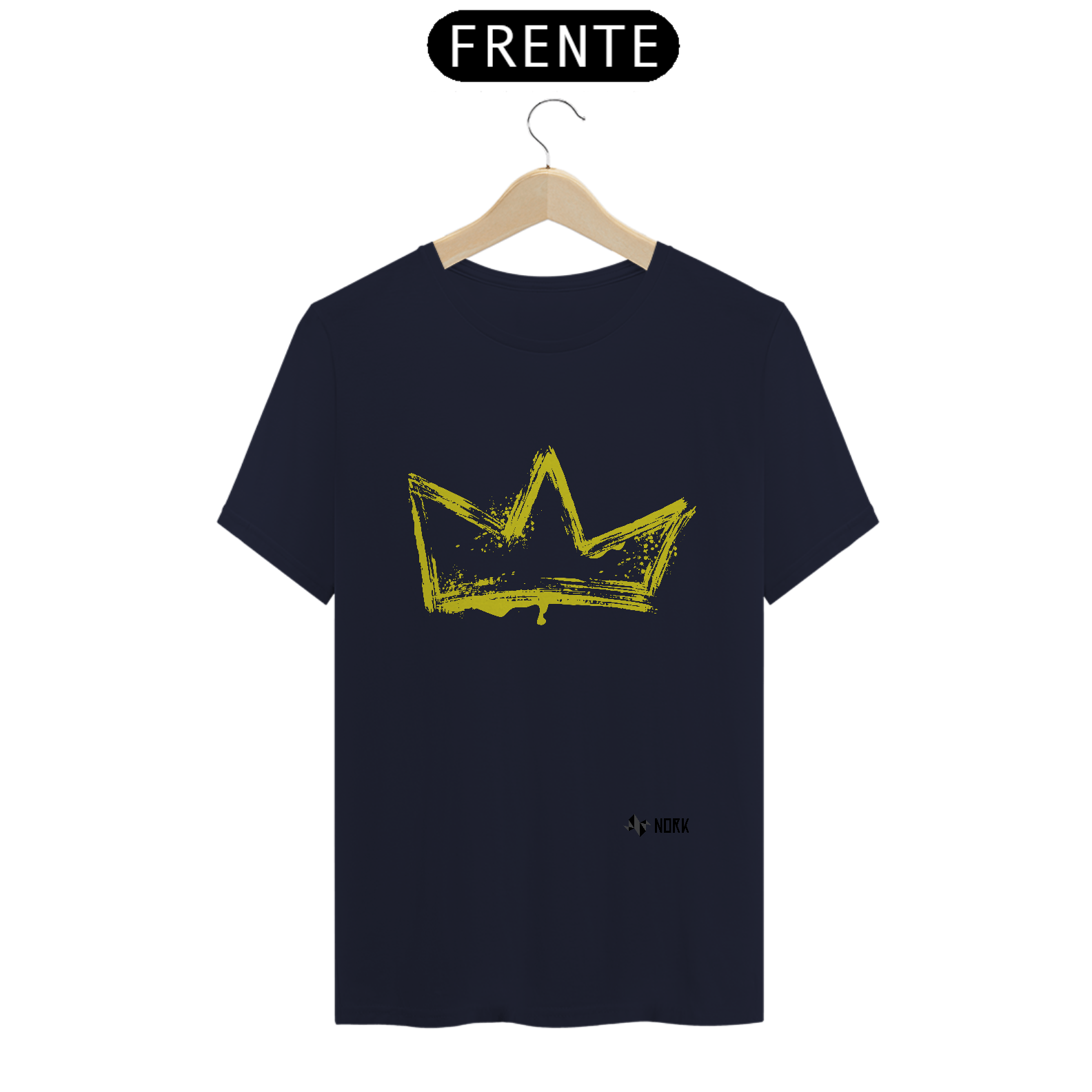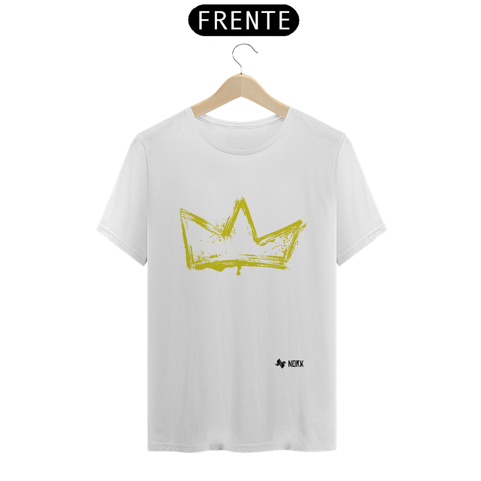 A estampa apresenta uma coroa dourada com traços rústicos e texturizados, transmitindo uma estética contemporânea e urbana. O detalhe das manchas e respingos adiciona uma energia artística, destacando a realeza de forma despretensiosa e moderna. A cor dourada reforça a ideia de valor, excelência e destaque.