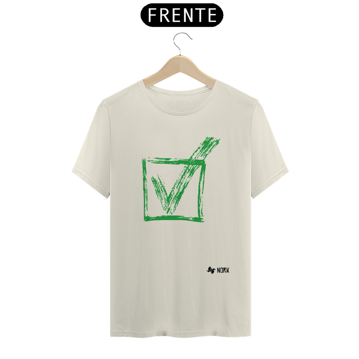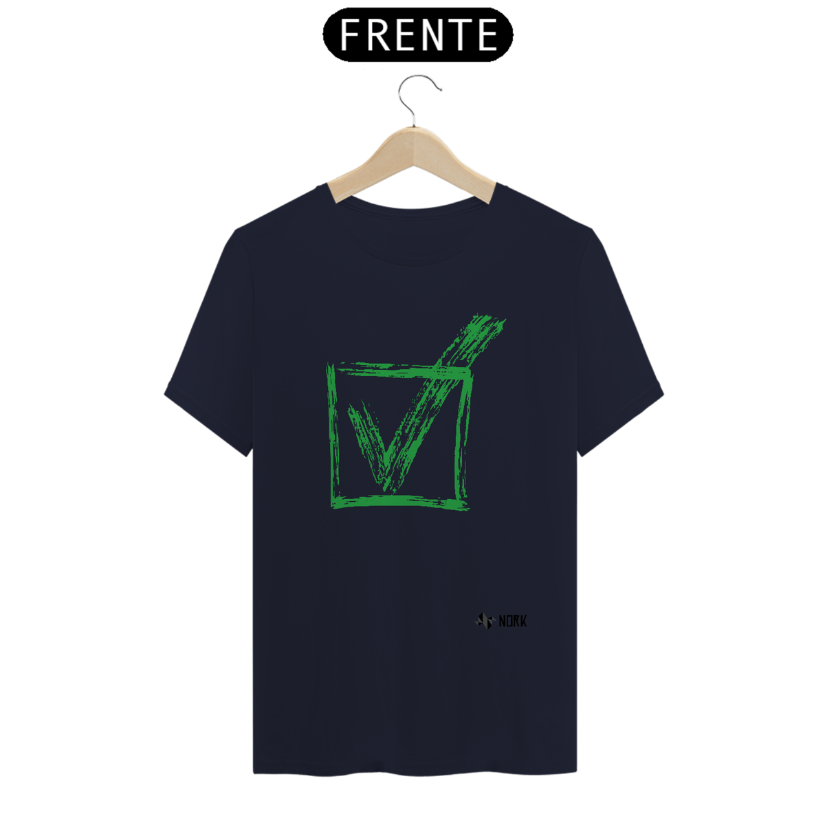 A estampa apresenta um check verde texturizado dentro de um quadrado também verde. O traço rústico dá um toque descontraído e autêntico ao design, enquanto a cor verde transmite positividade, confirmação e sustentabilidade. Este símbolo evoca a ideia de aprovação, sucesso e compromisso com valores claros.