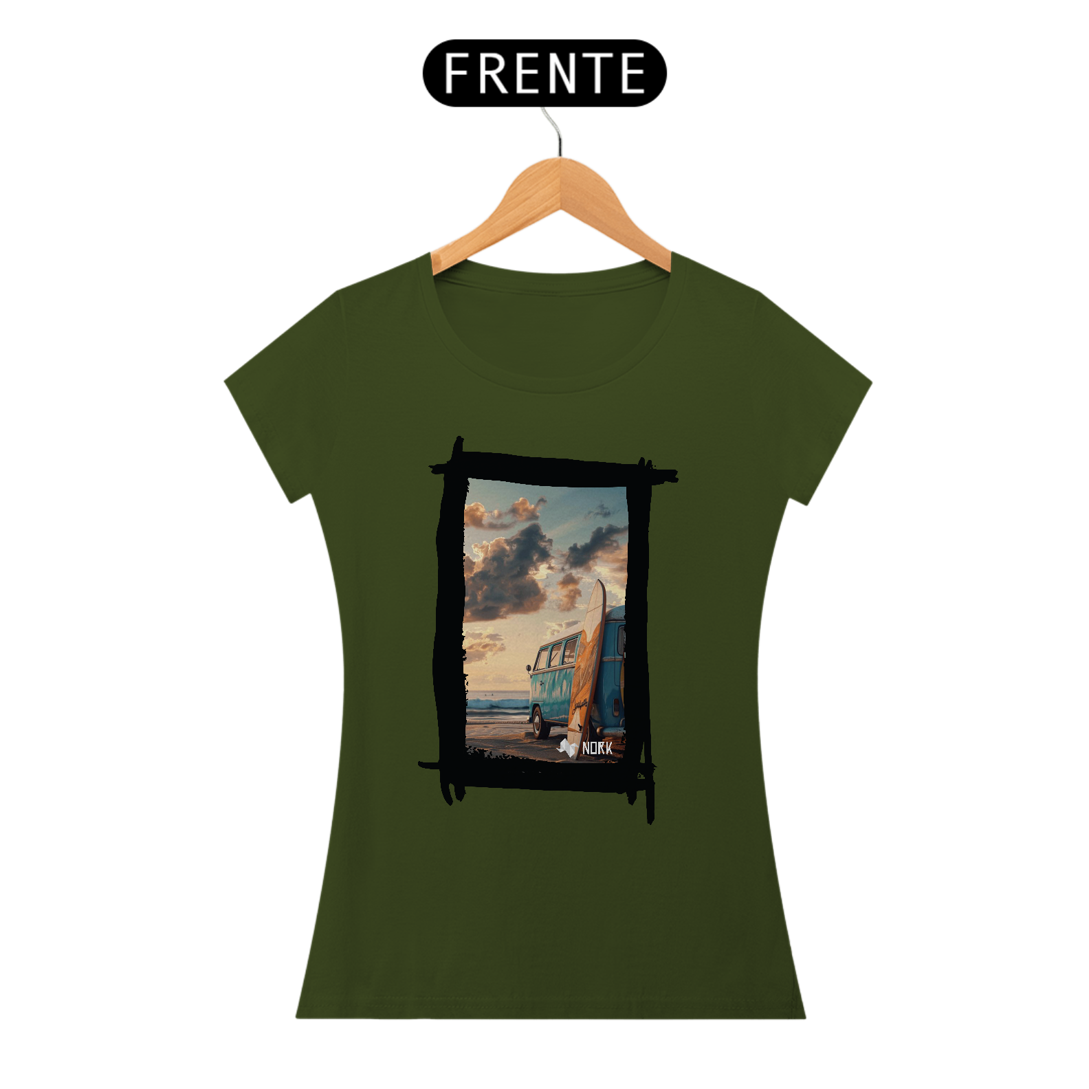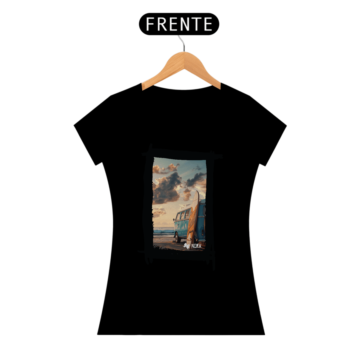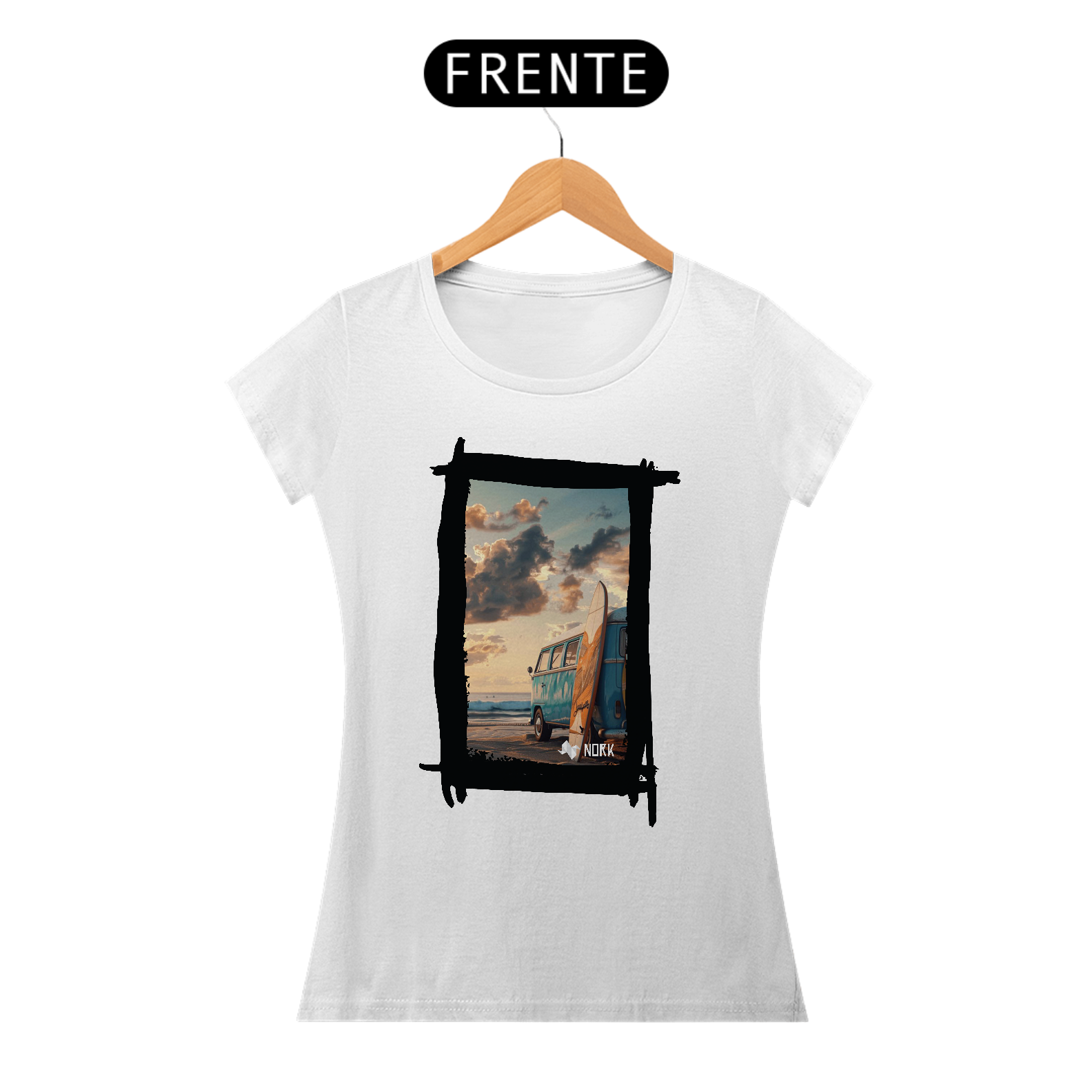 A camisa apresenta uma arte que encapsula o espírito de aventura e liberdade característicos do estilo de vida praiano. A composição destaca uma clássica van azul estacionada na praia ao entardecer, com uma prancha de surfe encostada em sua lateral. O cenário transmite tranquilidade e nostalgia, com um céu repleto de nuvens douradas e um mar calmo ao fundo, evocando momentos de conexão com a natureza e a busca por ondas perfeitas. O design traz um equilíbrio entre o minimalismo da cena e a riqueza dos detalhes, ideal para quem valoriza estilo e autenticidade. O logo da Nork aparece discretamente na parte inferior, reforçando a exclusividade da peça.