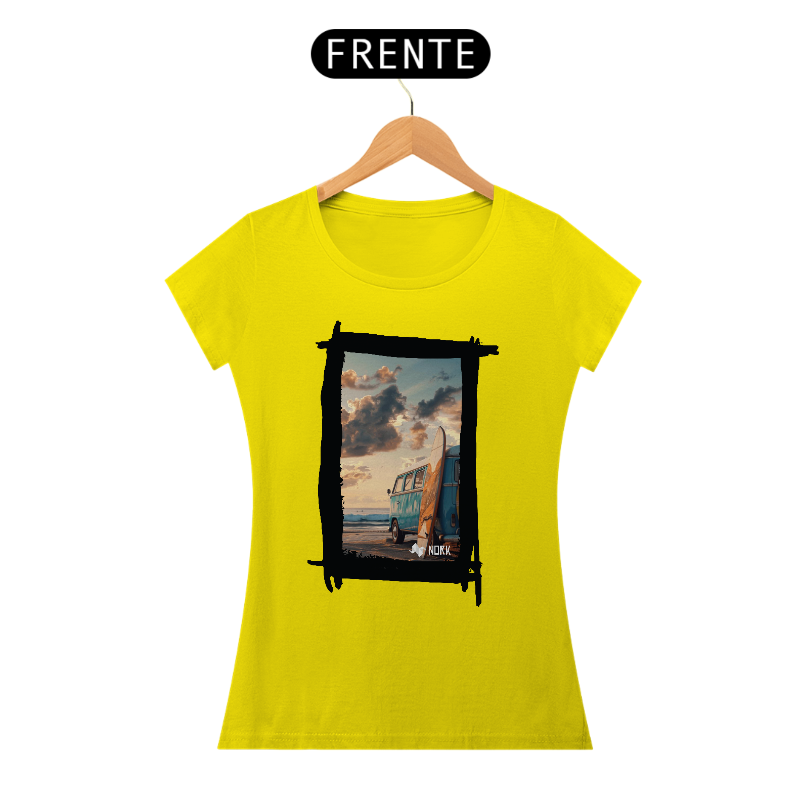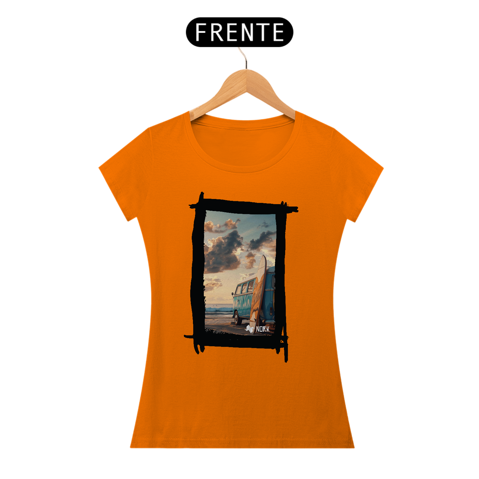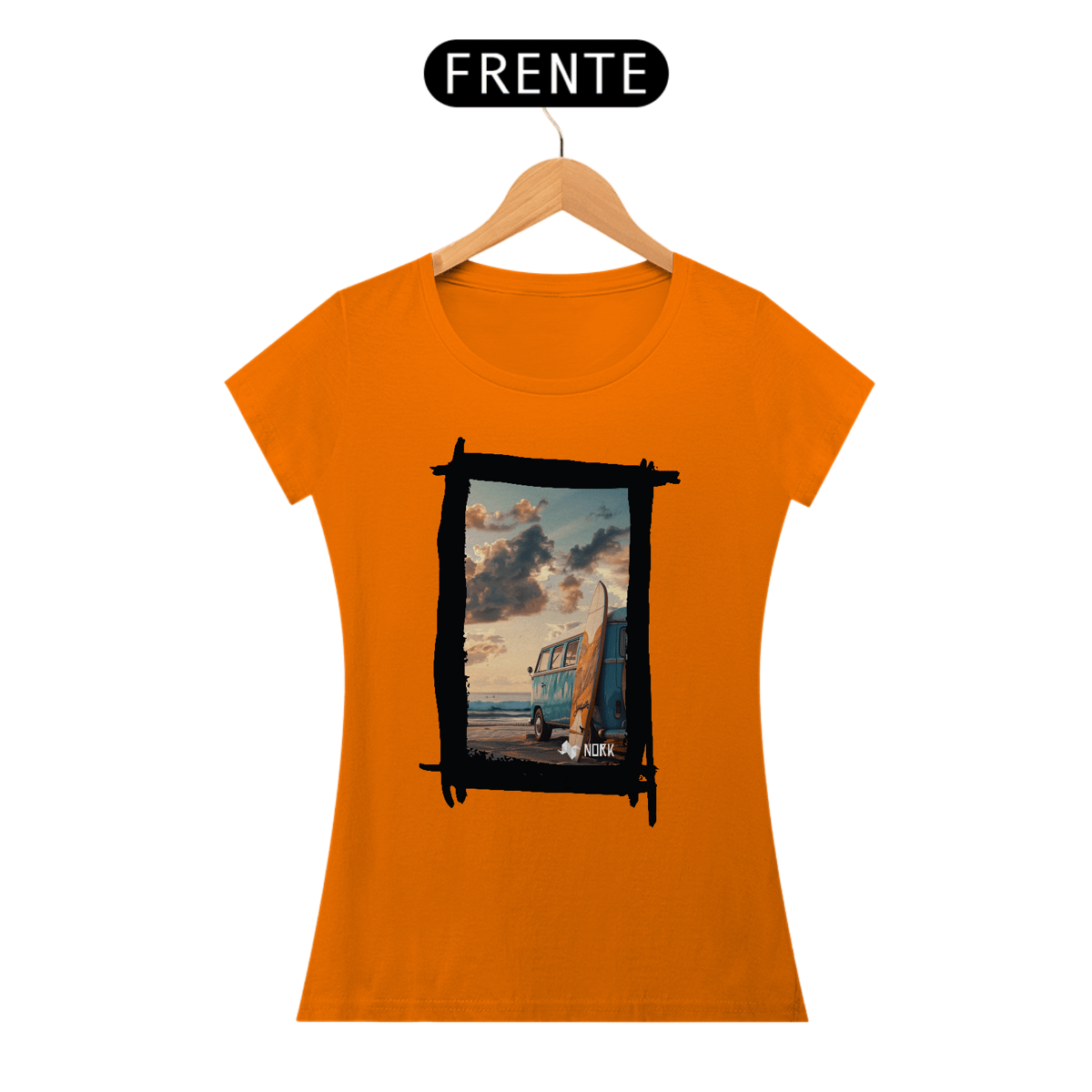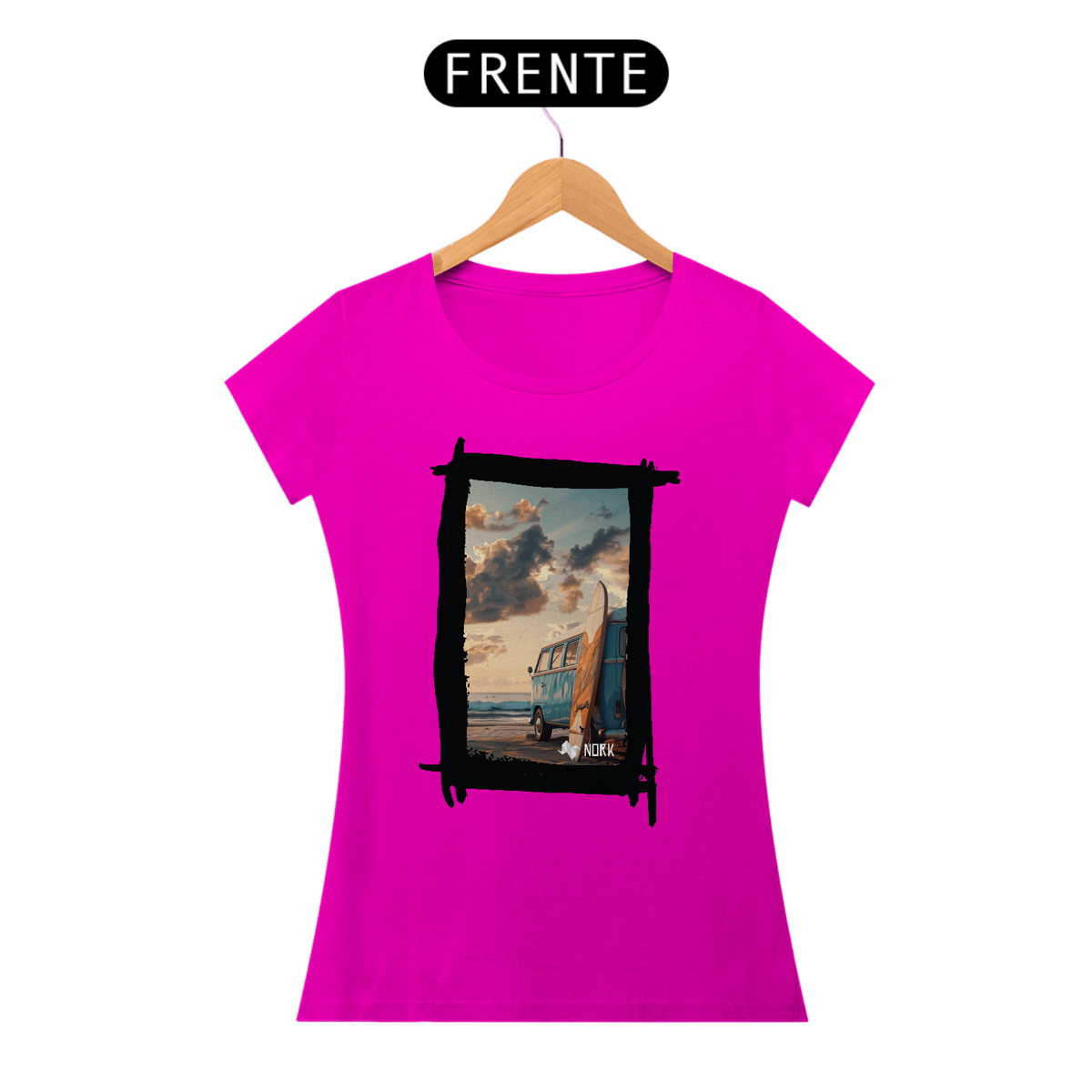 A camisa apresenta uma arte que encapsula o espírito de aventura e liberdade característicos do estilo de vida praiano. A composição destaca uma clássica van azul estacionada na praia ao entardecer, com uma prancha de surfe encostada em sua lateral. O cenário transmite tranquilidade e nostalgia, com um céu repleto de nuvens douradas e um mar calmo ao fundo, evocando momentos de conexão com a natureza e a busca por ondas perfeitas. O design traz um equilíbrio entre o minimalismo da cena e a riqueza dos detalhes, ideal para quem valoriza estilo e autenticidade. O logo da Nork aparece discretamente na parte inferior, reforçando a exclusividade da peça.