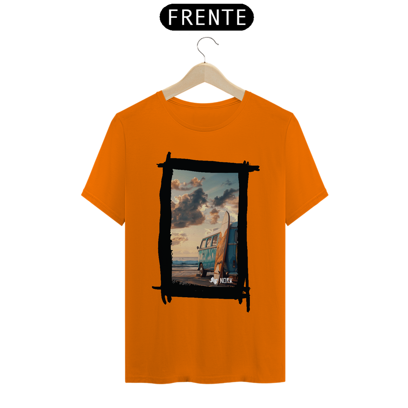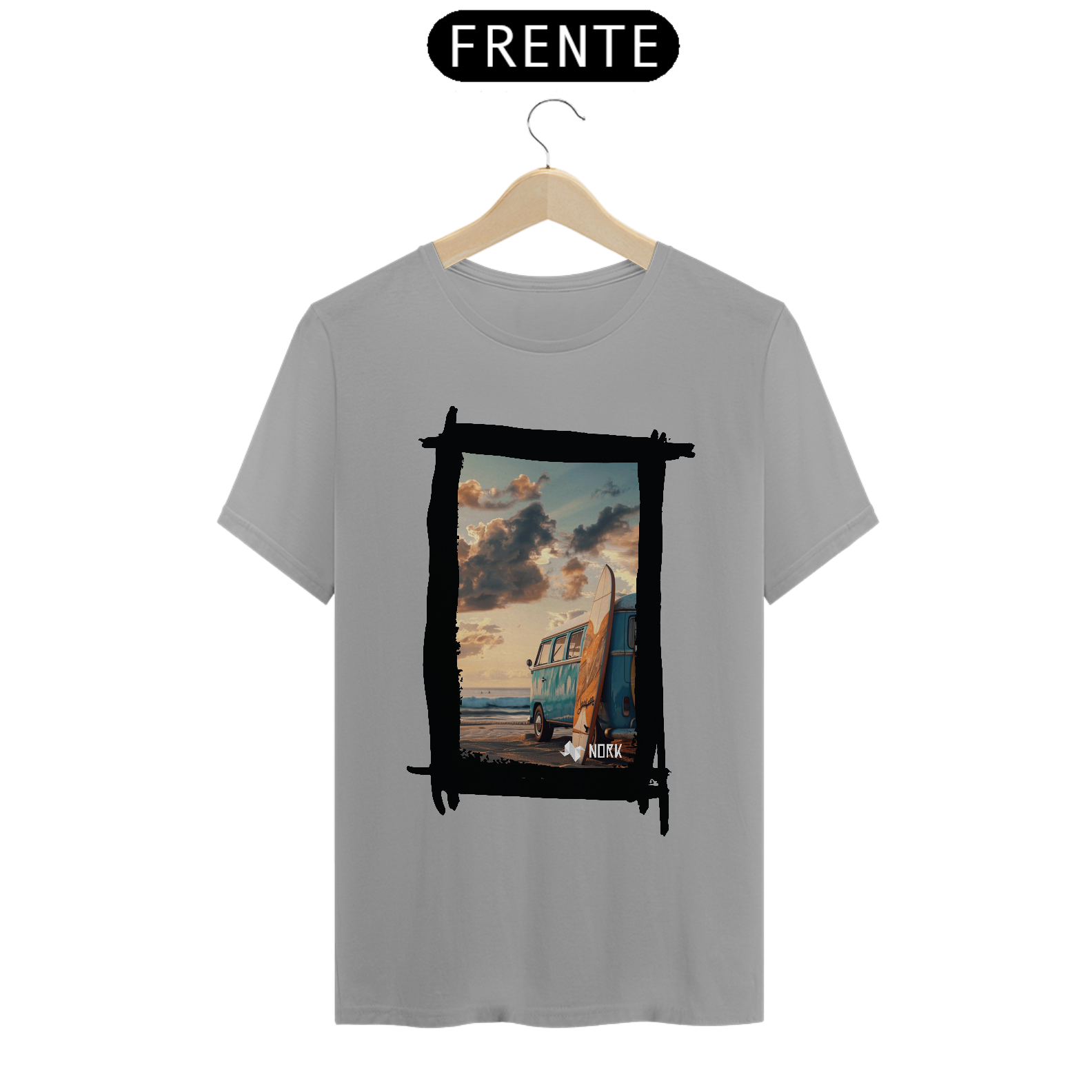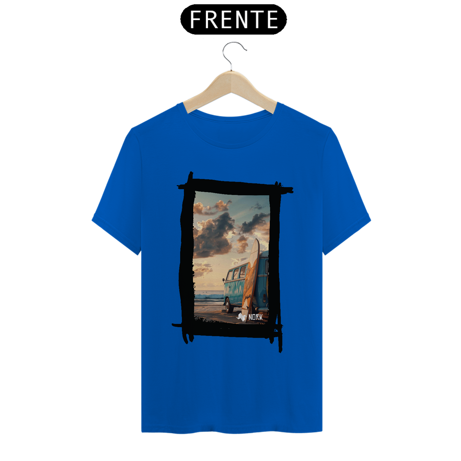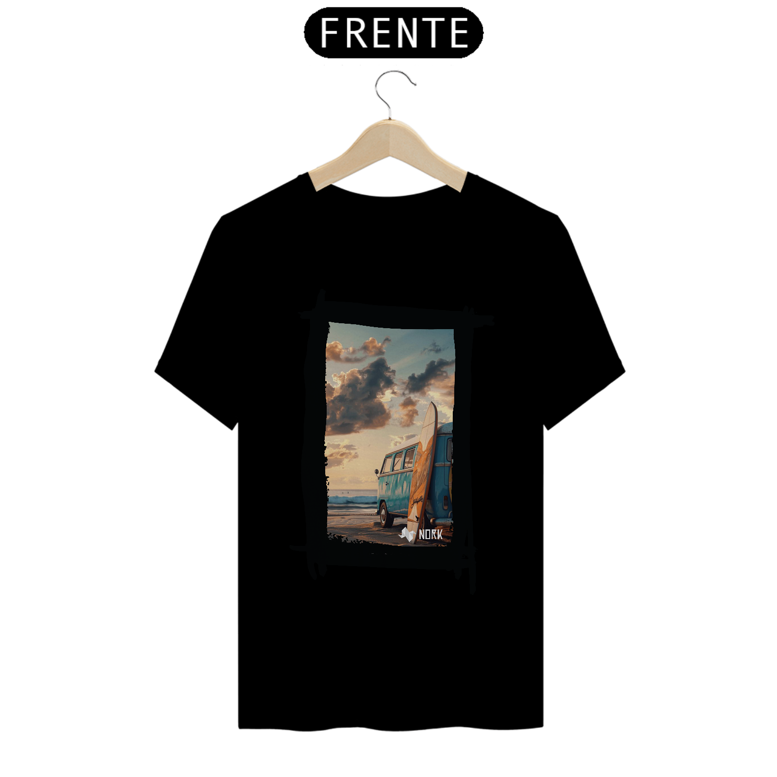 A camisa apresenta uma arte que encapsula o espírito de aventura e liberdade característicos do estilo de vida praiano. A composição destaca uma clássica van azul estacionada na praia ao entardecer, com uma prancha de surfe encostada em sua lateral. O cenário transmite tranquilidade e nostalgia, com um céu repleto de nuvens douradas e um mar calmo ao fundo, evocando momentos de conexão com a natureza e a busca por ondas perfeitas. O design traz um equilíbrio entre o minimalismo da cena e a riqueza dos detalhes, ideal para quem valoriza estilo e autenticidade. O logo da Nork aparece discretamente na parte inferior, reforçando a exclusividade da peça.