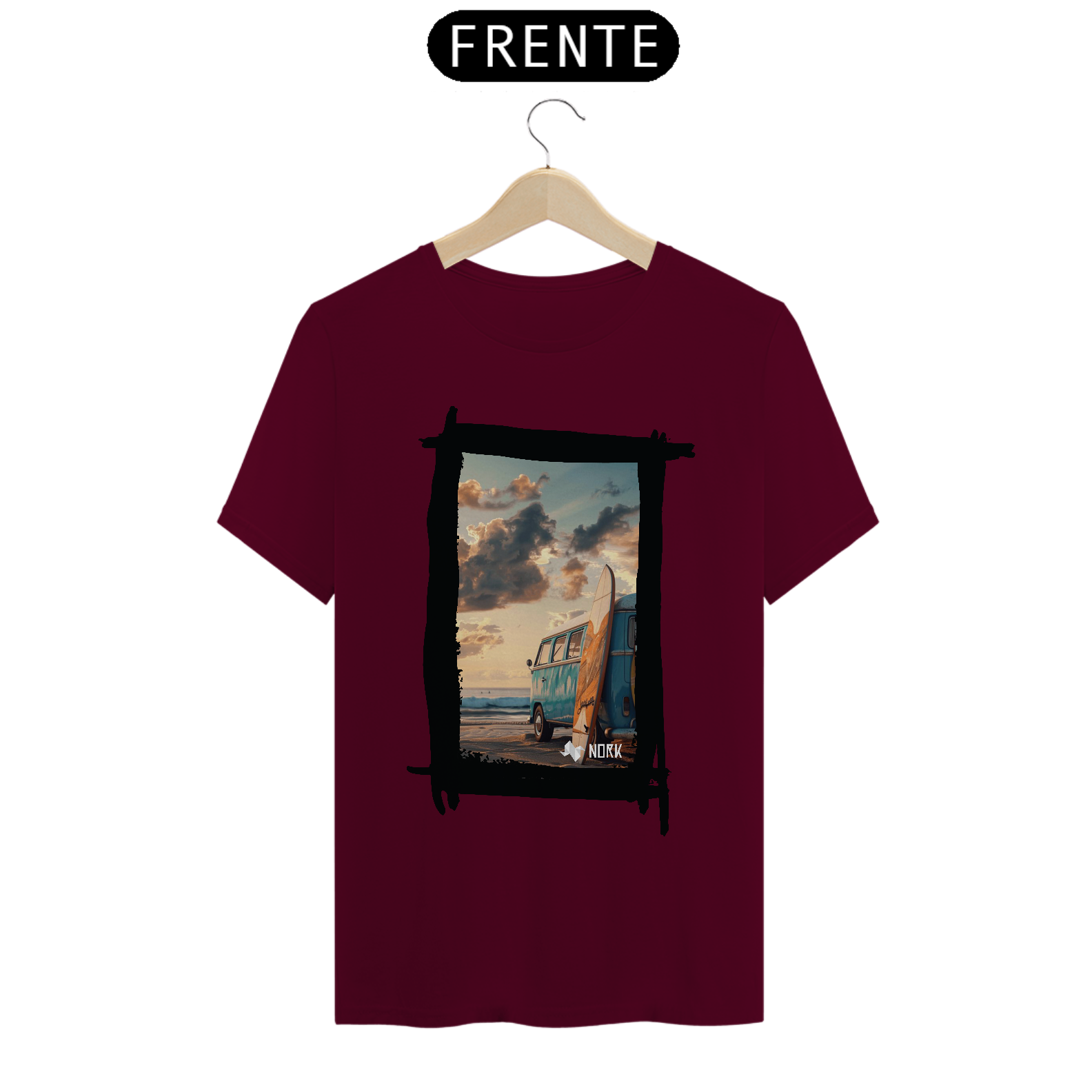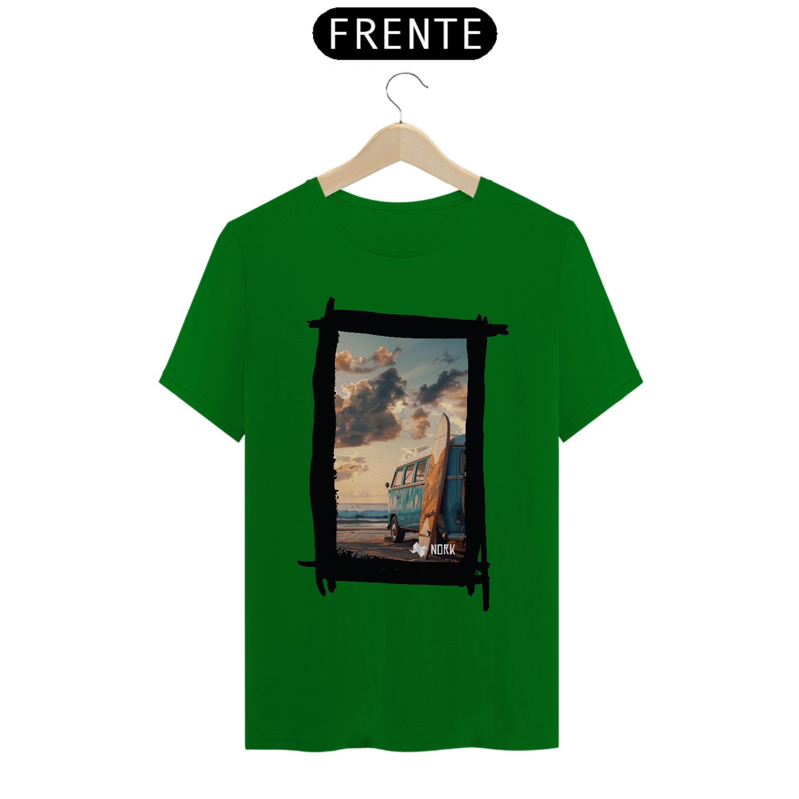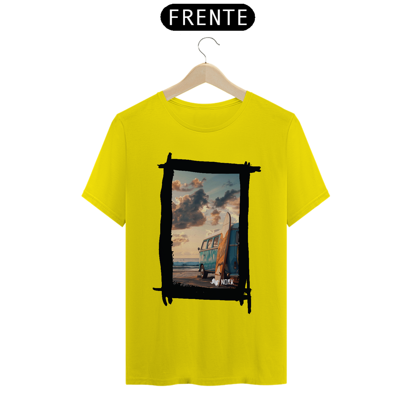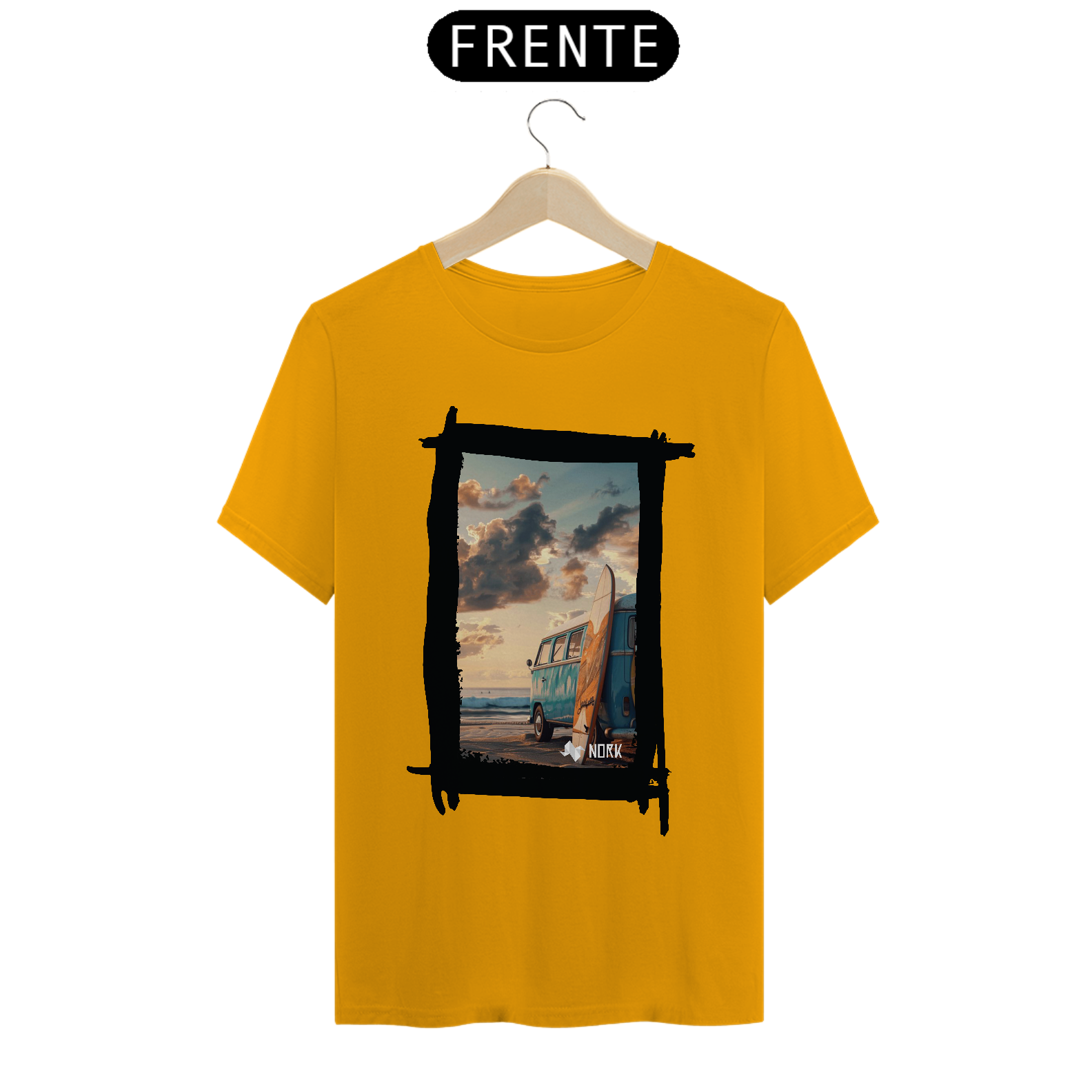 A camisa apresenta uma arte que encapsula o espírito de aventura e liberdade característicos do estilo de vida praiano. A composição destaca uma clássica van azul estacionada na praia ao entardecer, com uma prancha de surfe encostada em sua lateral. O cenário transmite tranquilidade e nostalgia, com um céu repleto de nuvens douradas e um mar calmo ao fundo, evocando momentos de conexão com a natureza e a busca por ondas perfeitas. O design traz um equilíbrio entre o minimalismo da cena e a riqueza dos detalhes, ideal para quem valoriza estilo e autenticidade. O logo da Nork aparece discretamente na parte inferior, reforçando a exclusividade da peça.