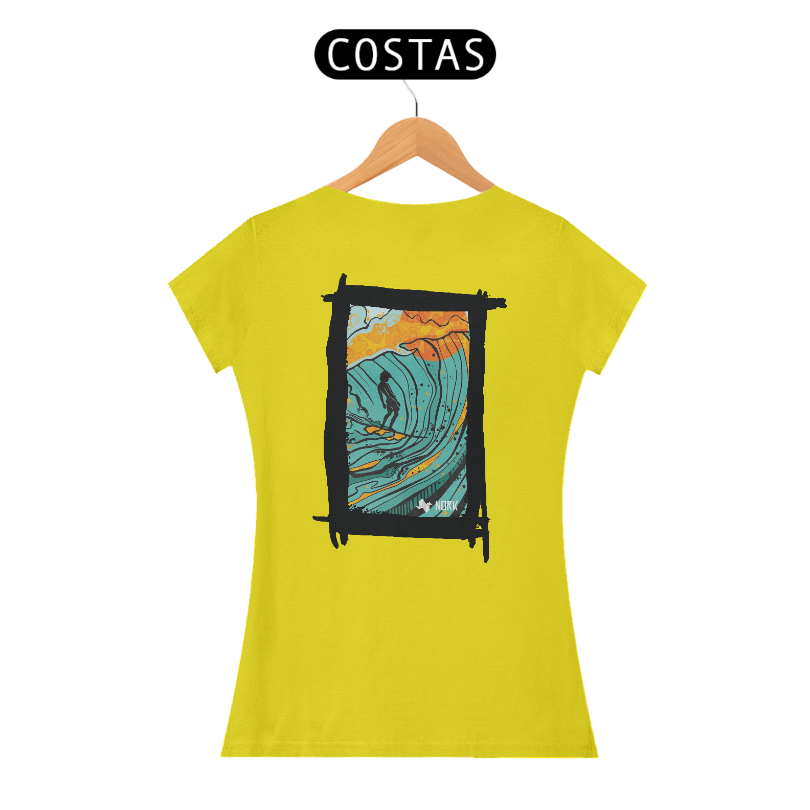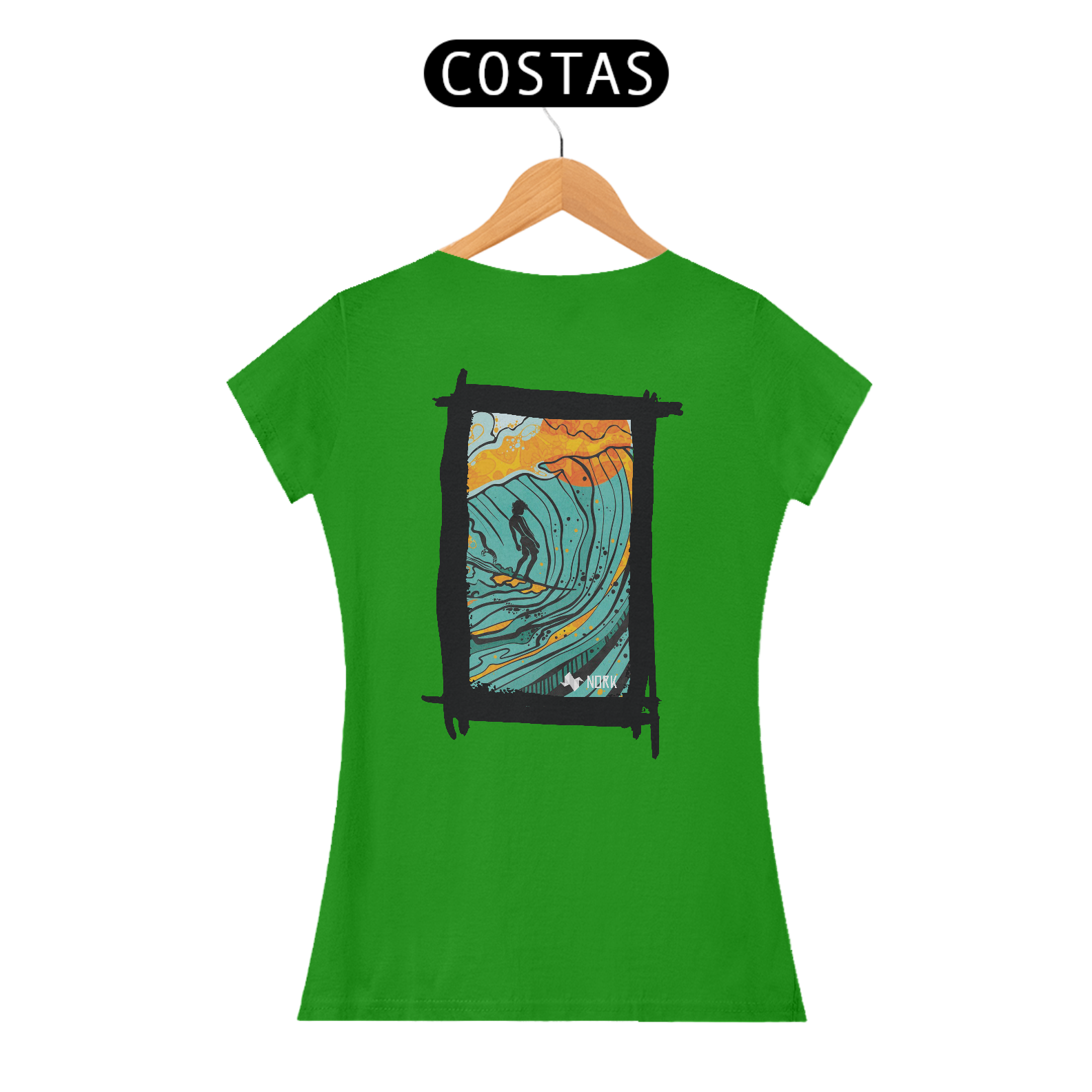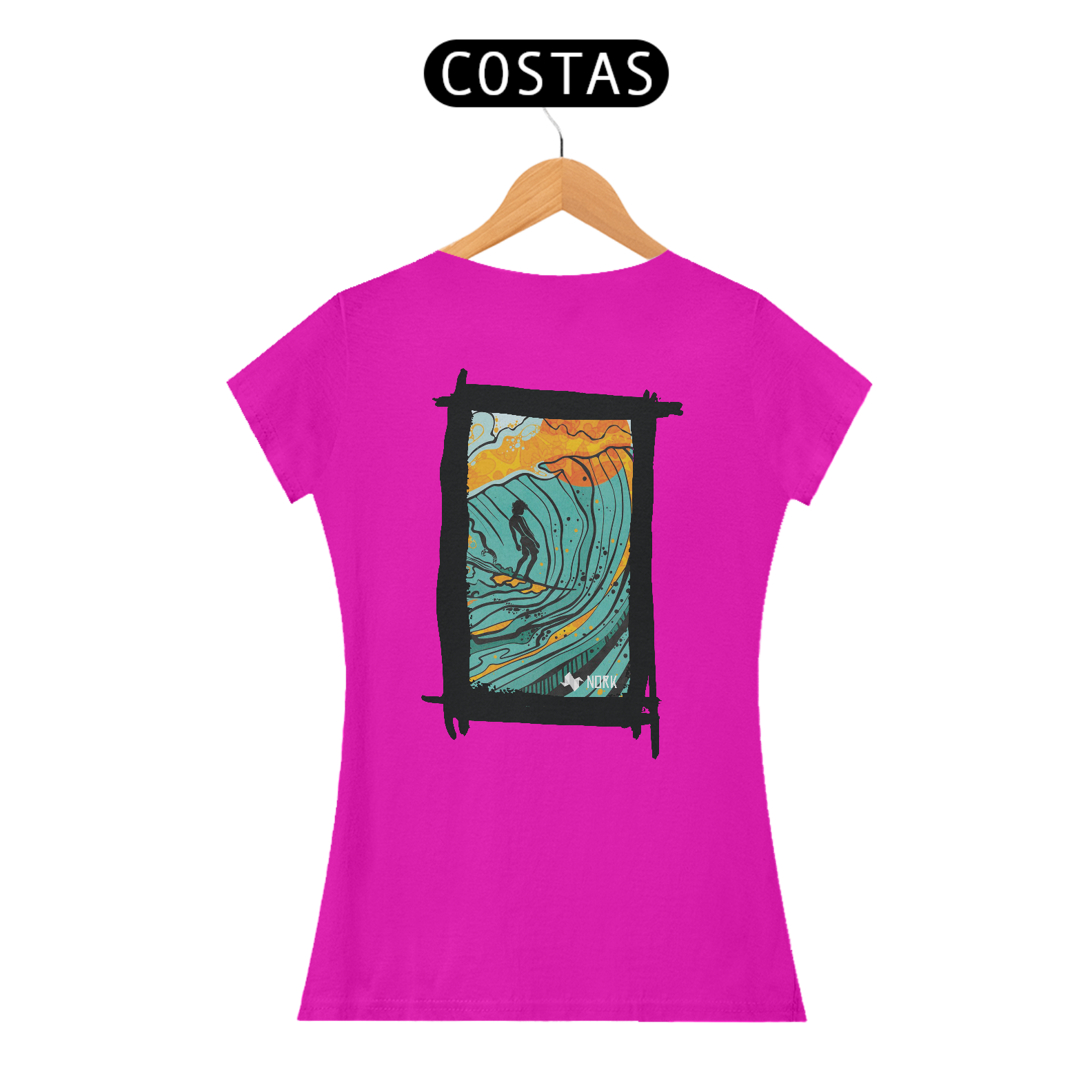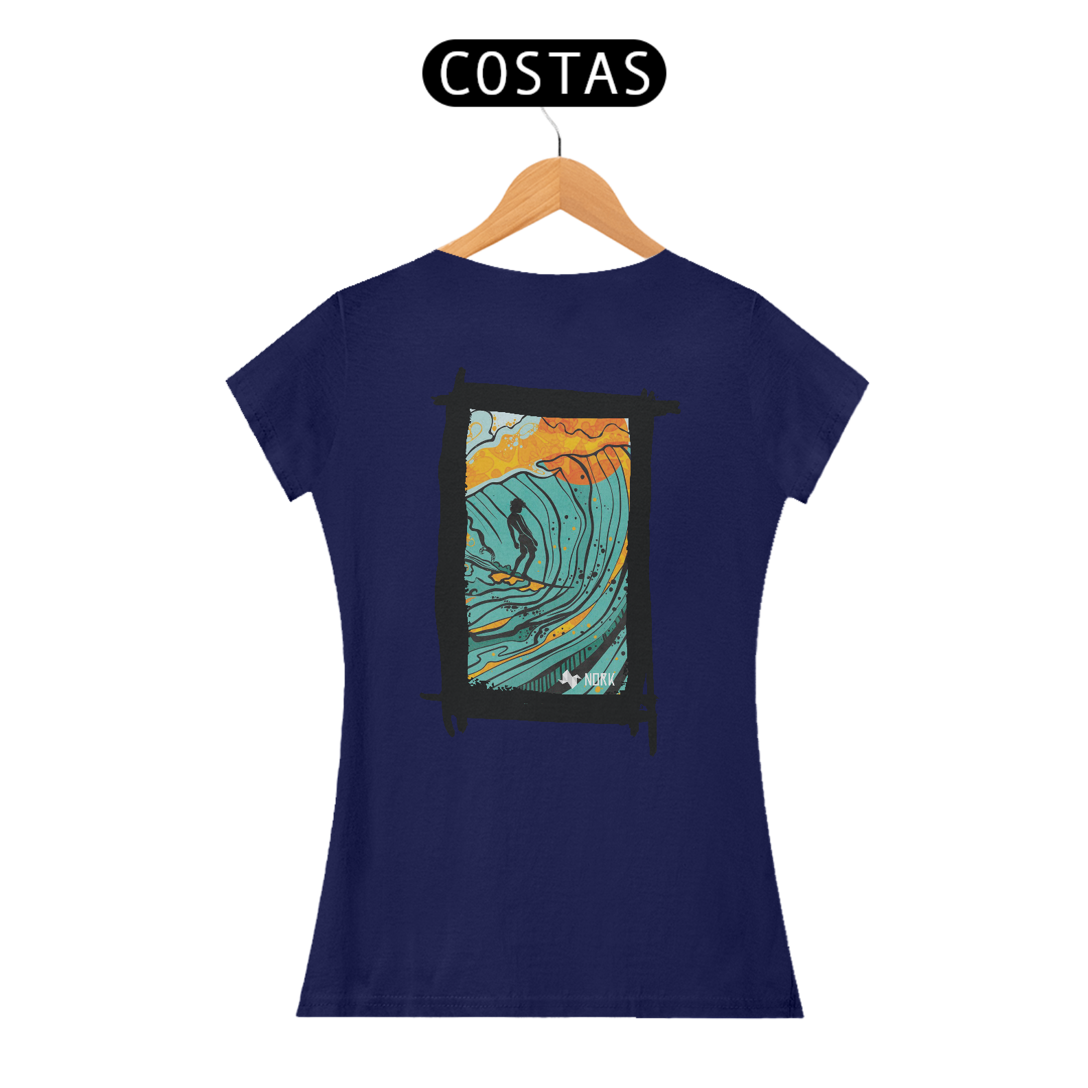 A camisa apresenta uma arte moderna e cheia de energia que celebra a essência do surfe. A composição traz a silhueta de um surfista deslizando com estilo em uma onda gigante, representada por linhas fluidas em tons de azul e turquesa, que criam uma sensação de movimento e liberdade. O fundo é dominado por um sol intenso em tons de laranja e amarelo, contrastando com o azul da água e adicionando calor à cena. Detalhes em preto e respingos de cores vibrantes enriquecem o design, conferindo dinamismo e modernidade. O visual captura a emoção e a conexão com o oceano, ideal para quem vive o espírito surfista. O logo da Nork está discretamente posicionado na parte inferior, complementando o design com sofisticação.