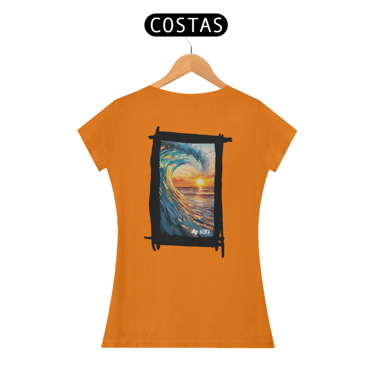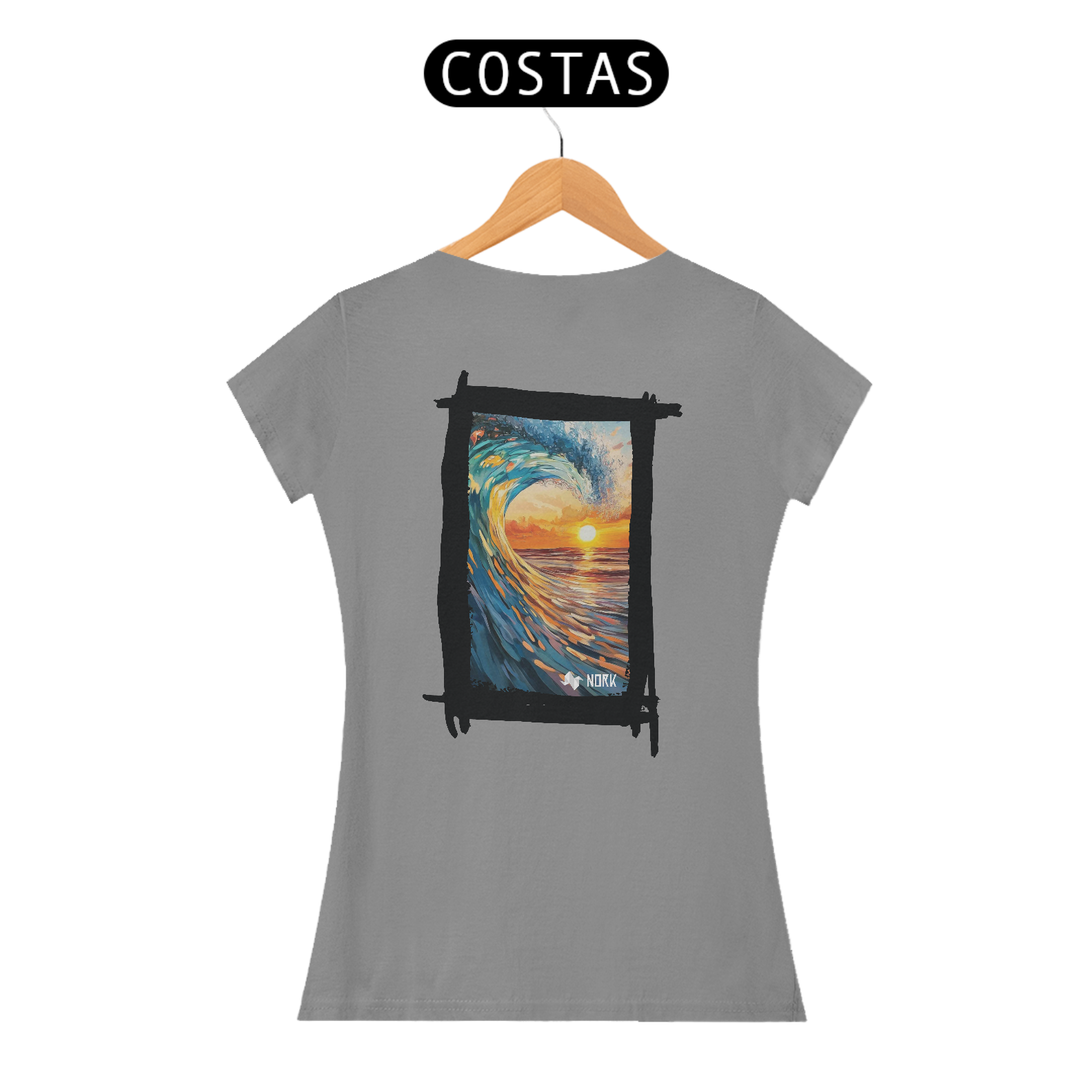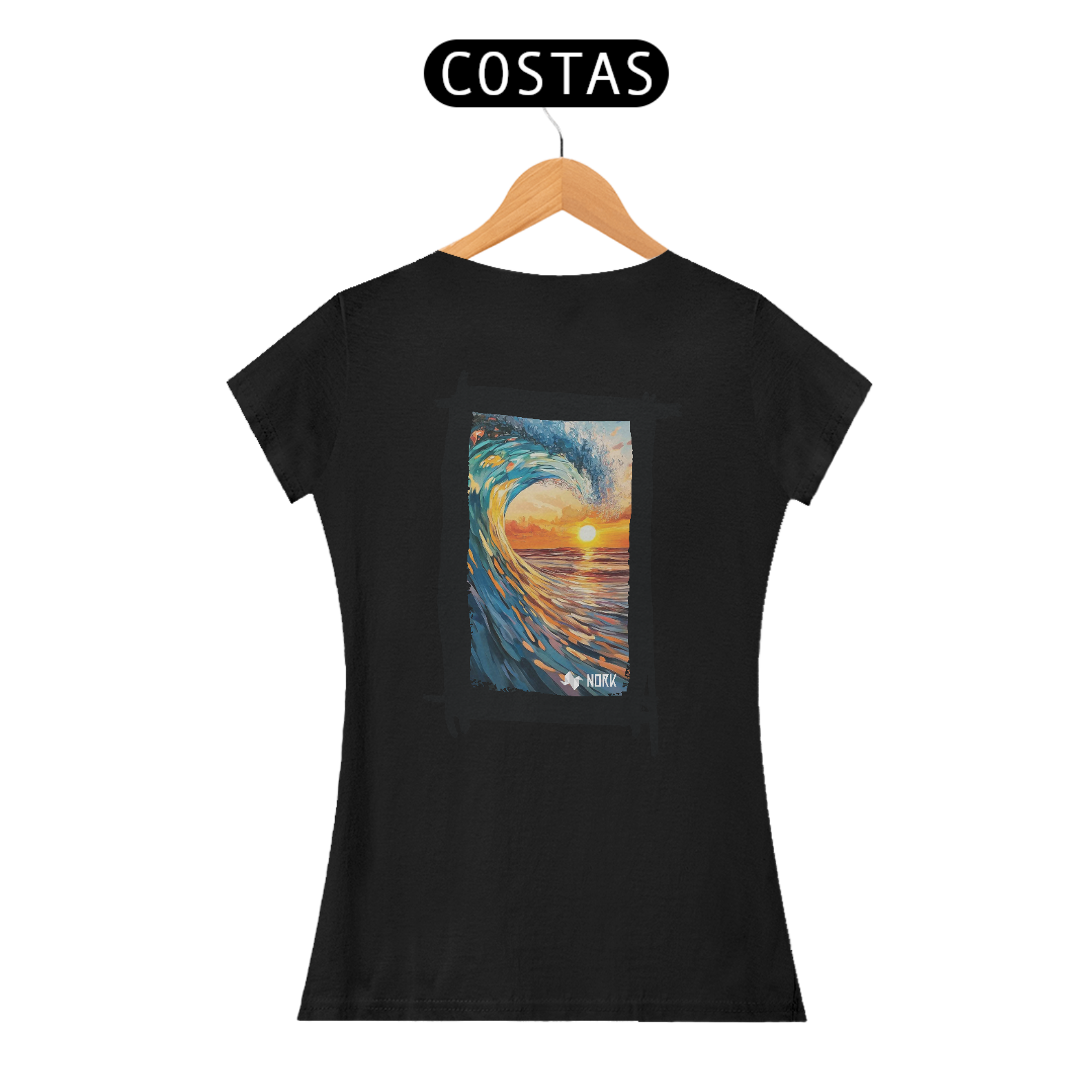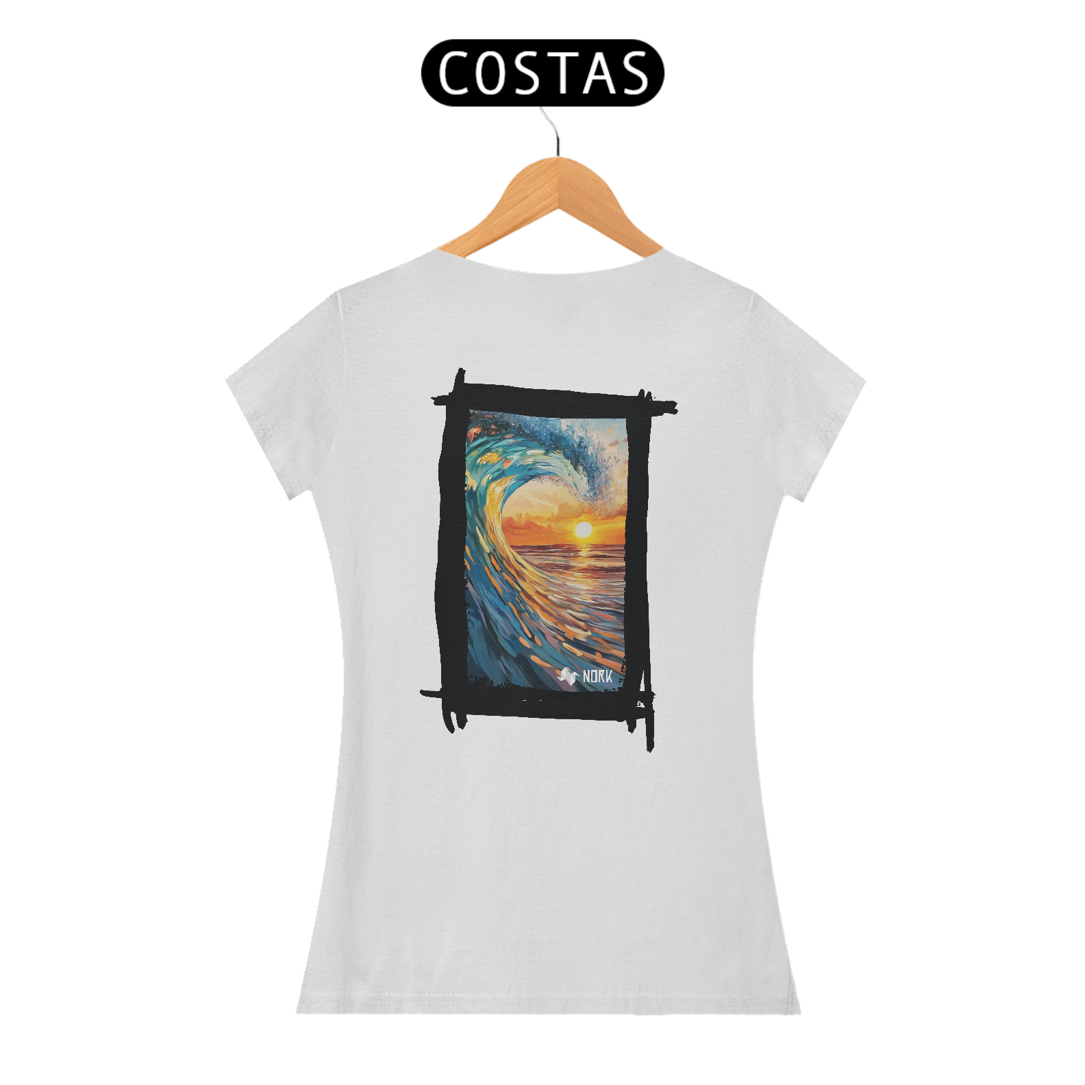A camisa exibe uma arte de impacto visual que une o dinamismo de uma onda poderosa com a tranquilidade de um pôr do sol no horizonte. A composição apresenta pinceladas que destacam os tons vibrantes de azul e verde da onda em contraste com os laranjas e amarelos intensos do céu e da água refletindo a luz do sol. O movimento capturado na formação da onda cria uma sensação de energia e fluidez, enquanto o pôr do sol ao fundo evoca calma e contemplação, simbolizando o equilíbrio entre força e serenidade. O logo da Nork aparece de forma discreta na parte inferior, reforçando a identidade da marca sem tirar o protagonismo da arte.