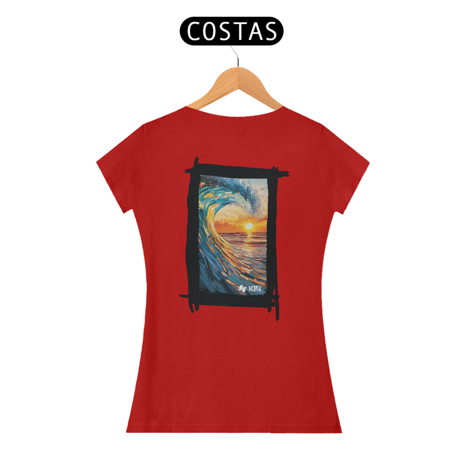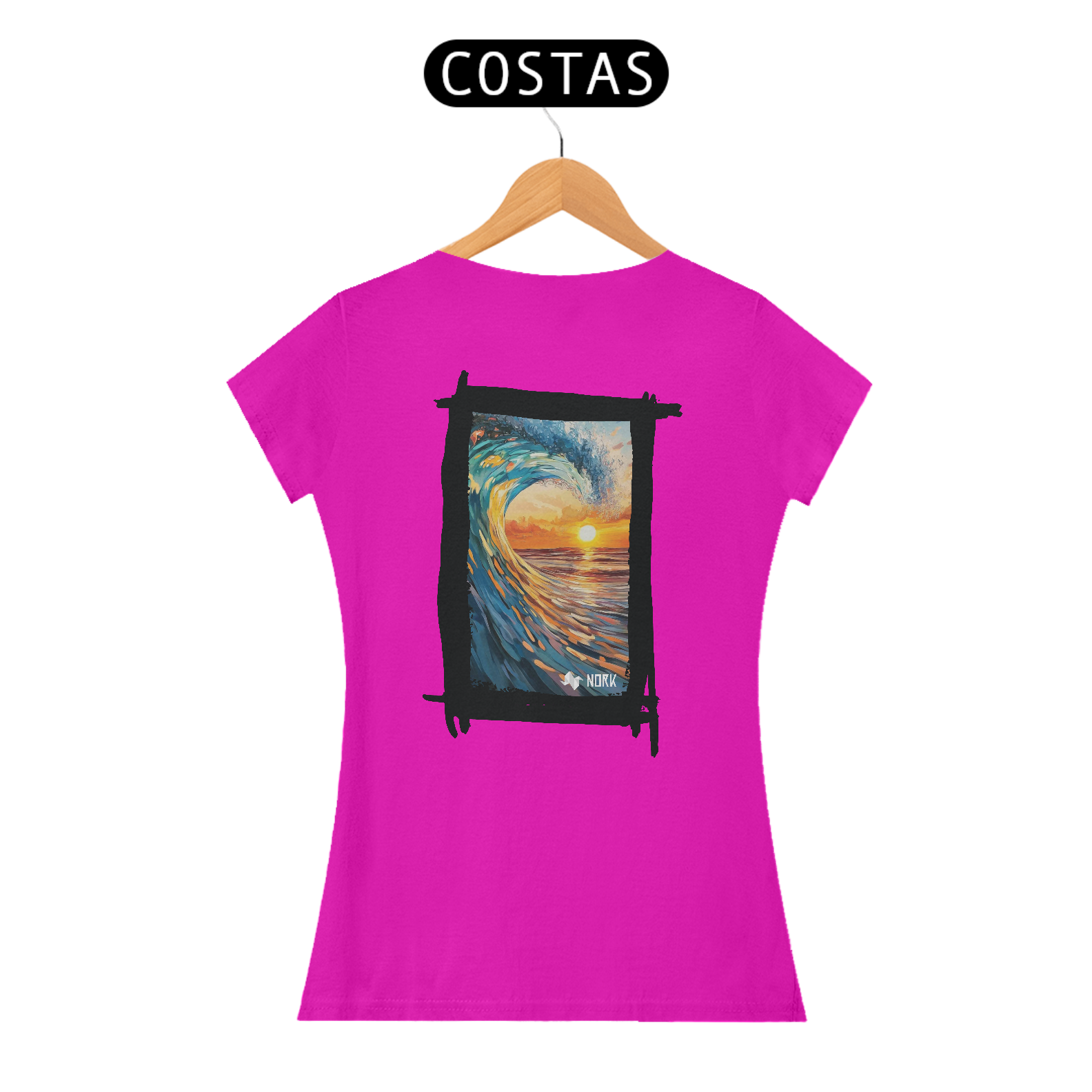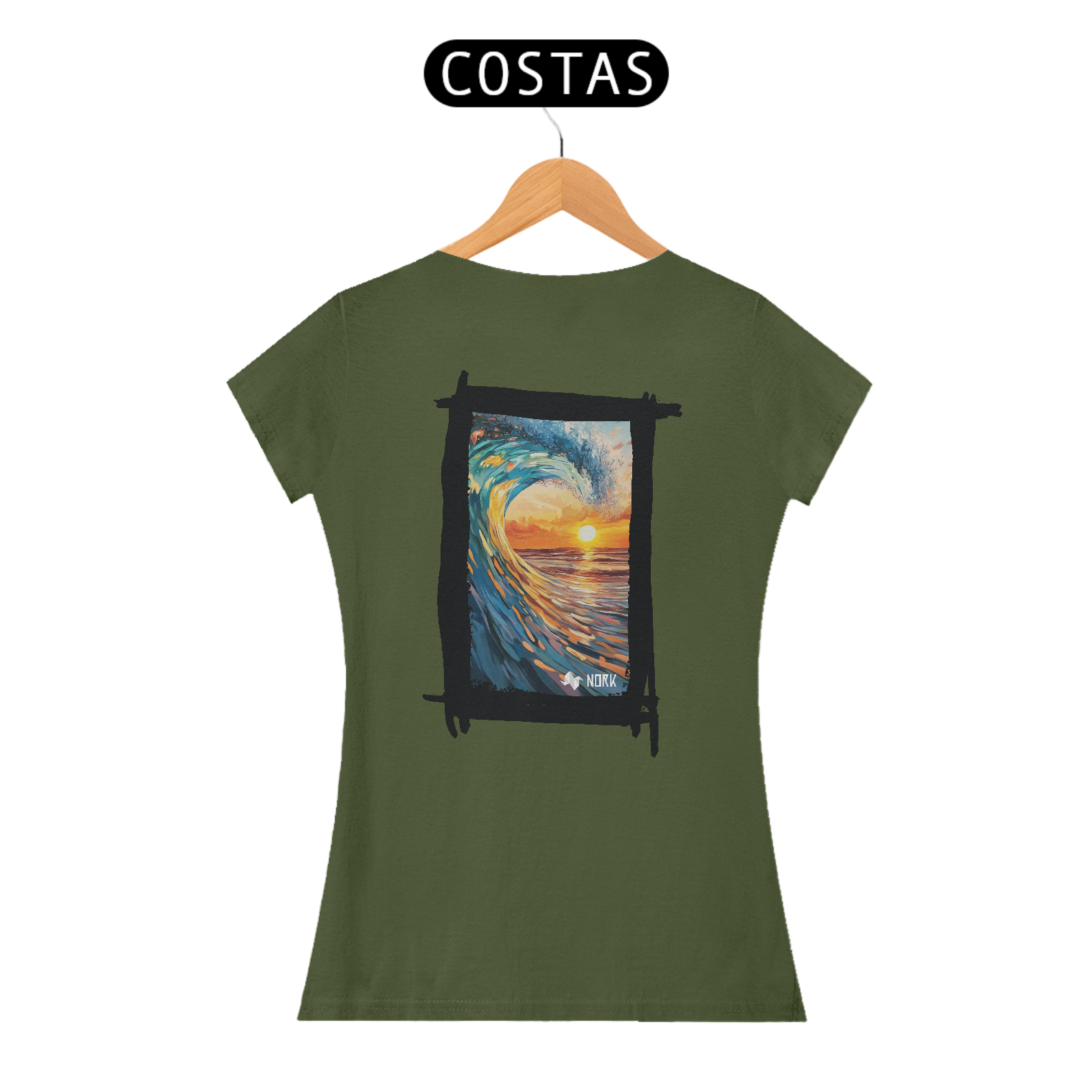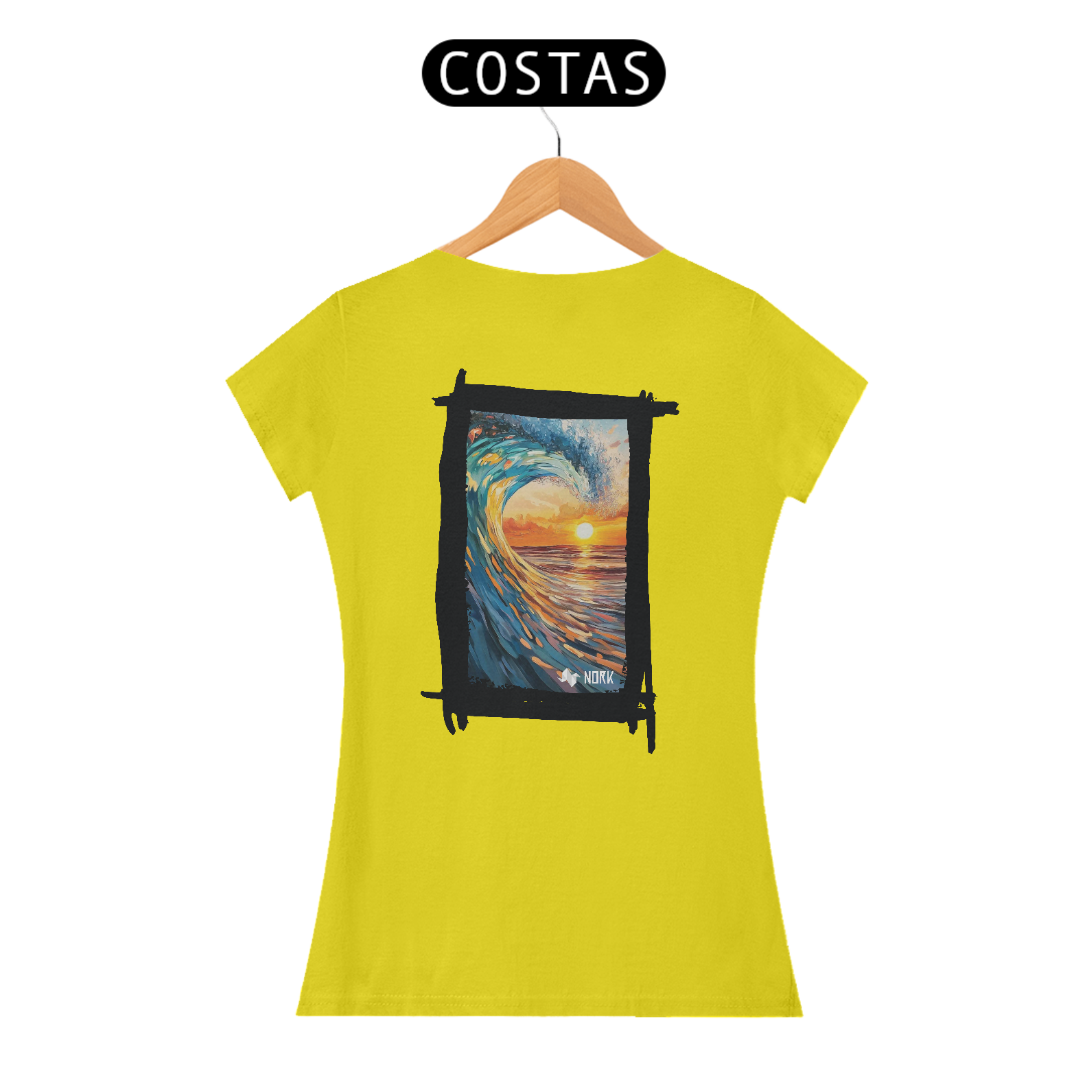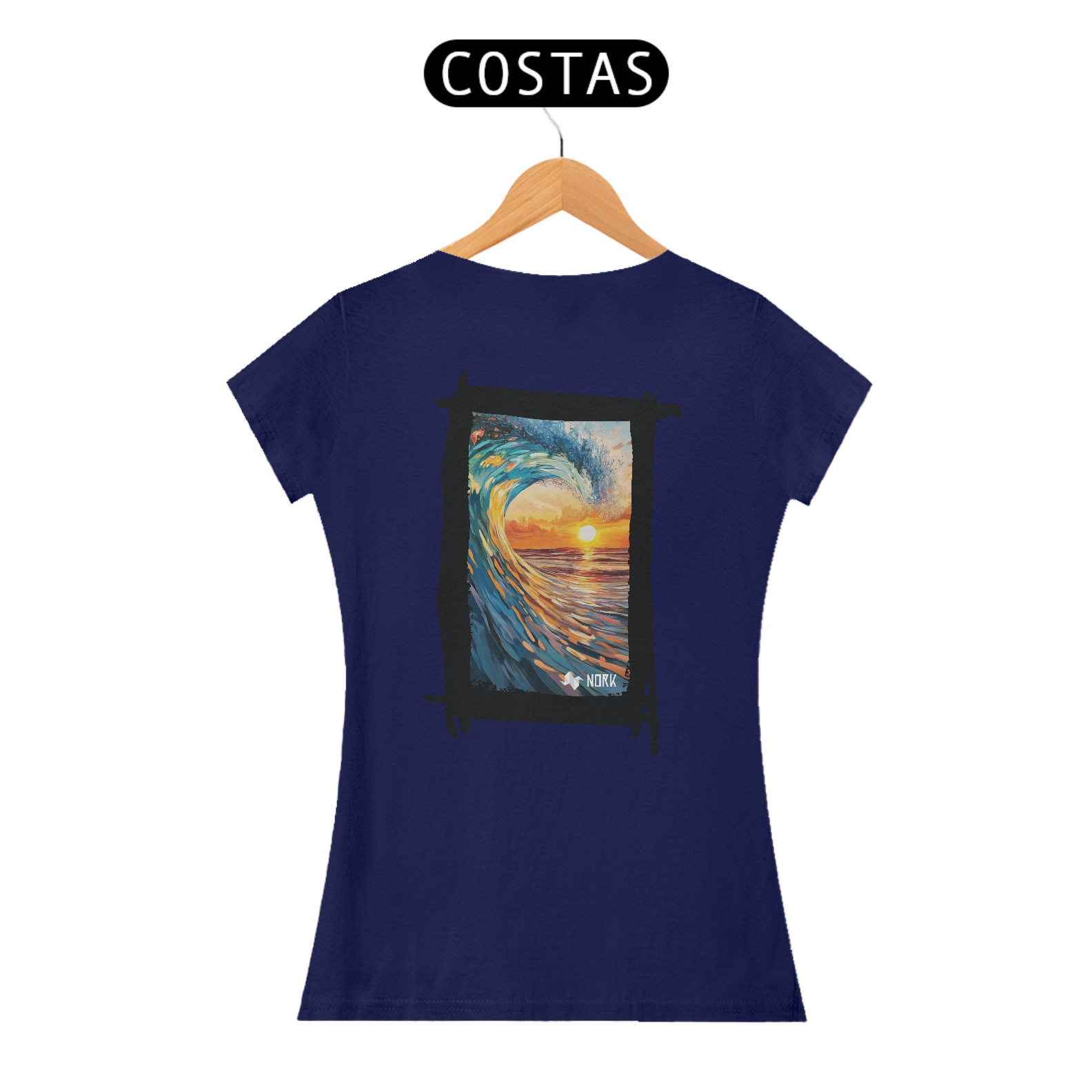 A camisa exibe uma arte de impacto visual que une o dinamismo de uma onda poderosa com a tranquilidade de um pôr do sol no horizonte. A composição apresenta pinceladas que destacam os tons vibrantes de azul e verde da onda em contraste com os laranjas e amarelos intensos do céu e da água refletindo a luz do sol. O movimento capturado na formação da onda cria uma sensação de energia e fluidez, enquanto o pôr do sol ao fundo evoca calma e contemplação, simbolizando o equilíbrio entre força e serenidade. O logo da Nork aparece de forma discreta na parte inferior, reforçando a identidade da marca sem tirar o protagonismo da arte.