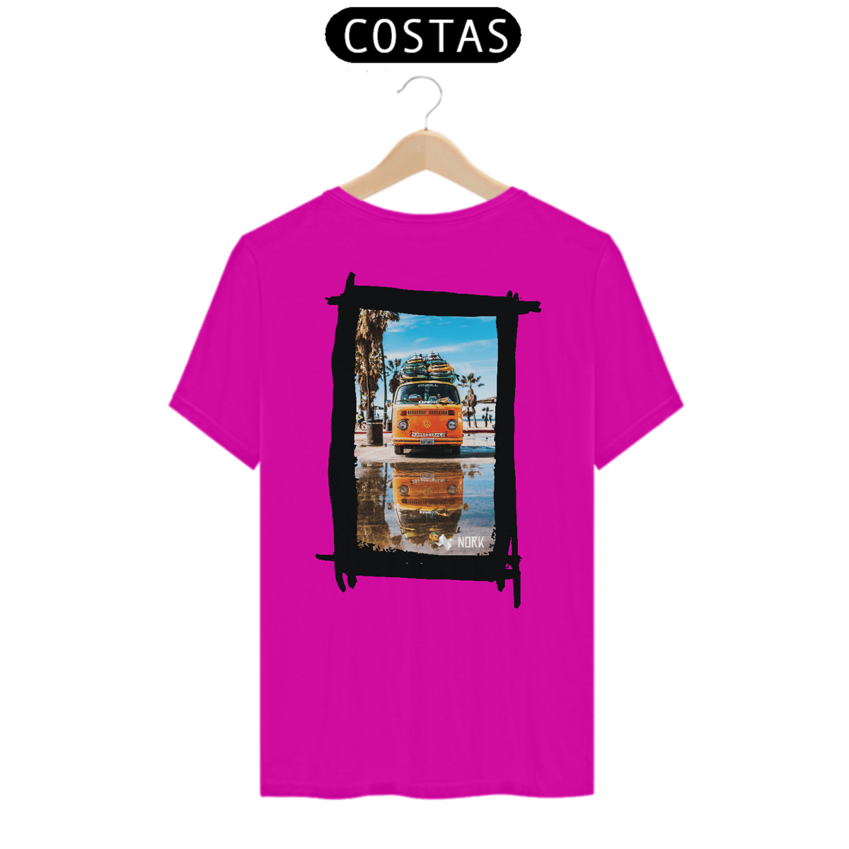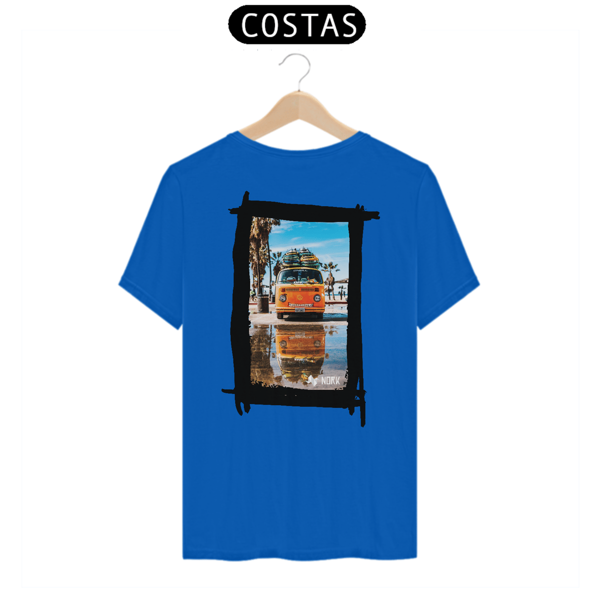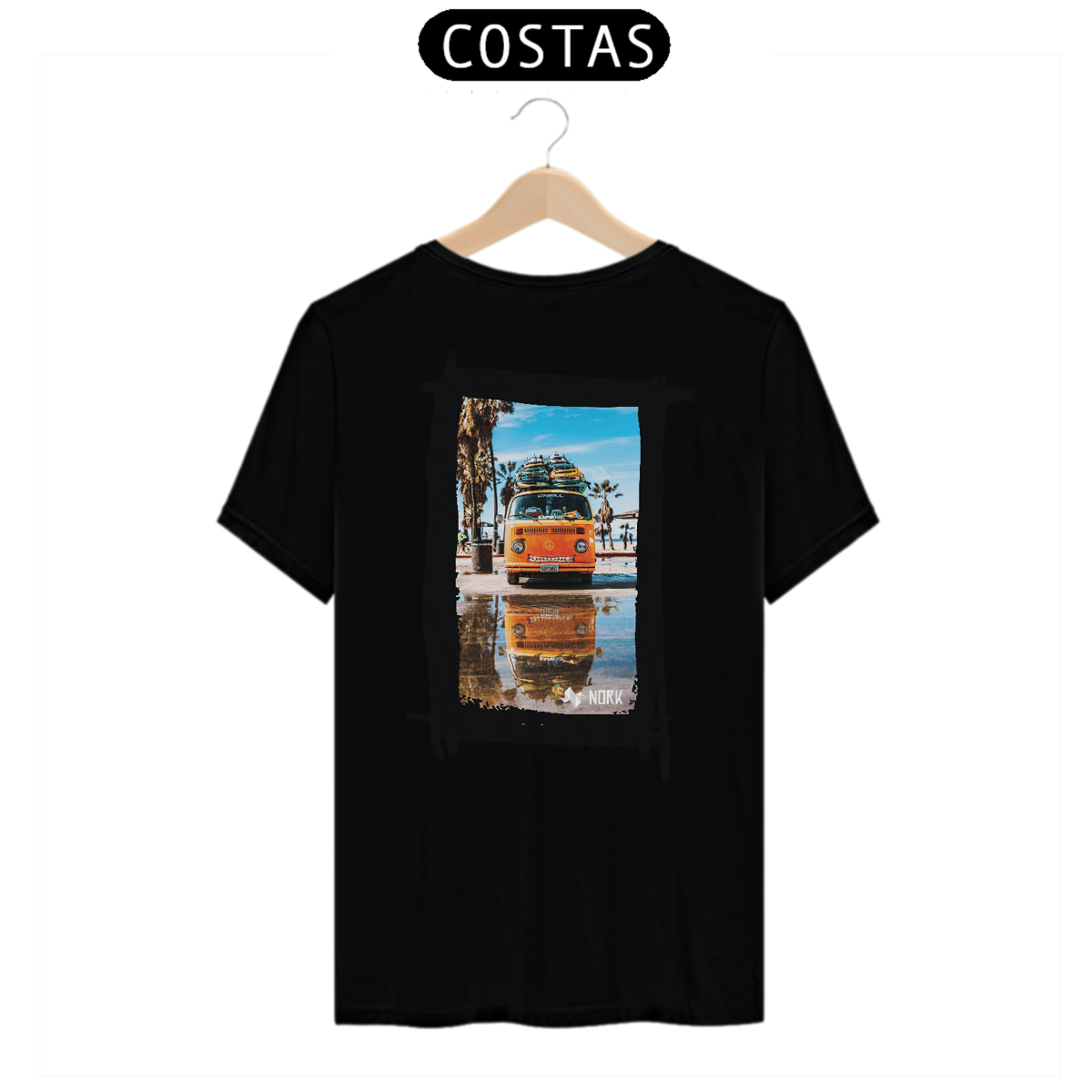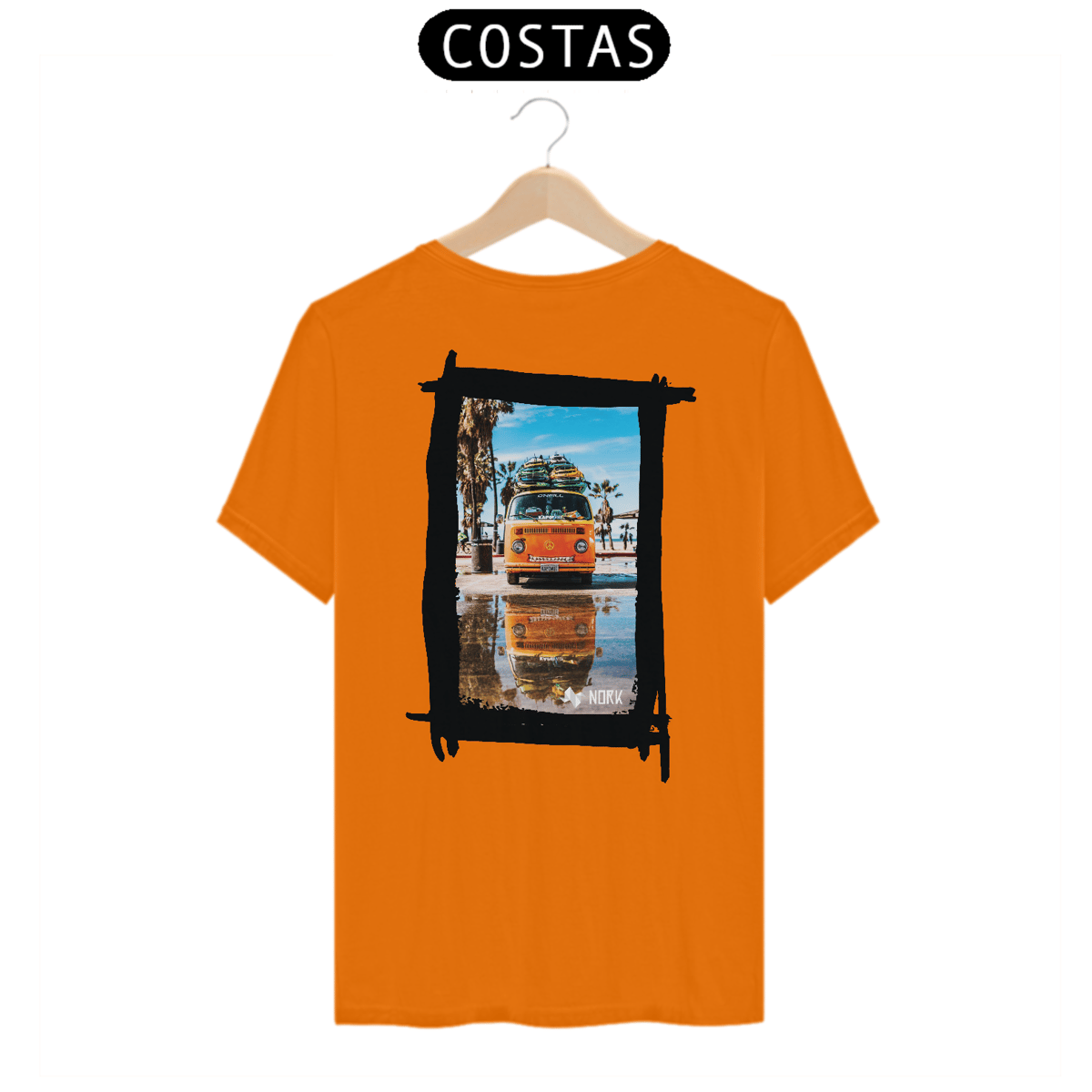 A camisa apresenta uma arte vibrante e descontraída, com uma van clássica de cor laranja brilhante carregada com pranchas de surfe no teto. O design remete ao espírito livre e à cultura do surfe, com palmeiras e um céu azul claro ao fundo, evocando a energia e a alegria de um dia ensolarado na praia. O reflexo da van em uma poça d'água no chão adiciona um elemento visual intrigante, criando simetria e profundidade na composição. O logo da Nork está posicionado discretamente na parte inferior, complementando o visual com um toque de sofisticação.