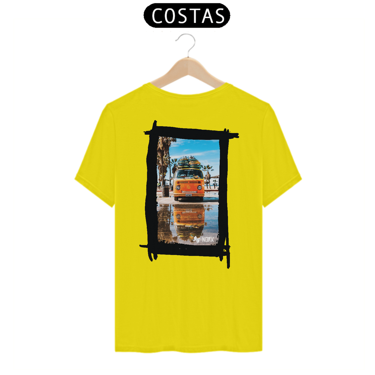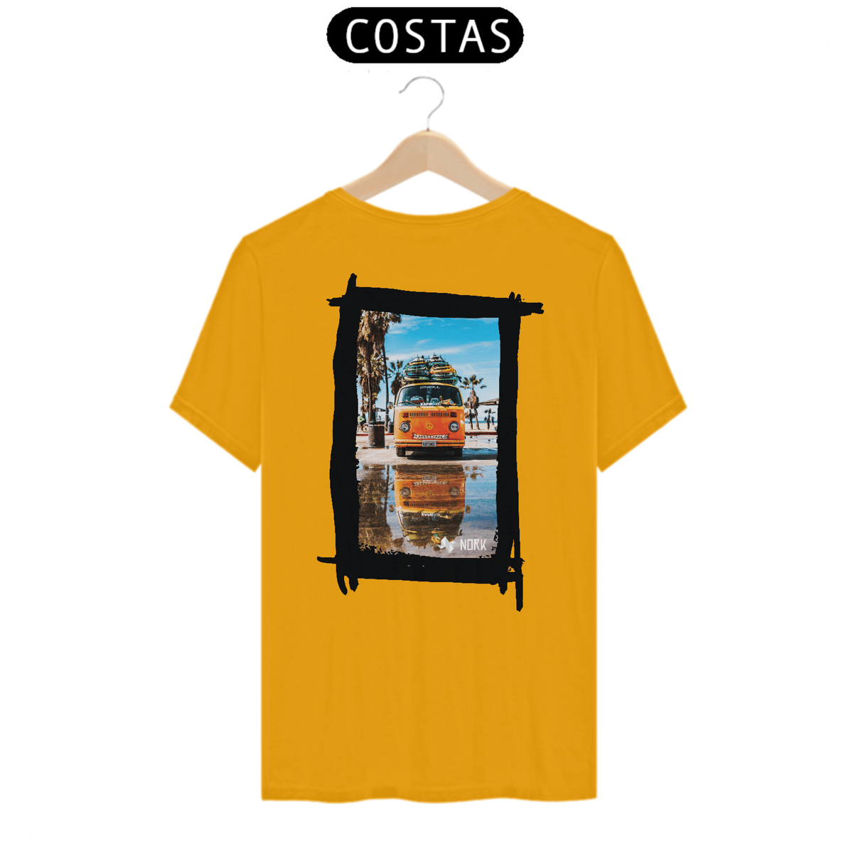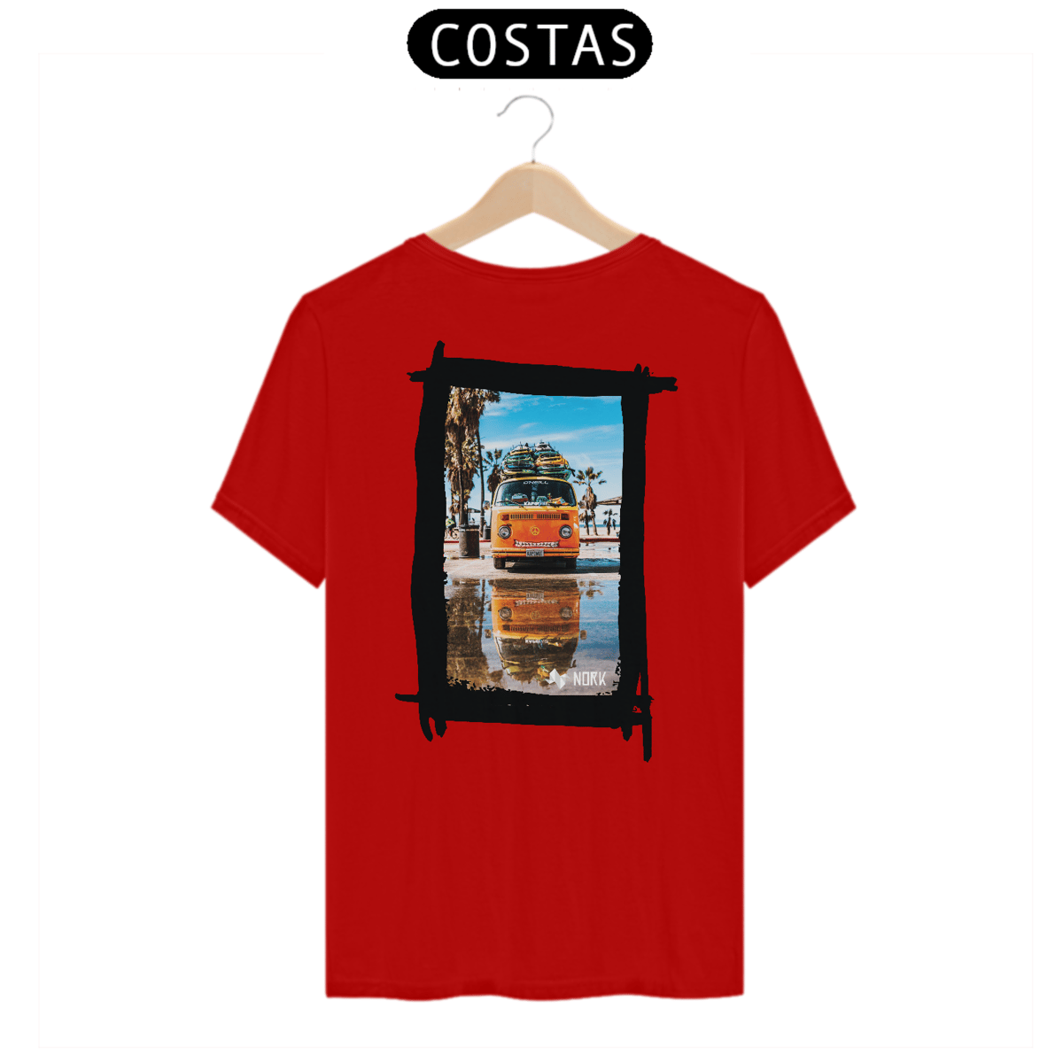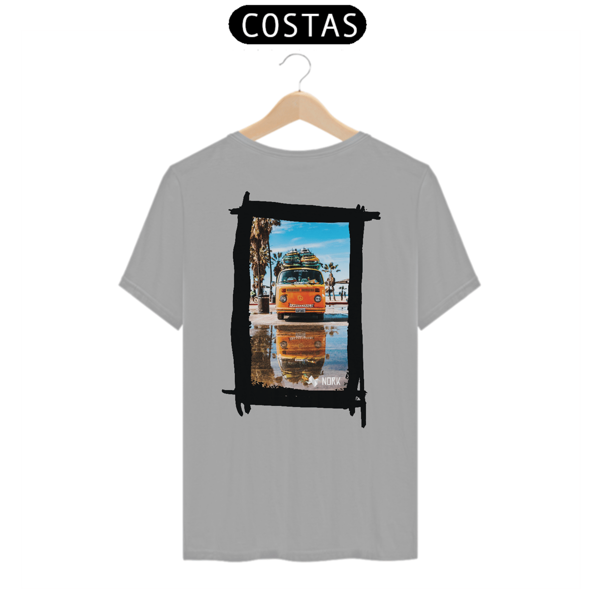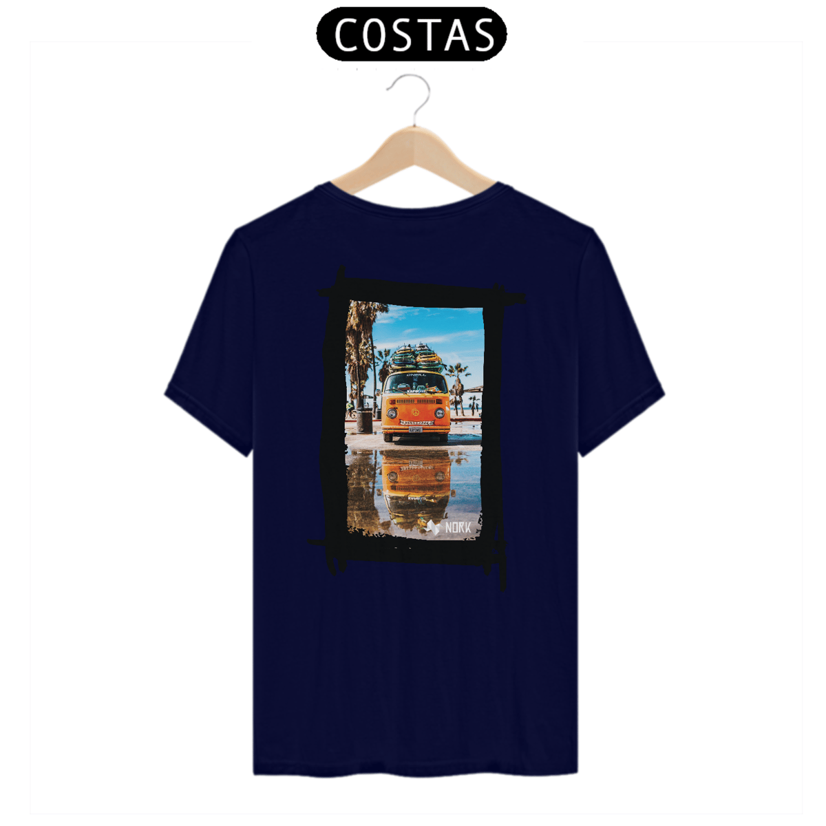 A camisa apresenta uma arte vibrante e descontraída, com uma van clássica de cor laranja brilhante carregada com pranchas de surfe no teto. O design remete ao espírito livre e à cultura do surfe, com palmeiras e um céu azul claro ao fundo, evocando a energia e a alegria de um dia ensolarado na praia. O reflexo da van em uma poça d'água no chão adiciona um elemento visual intrigante, criando simetria e profundidade na composição. O logo da Nork está posicionado discretamente na parte inferior, complementando o visual com um toque de sofisticação.